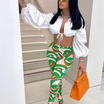 victoria’svogue Women Casual Two Piece Set Lace Up Long Lantern Sleeve Shirt Crop Top High Waist Leggings Pants 2021 Autumn Clothing