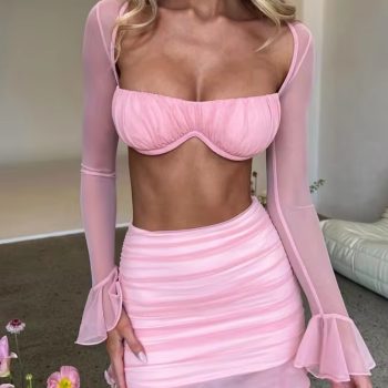 Victoria’s Vogue Mesh Sexy Dress Set Women Strapless Full Sleeve Crop Top And Mini Skirt Matching Sets Female Club Party Two Piece Set