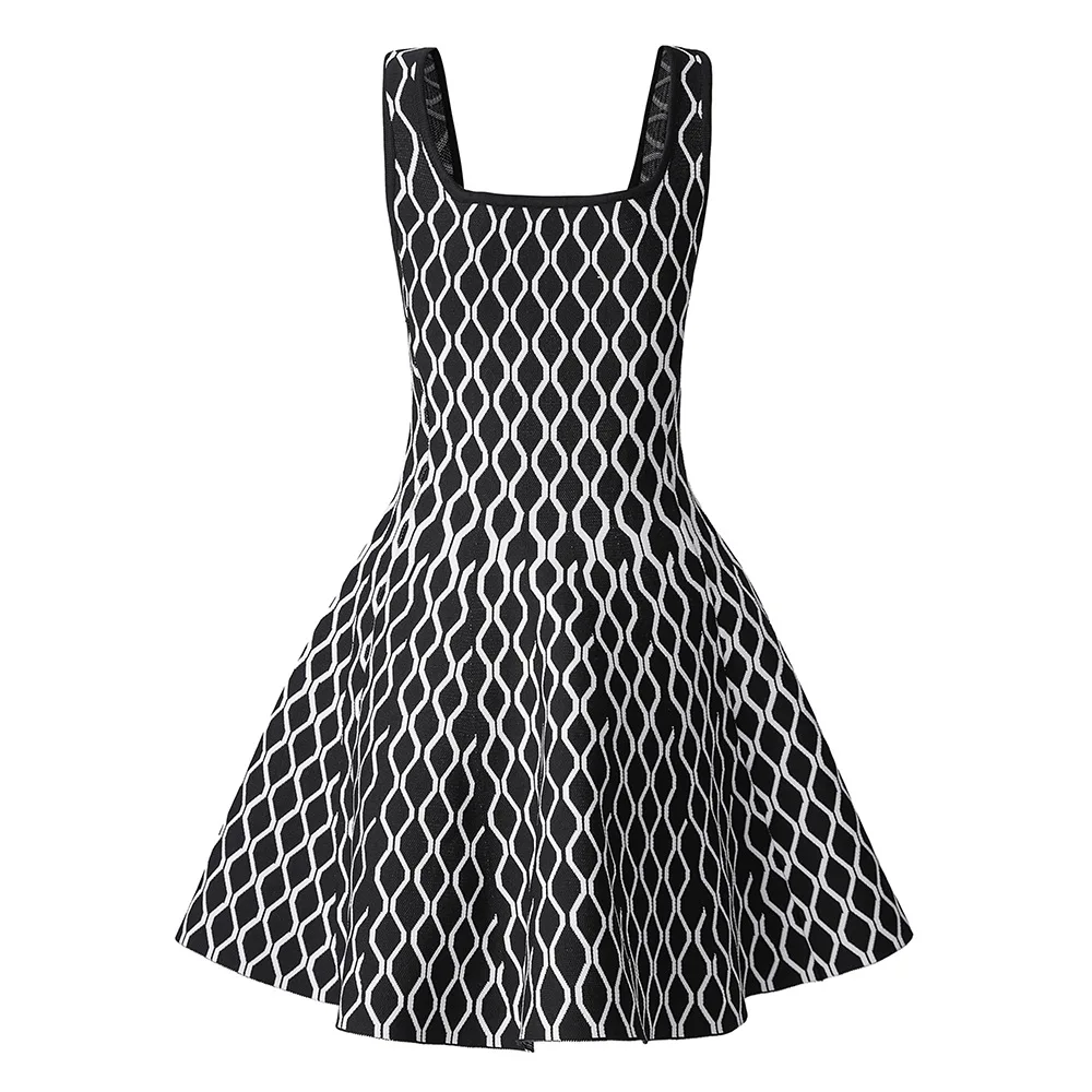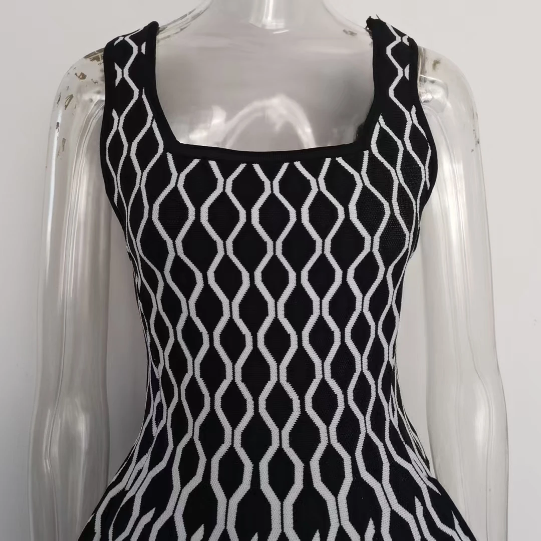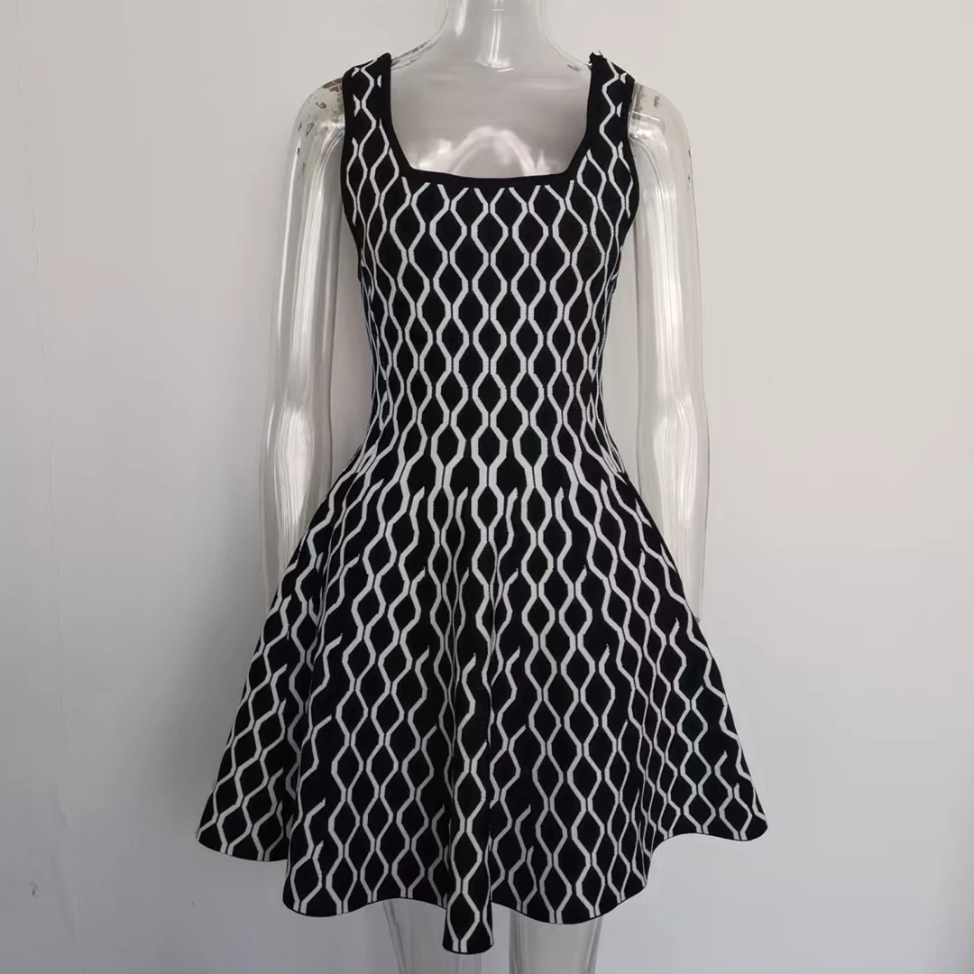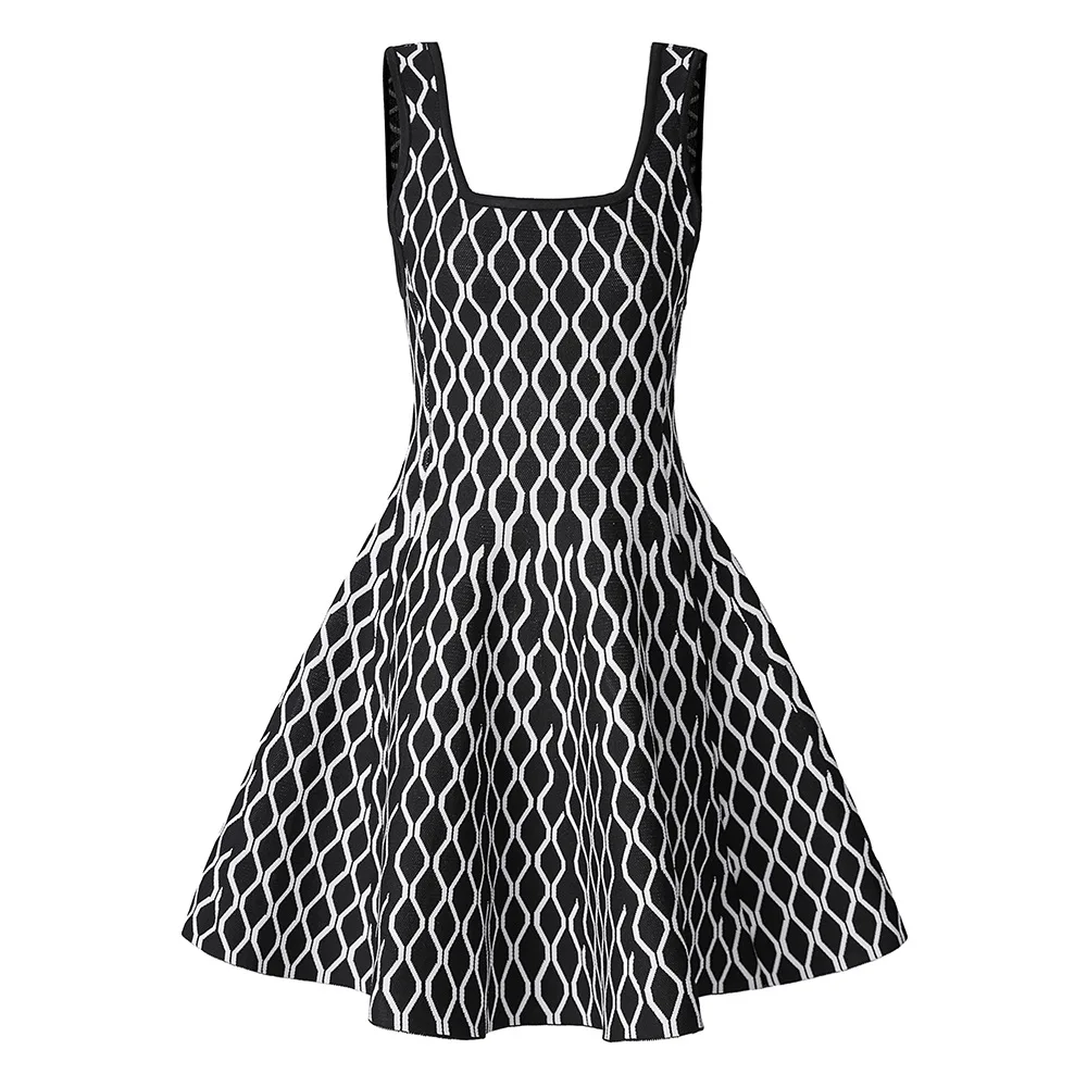 Victoria’s Vouge 2025 High Quality Jacquard Vintage Style Lady Spring Sleeveless Square Collar Wear Women Mini Short Knitted A-line Dress