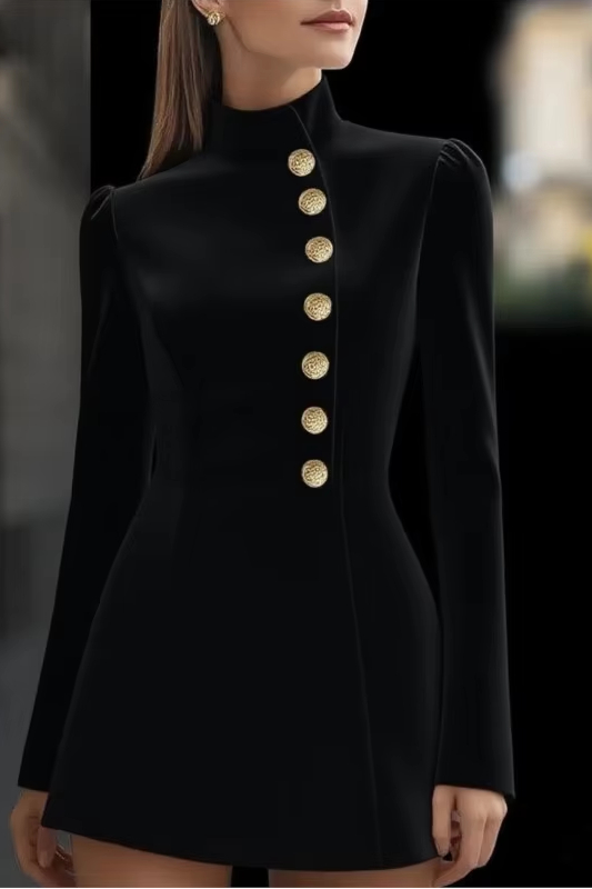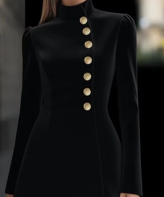 Victoria’s Vogue Autumn Women Dress Fashion Temperament Slim Solid Color Long-sleeved Stand-up Collar Single-breasted Short Dress Femal