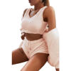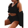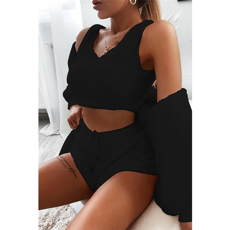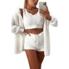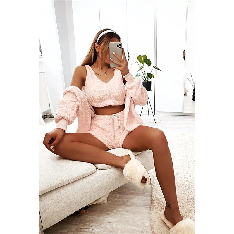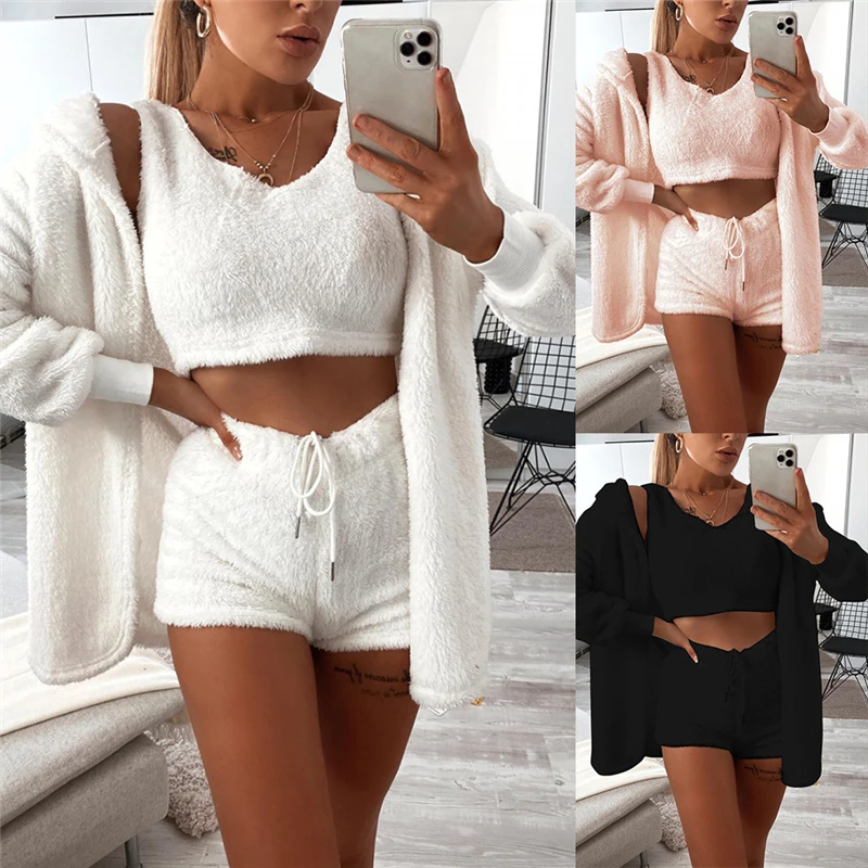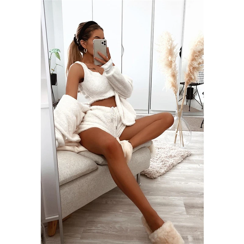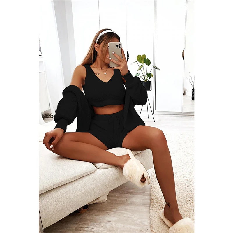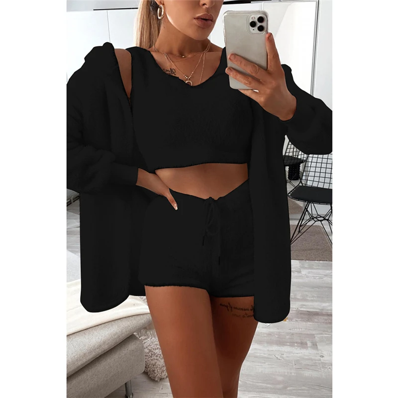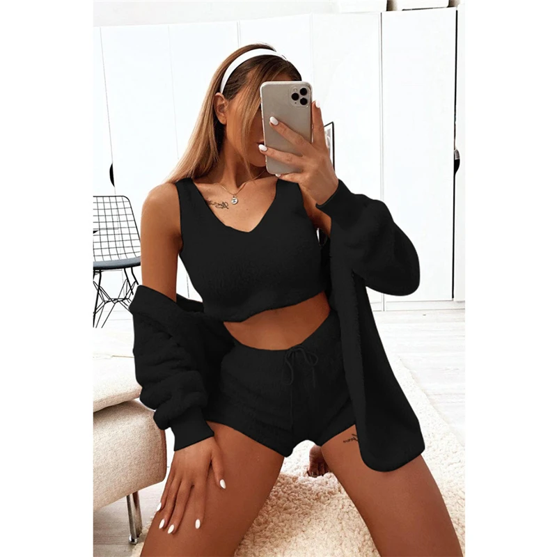 victoria’svogue Fall Winter Women Home Plush Suit 3 Piece Set Tank Crop Top Shorts Long Sleeve Cardigan Coat Casual Outfits