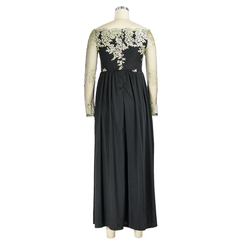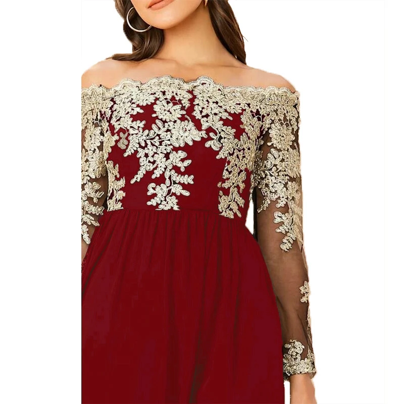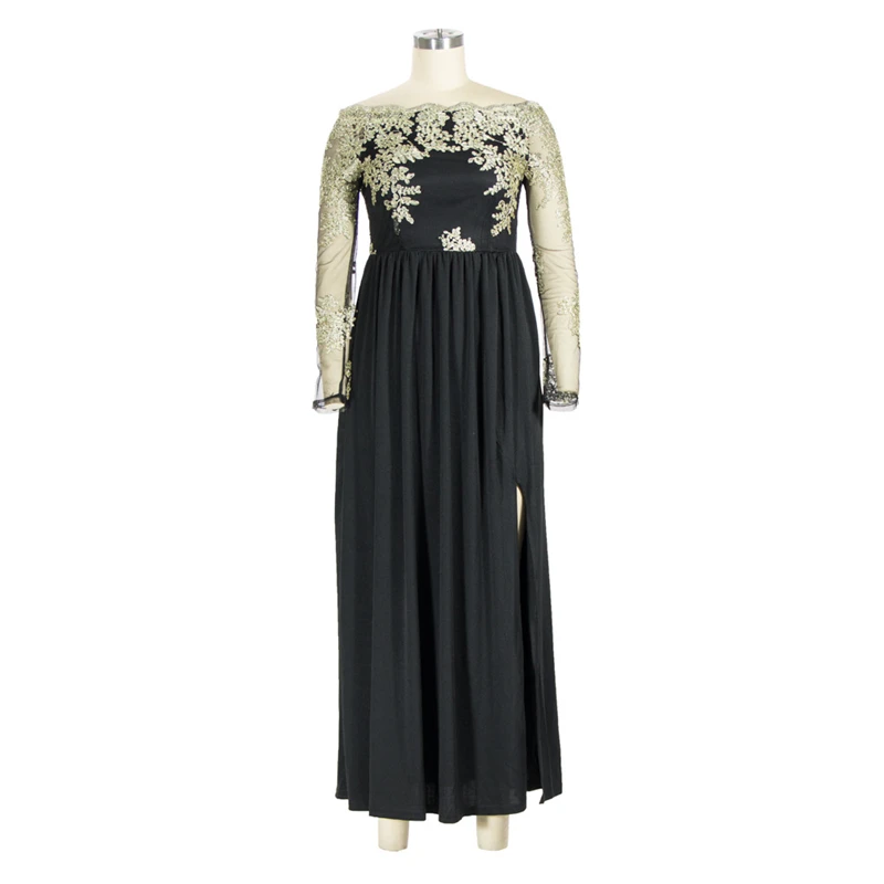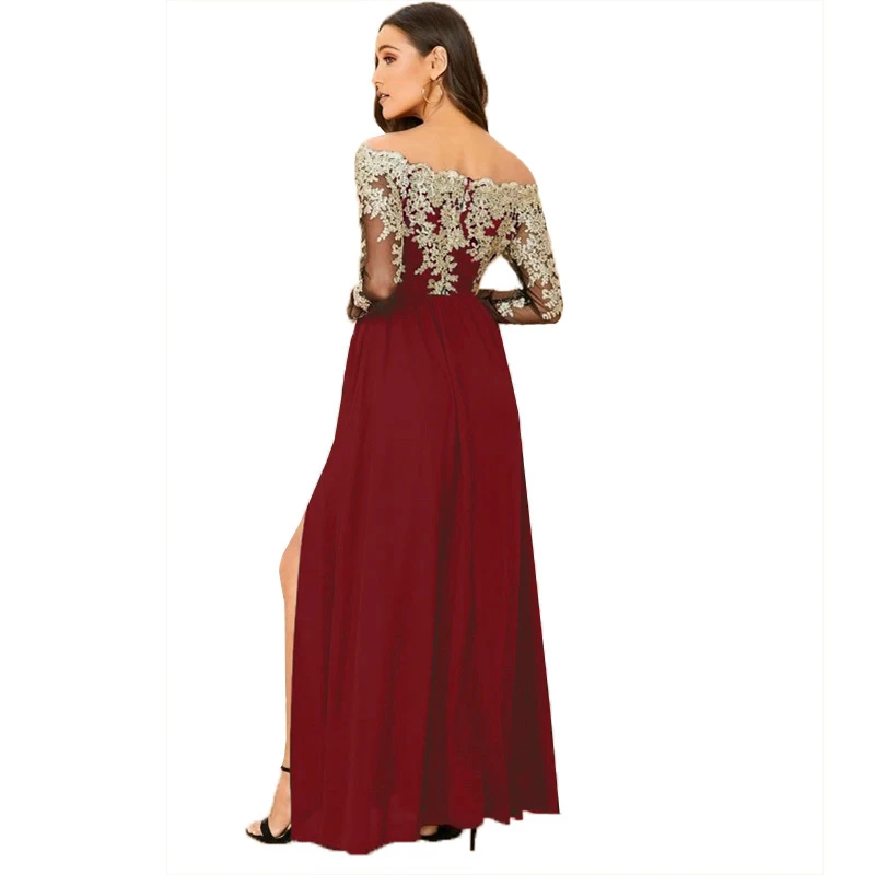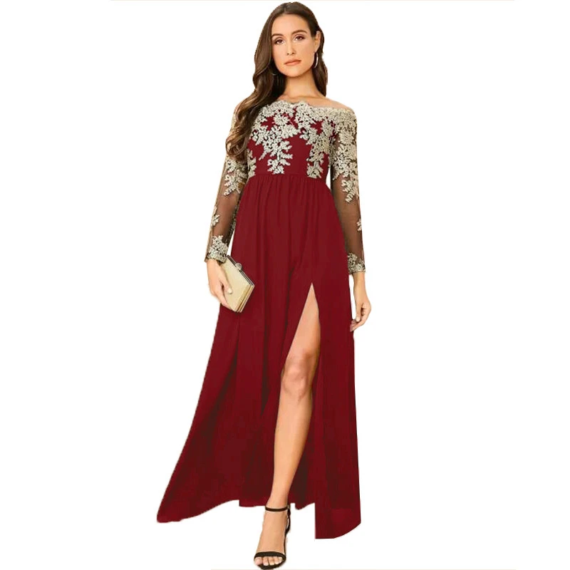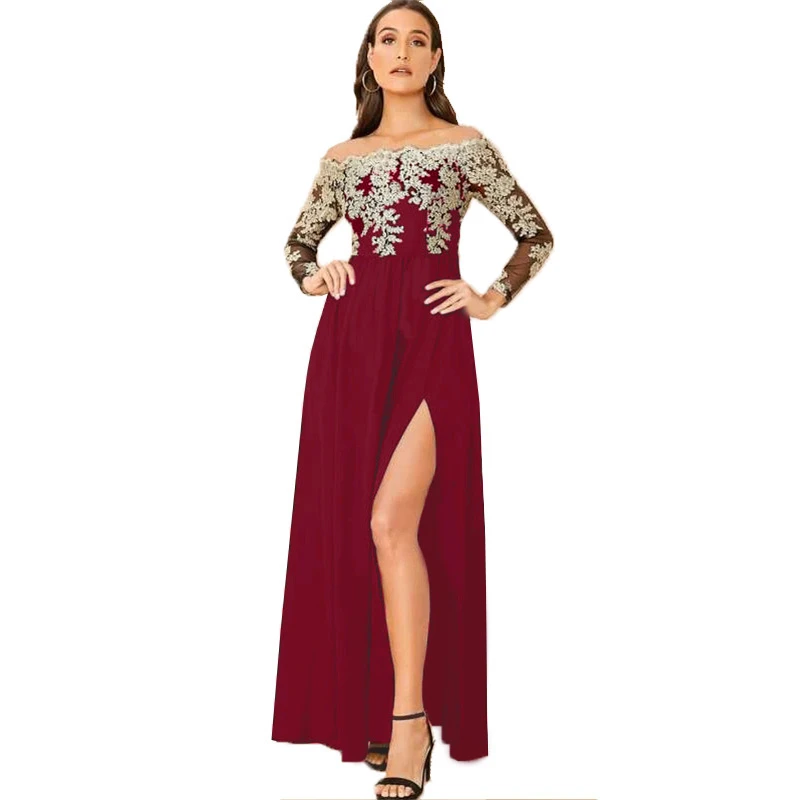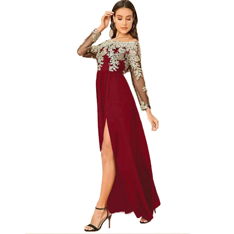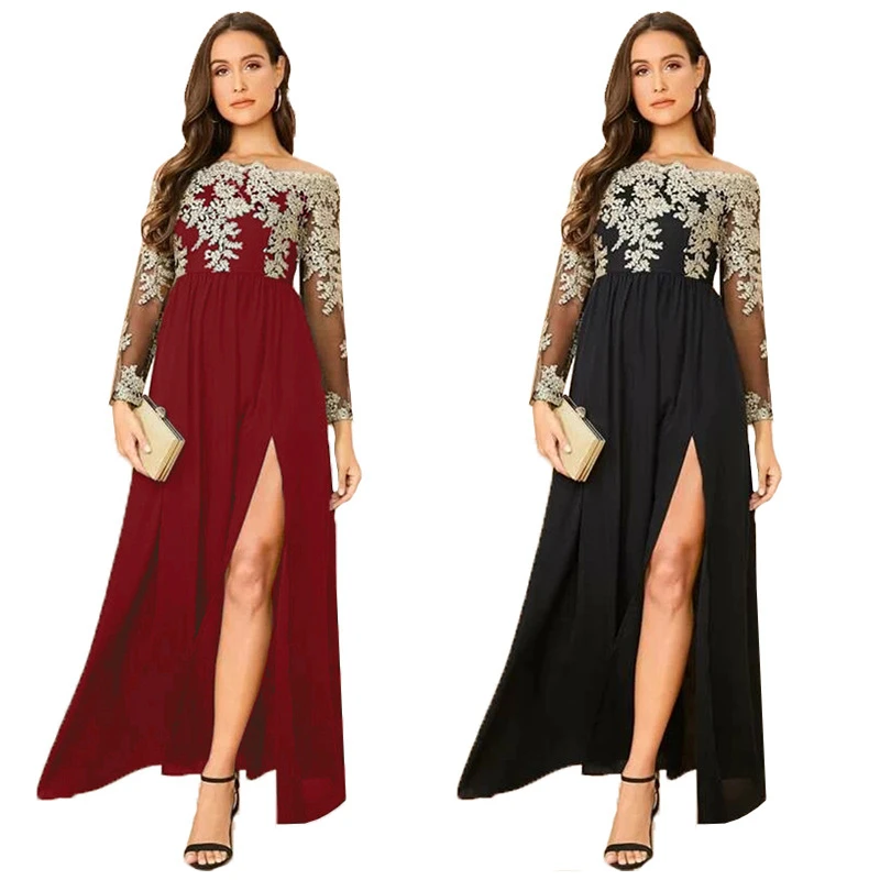 victoria’svogue 2021 Spring Lace Embroidery High Slit Maxi Party Dress Elegant Women Sexy Off Shoulder Sheer Mesh Long Sleeve Club Dress