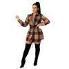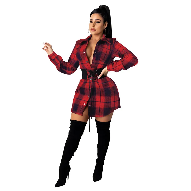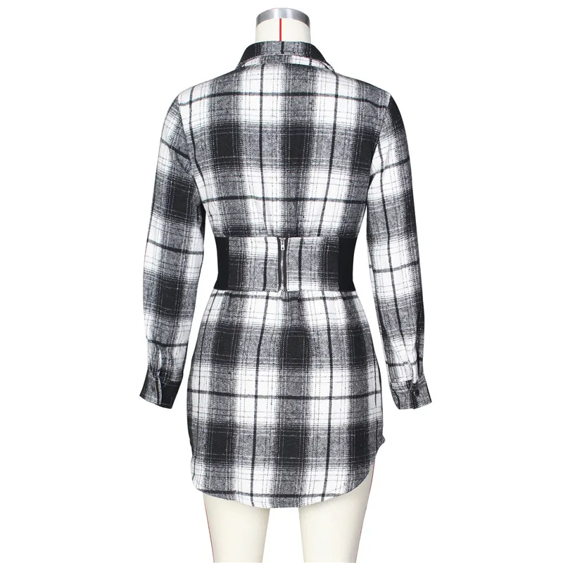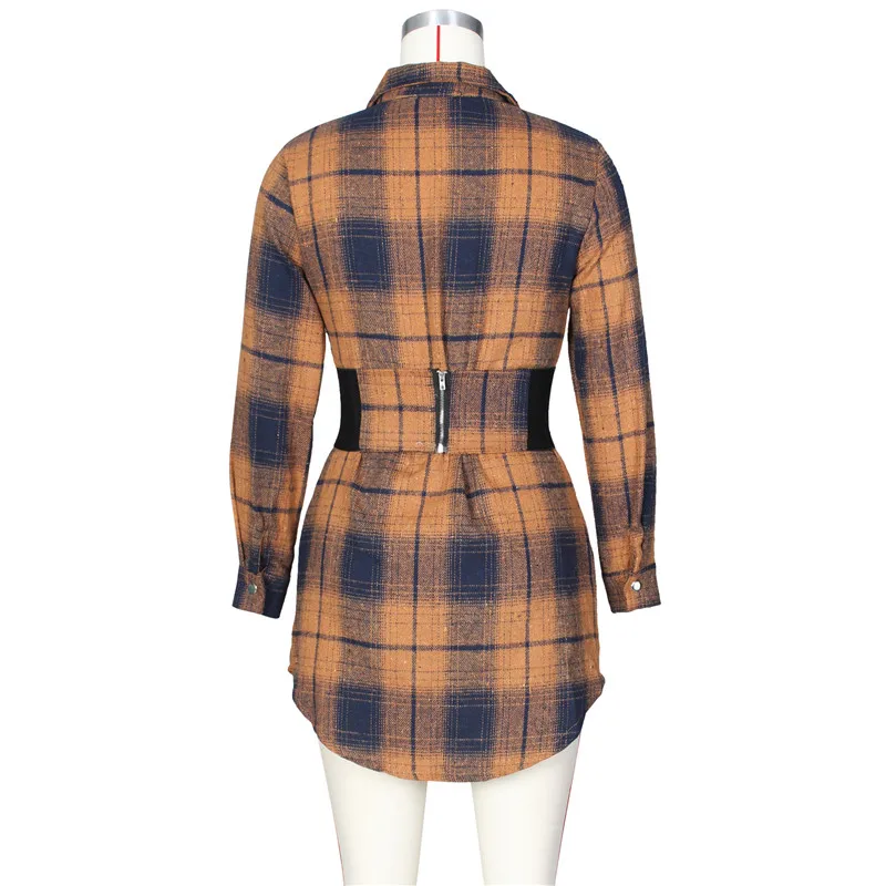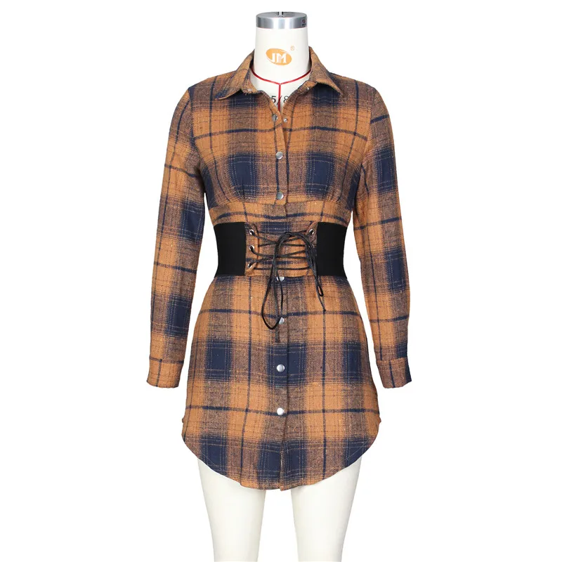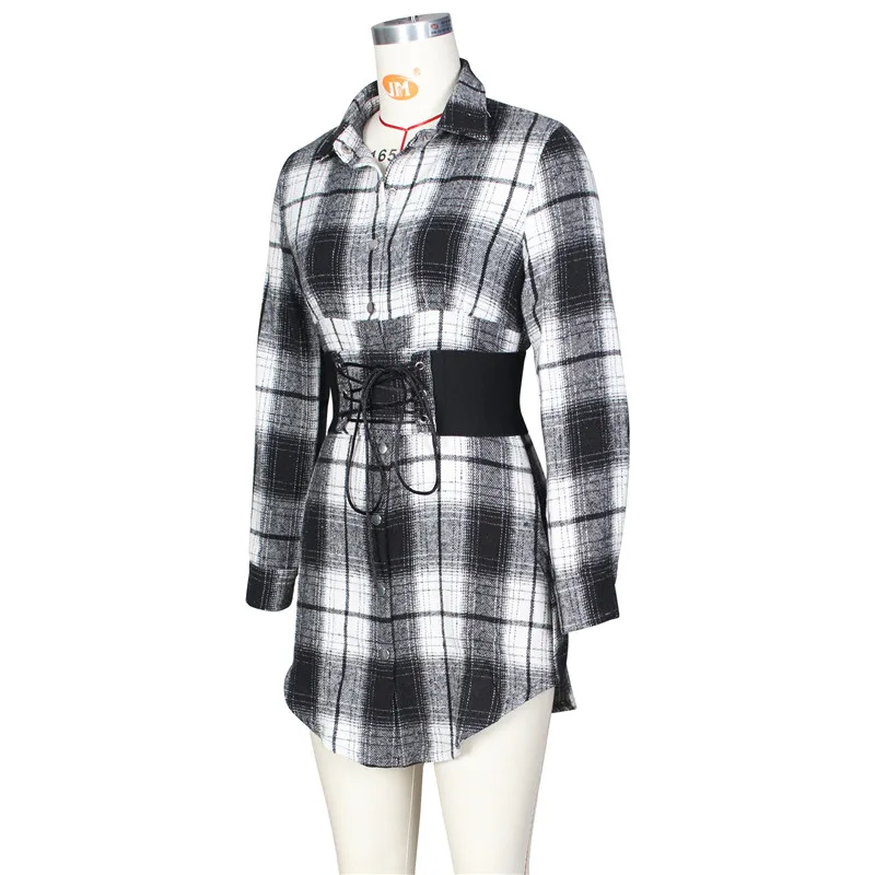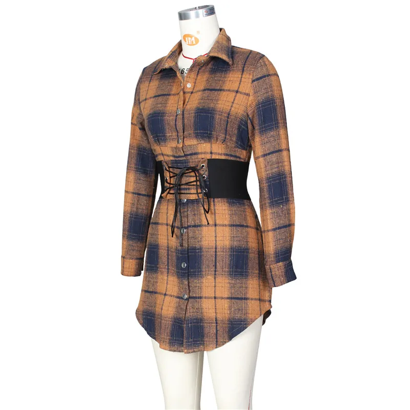 victoria’svogue 2021 Sprint Women Plaid Shirt Dress with Waistband Corset Turn Down Collar Long Sleeve Mini Casual Vestidos Clothing