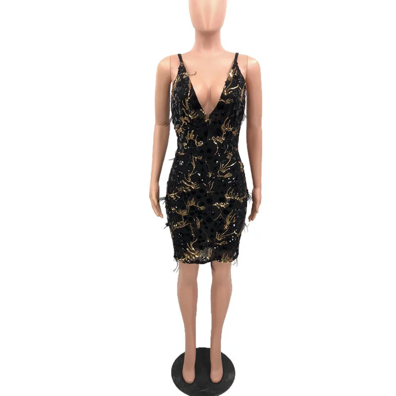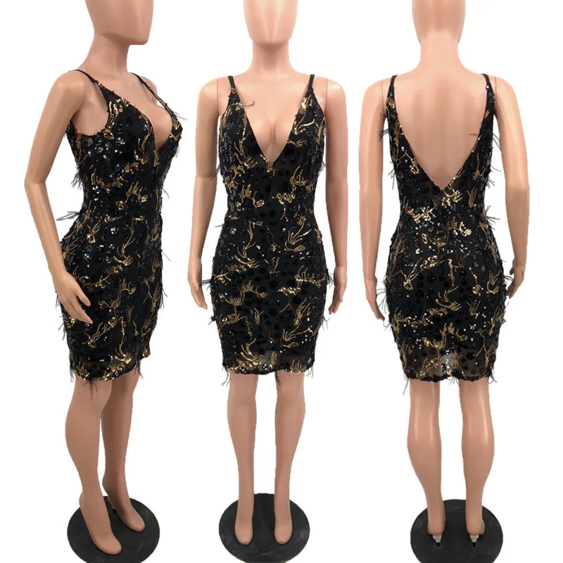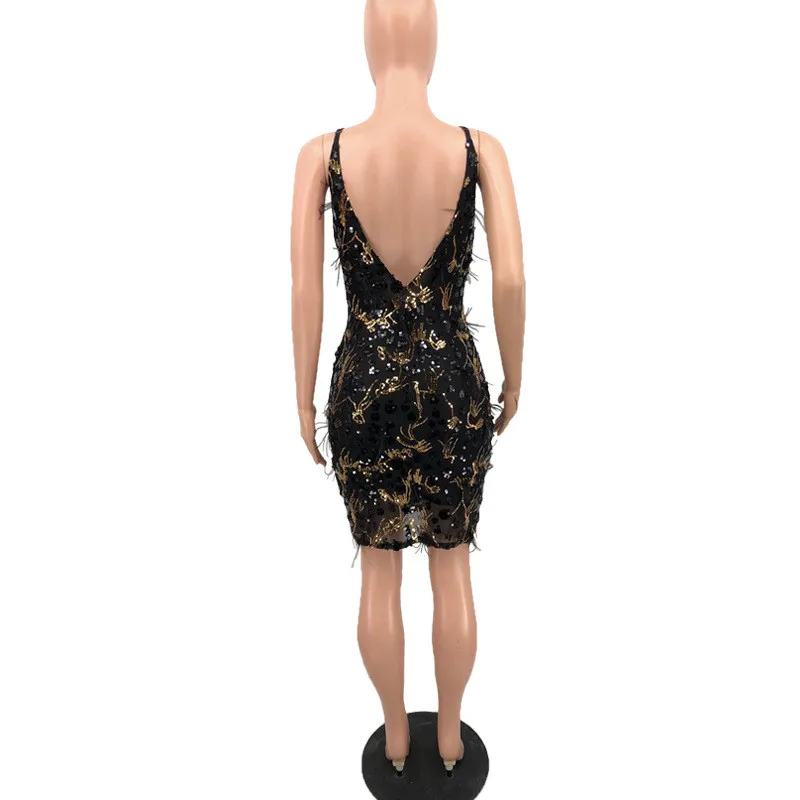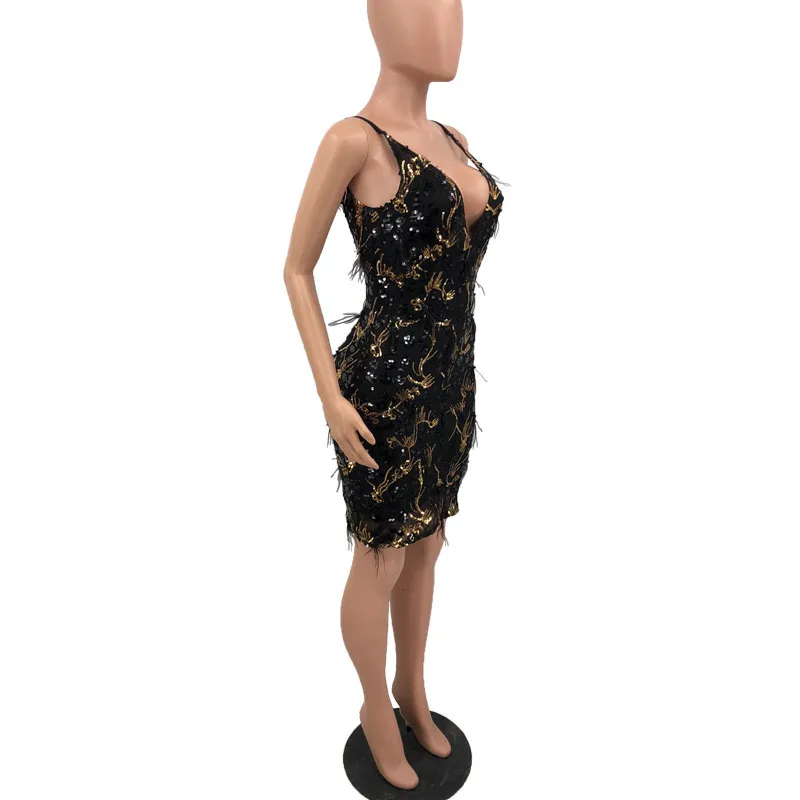 victoria’svogue 2021 Beaded Feather Sequins Spaghetti Straps Dress Women Sexy Deep V Neck Sleeveless Backless Bodycon Mini Club Party Dress
