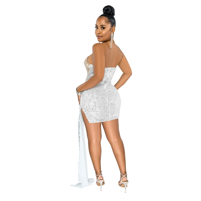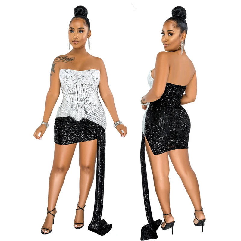 victoria’svogue Color Patchwork Diamonds Sequins Strapless Party Dress Women Fashion Sexy Backless Ribbon Bodycon Mini Club Vestidos