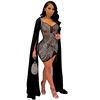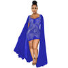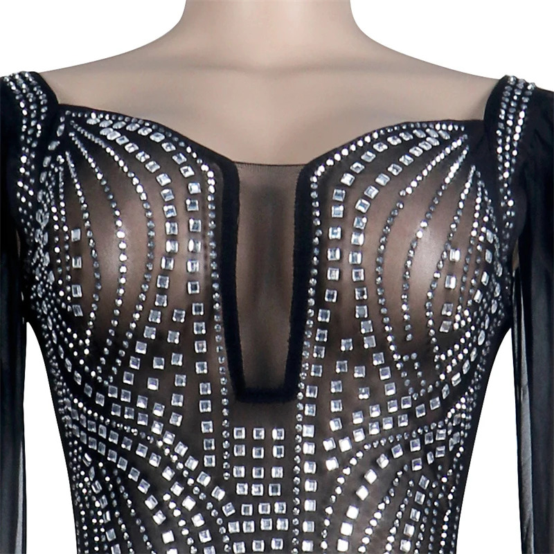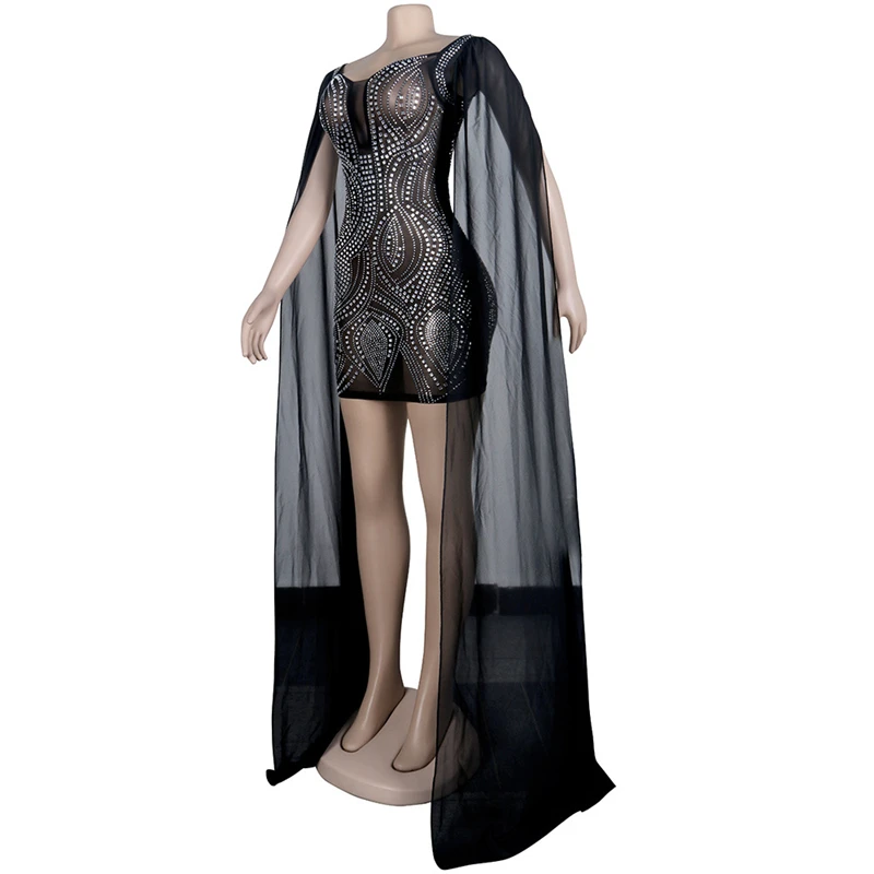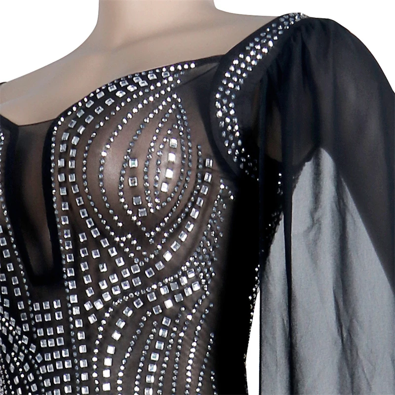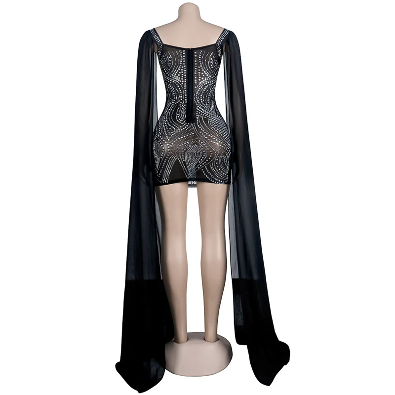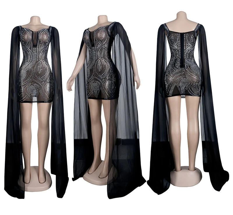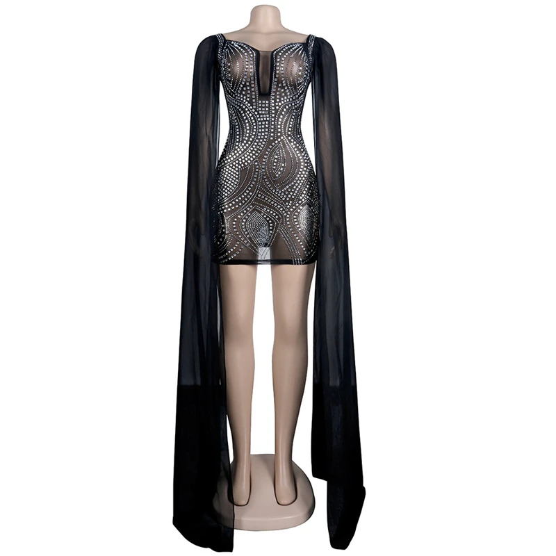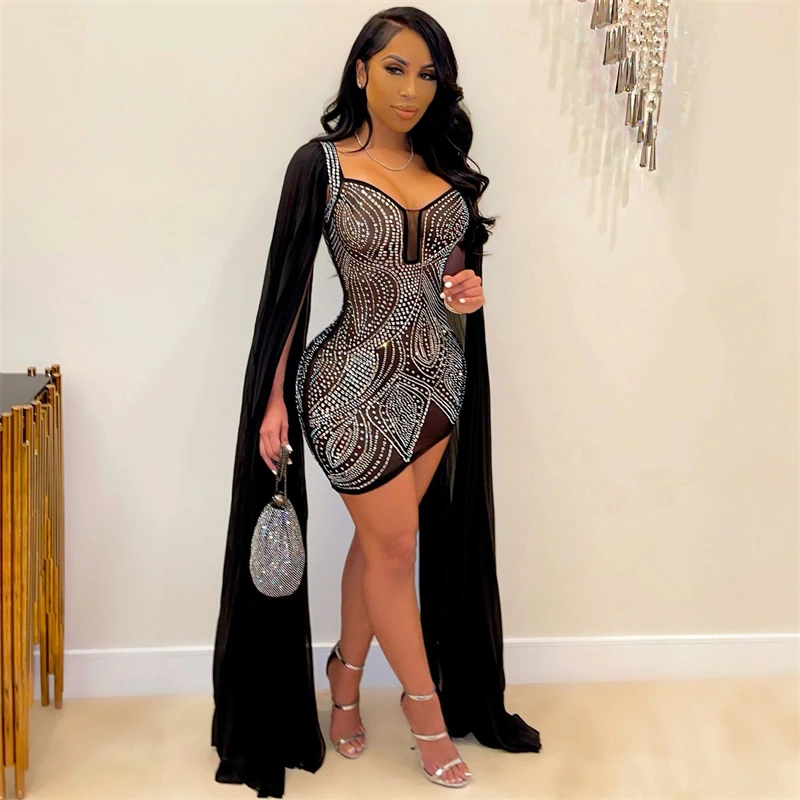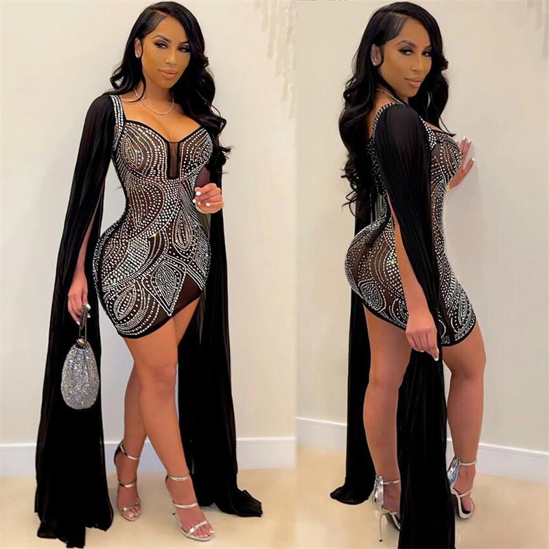 victoria’svogue Diamonds Sheer Mesh Shawl Dress Women Sexy V Neck Long Sleeve Bodycon Mini Night Club Birthday Party Dresses Vestidos