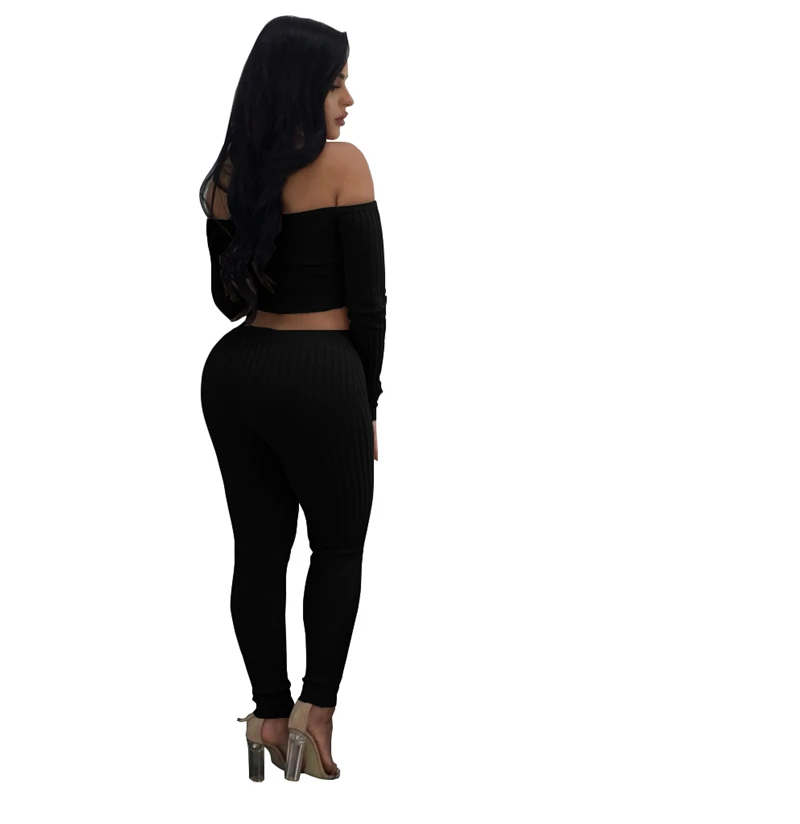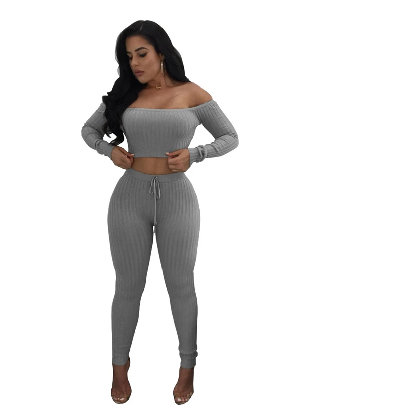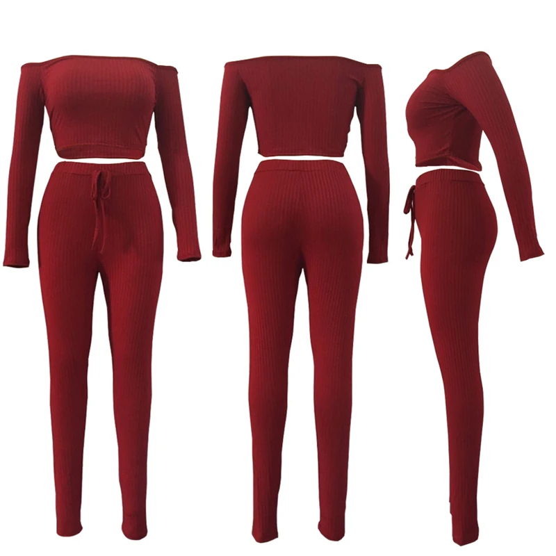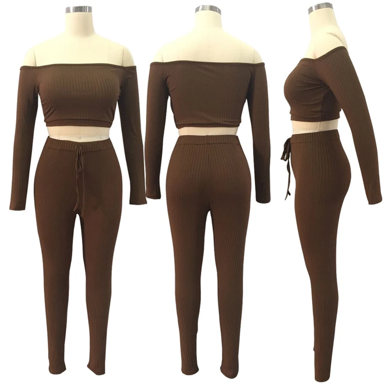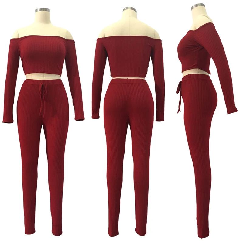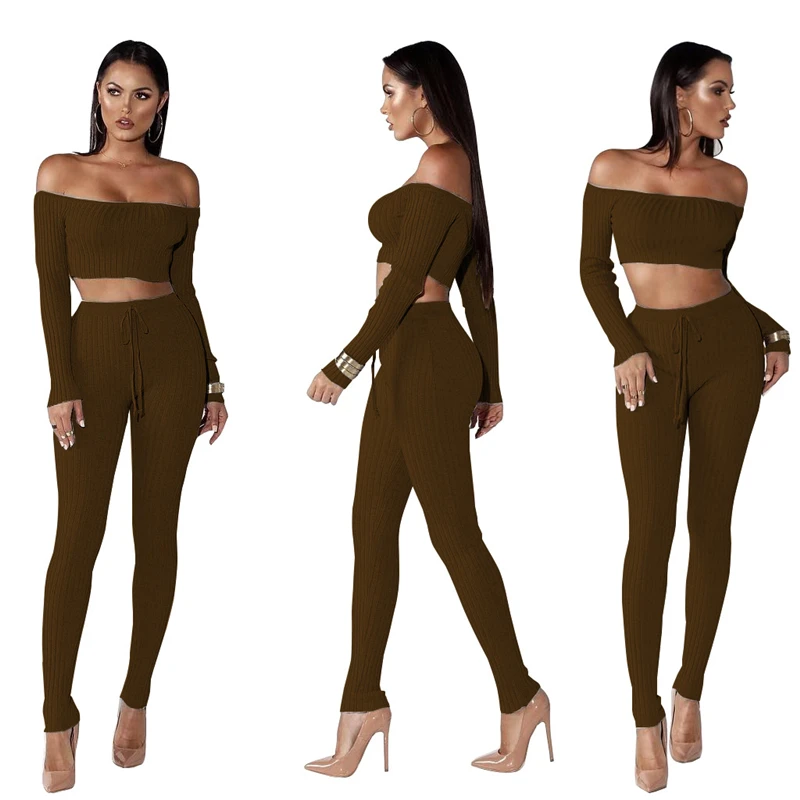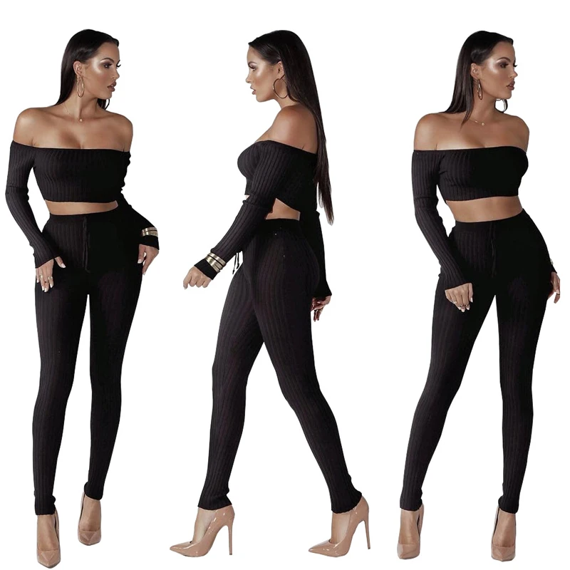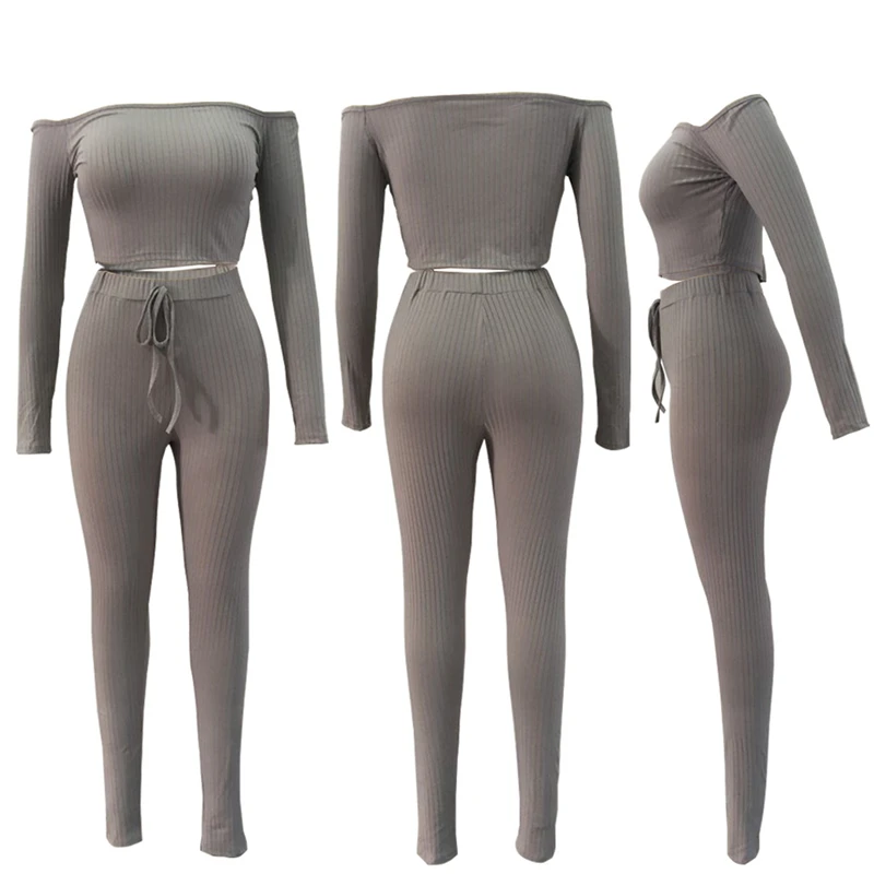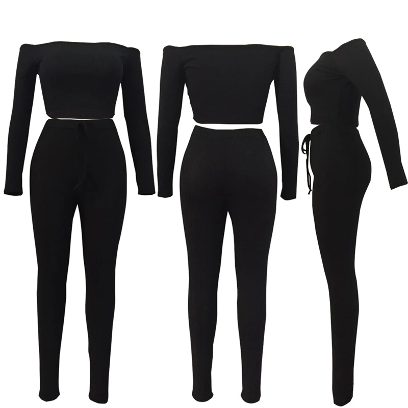 victoria’svogue High Stretch Ribbed Women Two Piece Set Sexy Slash Neck Off Shoulder Long Sleeve Bodice Crop Top Drawstring Skinny Pants