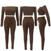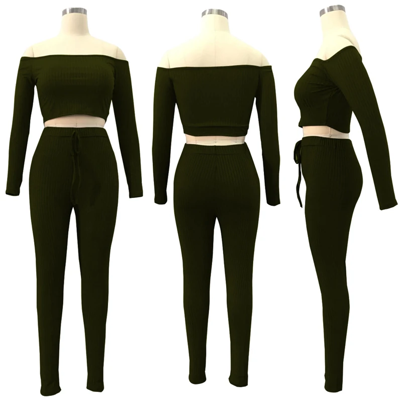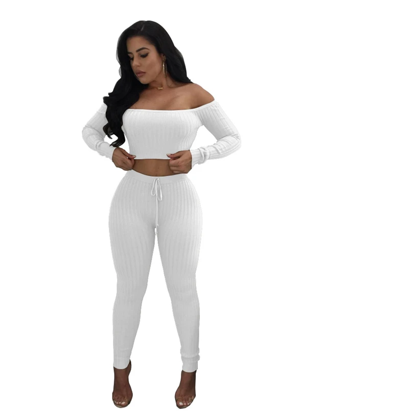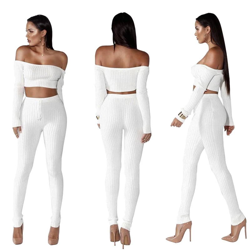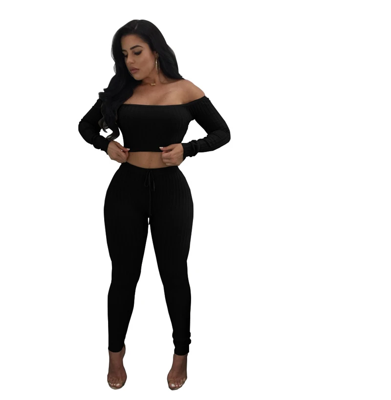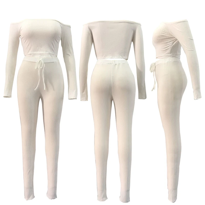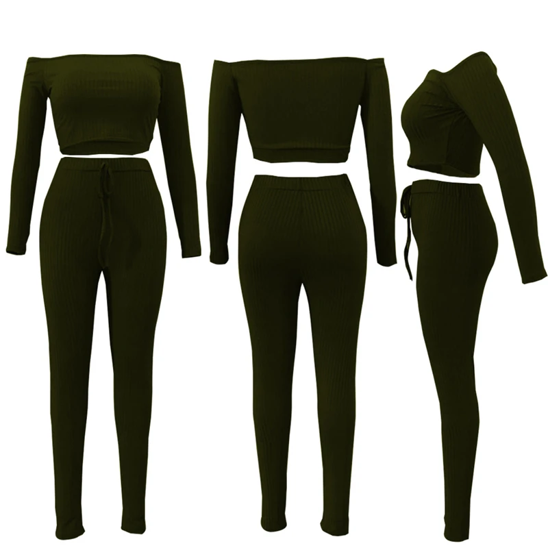 victoria’svogue High Stretch Ribbed Women Two Piece Set Sexy Slash Neck Off Shoulder Long Sleeve Bodice Crop Top Drawstring Skinny Pants