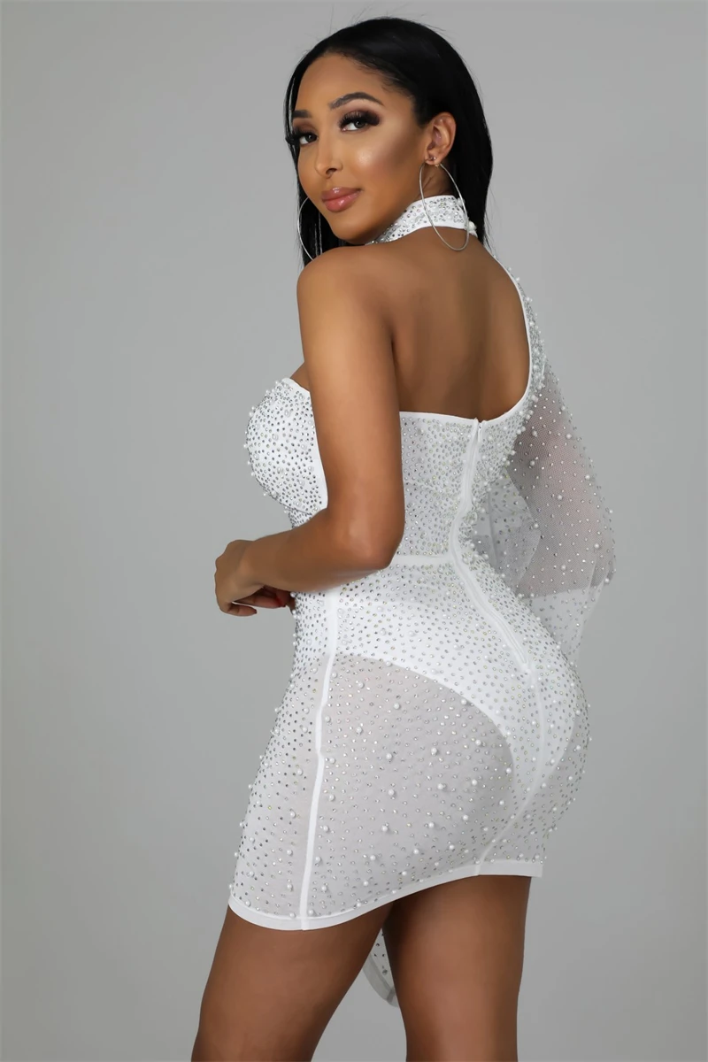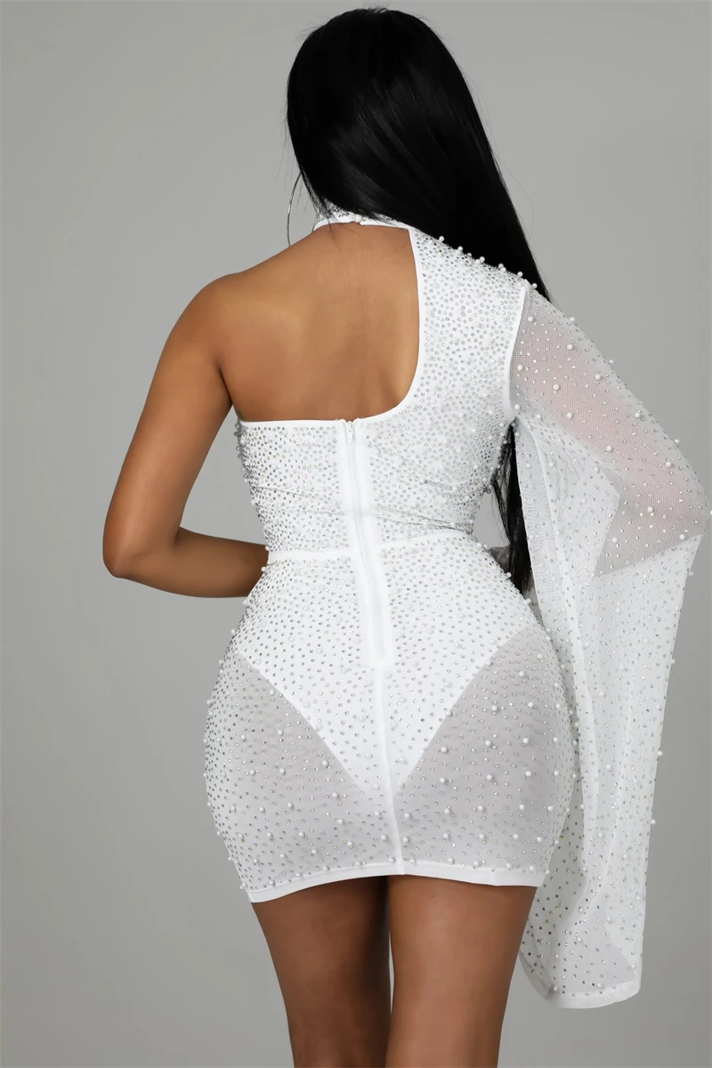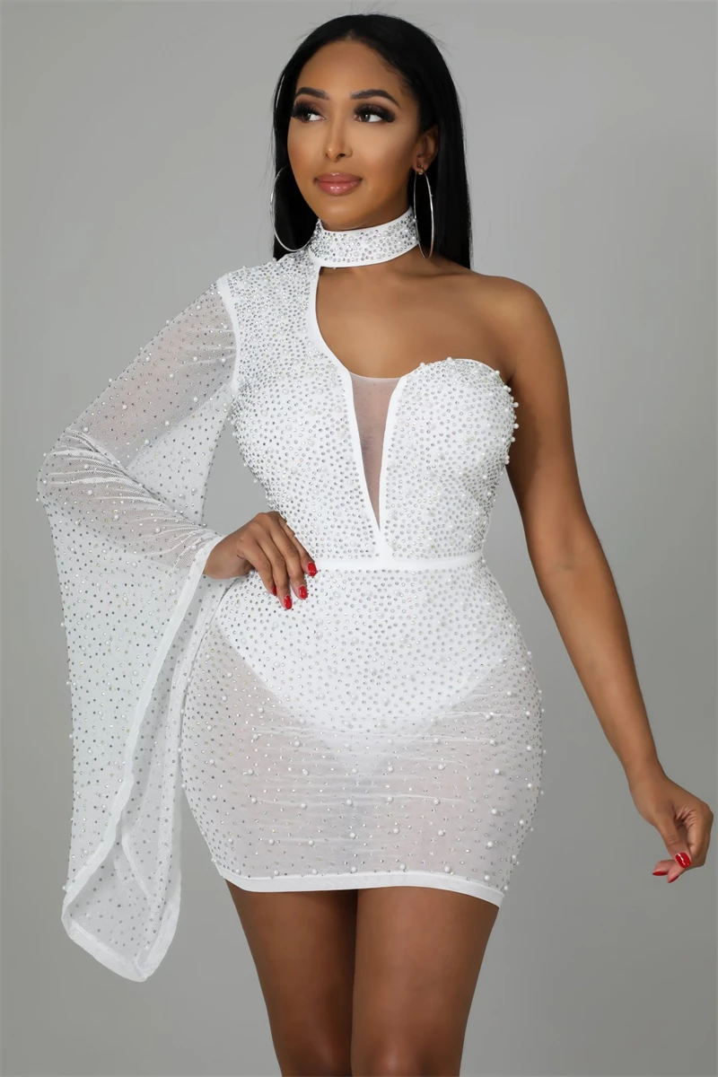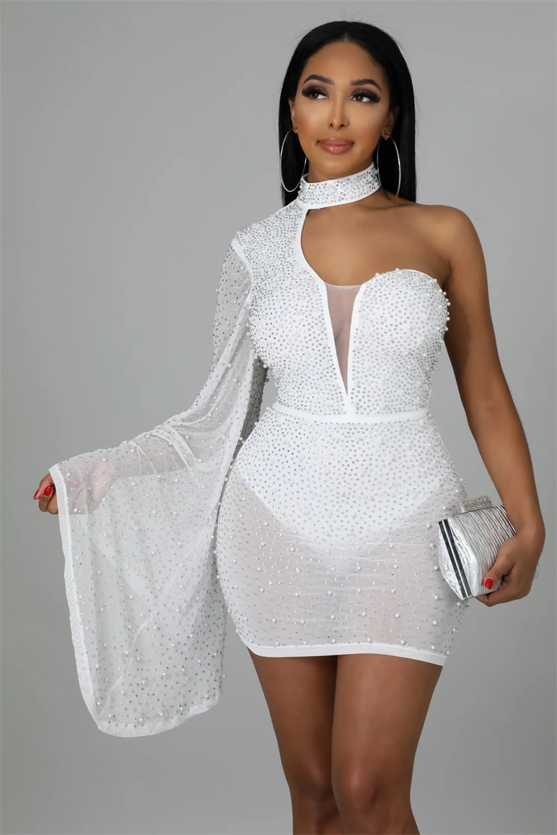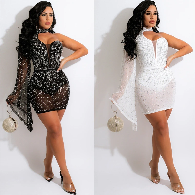 victoria’svogue Pearls Diamonds One Shoulder Mini Party Dress Women Sexy Sheer Mesh Halter Flare Long Sleeve Sheath Birthday Clubwear