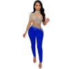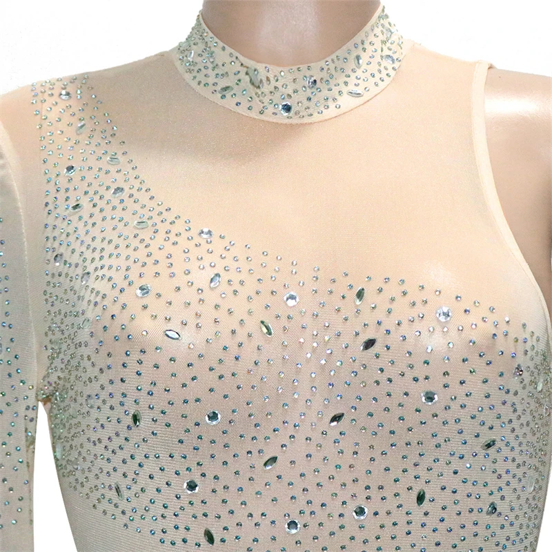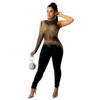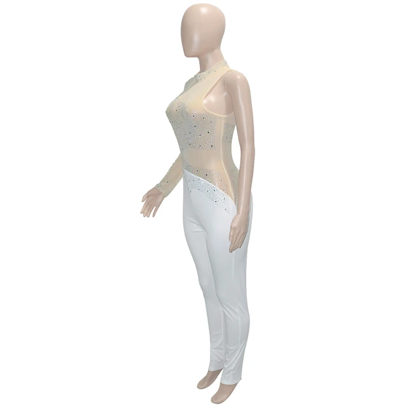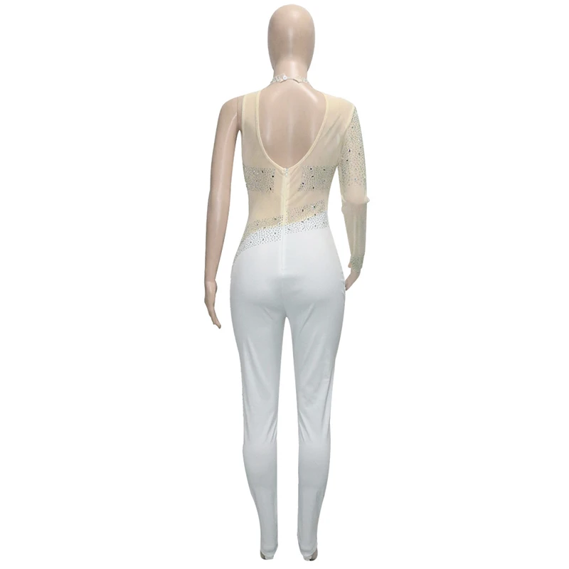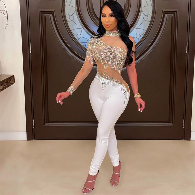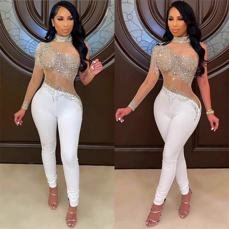 victoria’svogue Rinestone Diamonds Sheer Mesh Patchwork Jumpsuit Women Sexy Mock Neck Long Sleeve Skinny Overalls Night Club Outfits