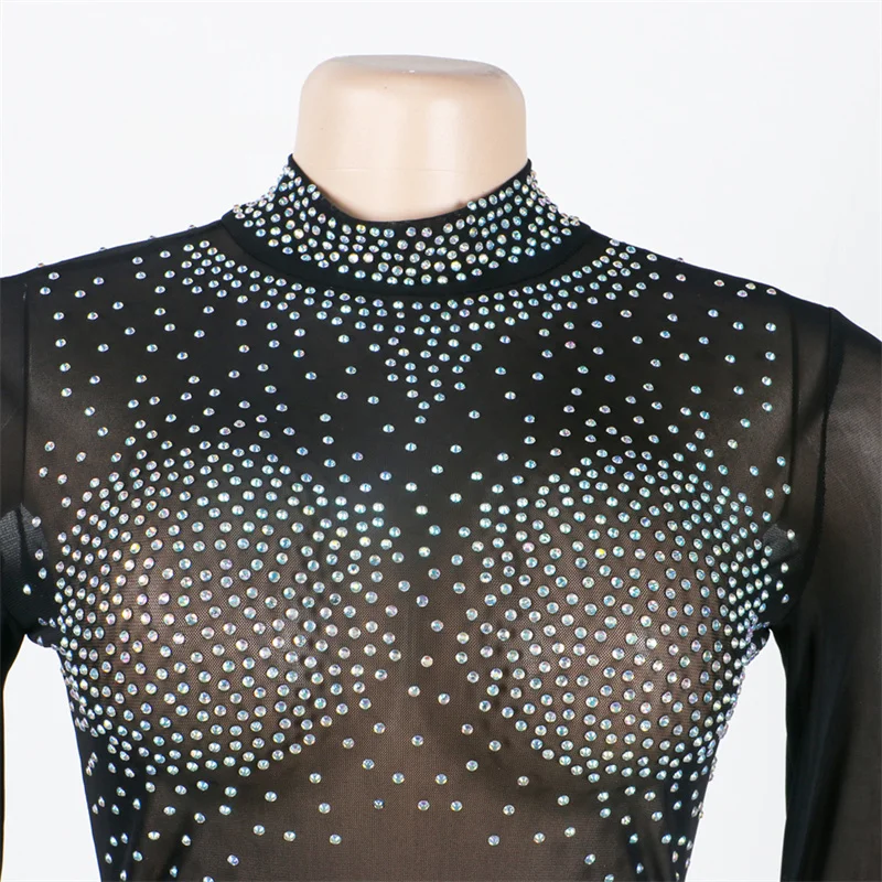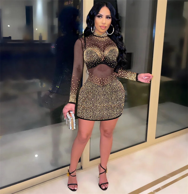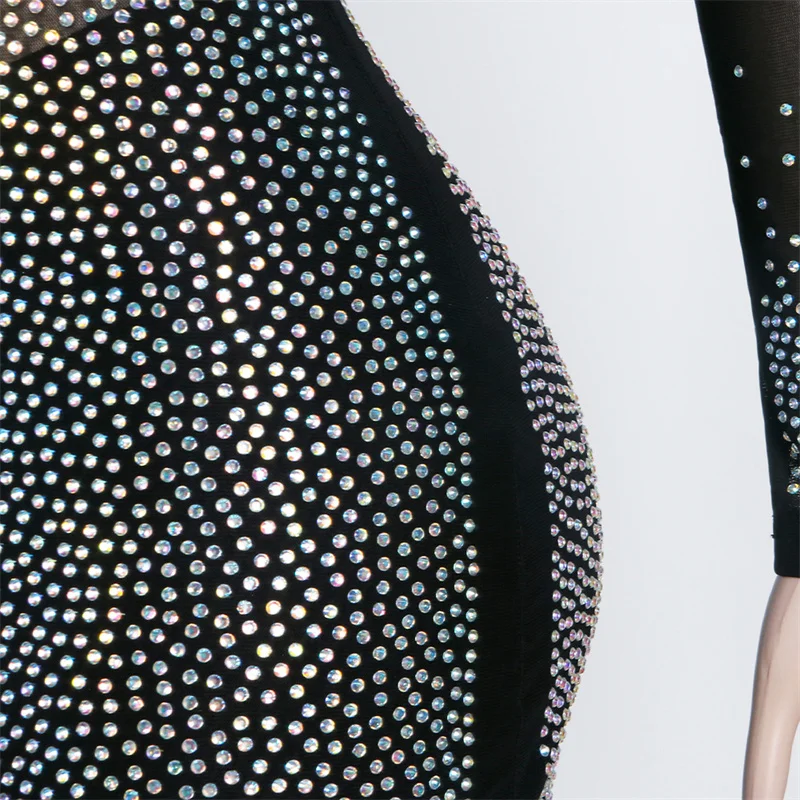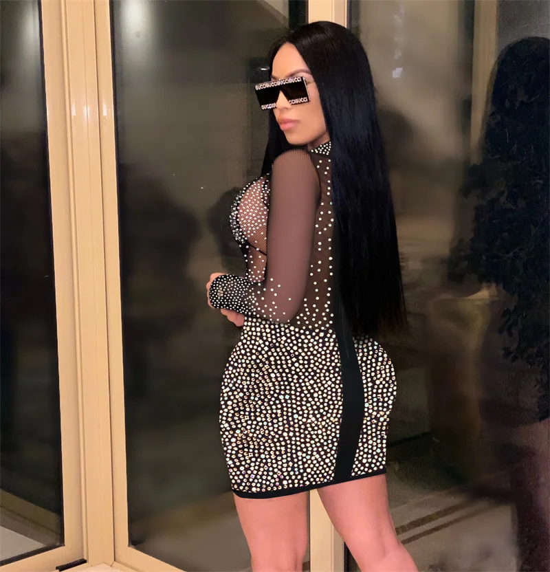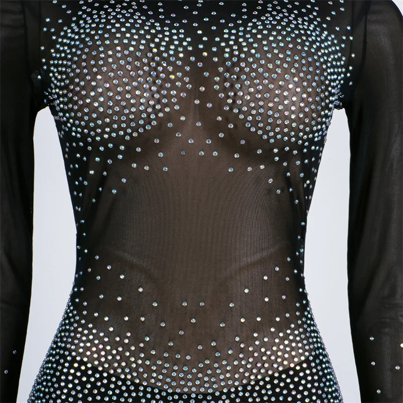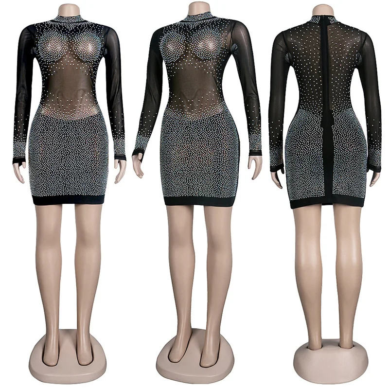 victoria’svogue S-3XL Diamonds Sheer Mesh Mini Dress Women Sexy Mock Neck Long Sleeve Sheath Clubwear Party Vestidos Drop Ship Wholesale