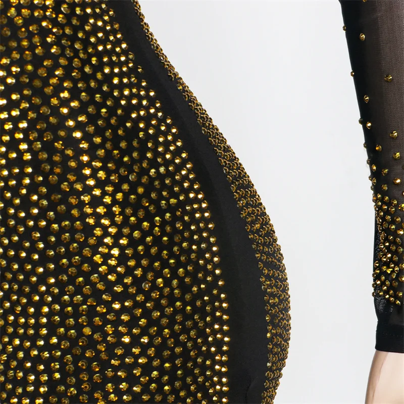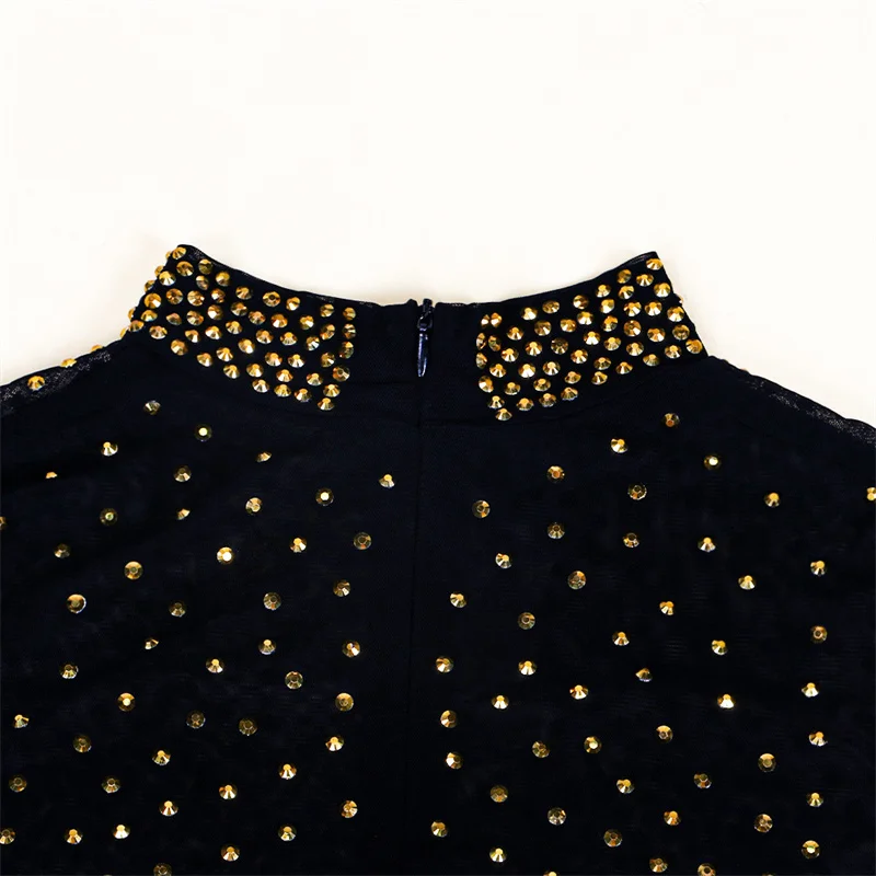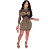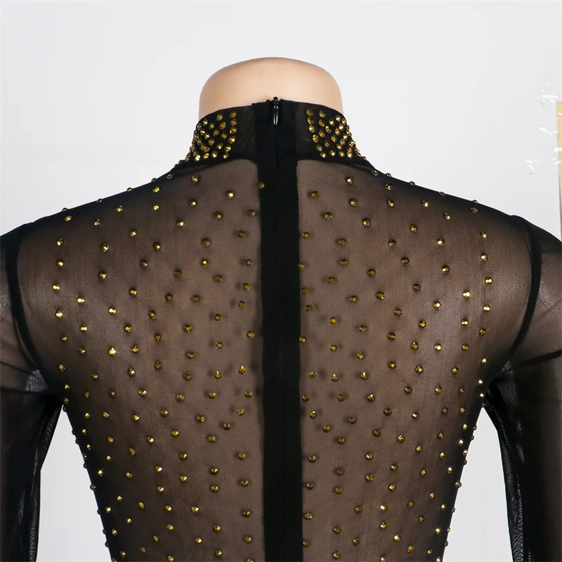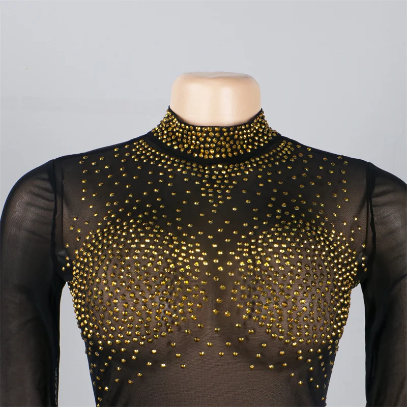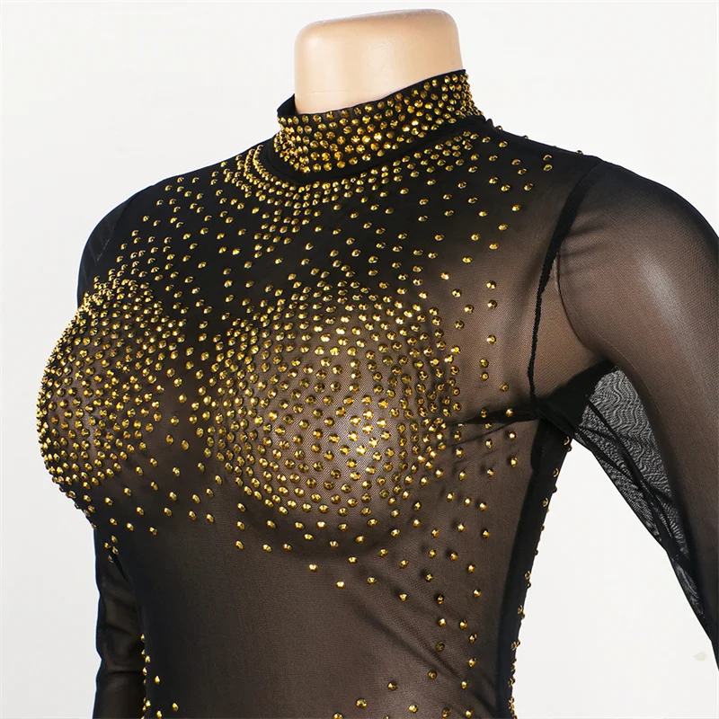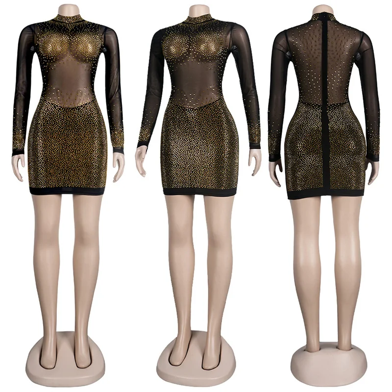 victoria’svogue S-3XL Diamonds Sheer Mesh Mini Dress Women Sexy Mock Neck Long Sleeve Sheath Clubwear Party Vestidos Drop Ship Wholesale