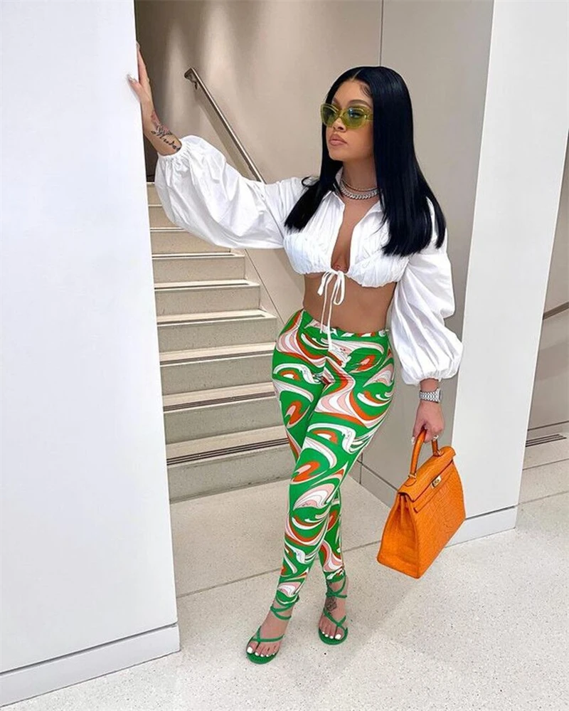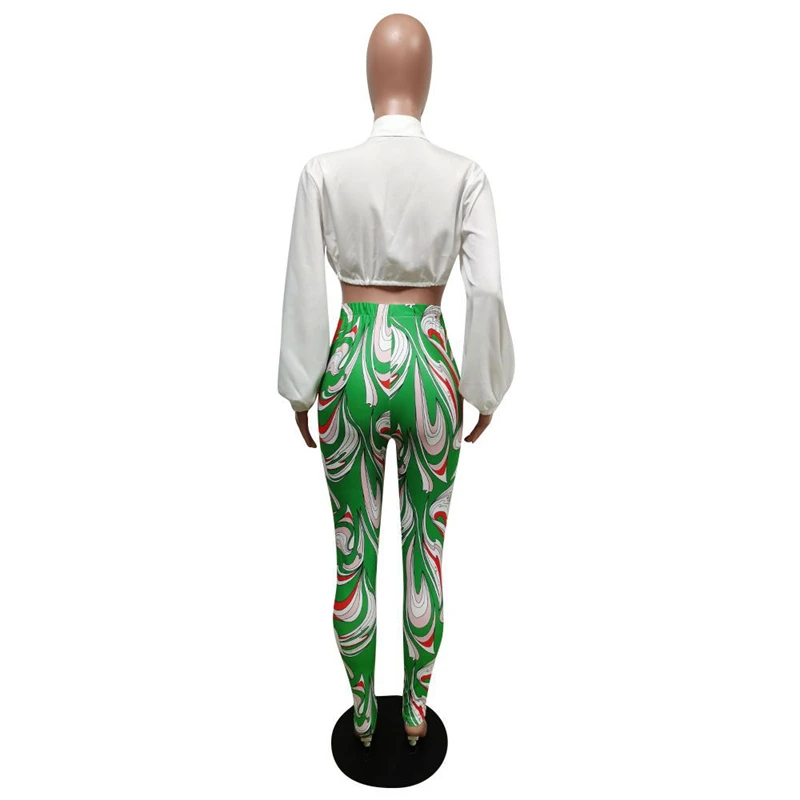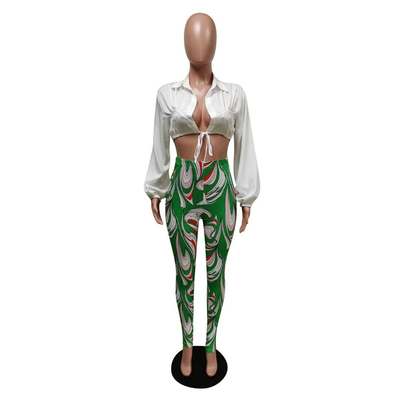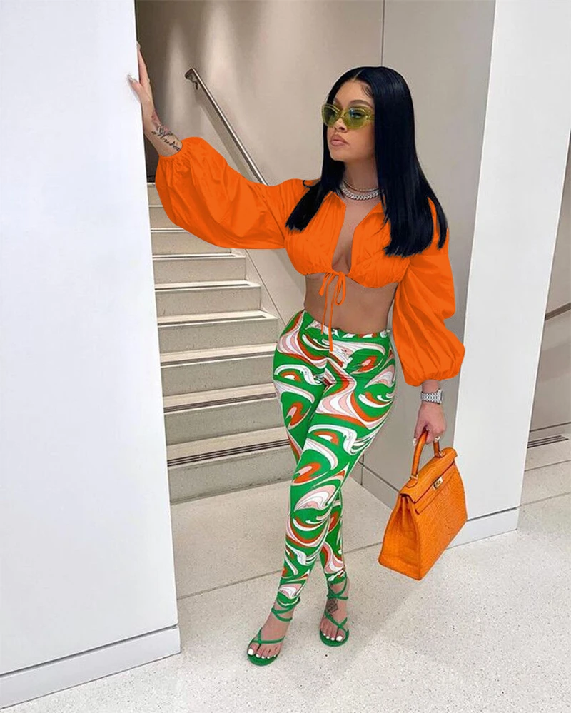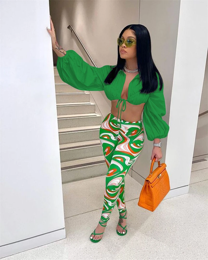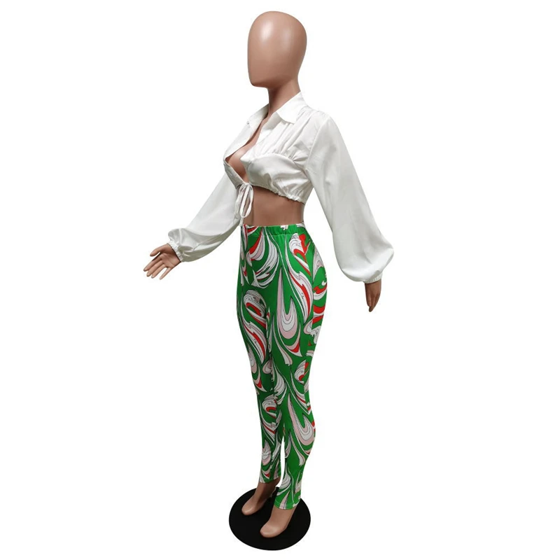 victoria’svogue Women Casual Two Piece Set Lace Up Long Lantern Sleeve Shirt Crop Top High Waist Leggings Pants 2021 Autumn Clothing