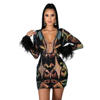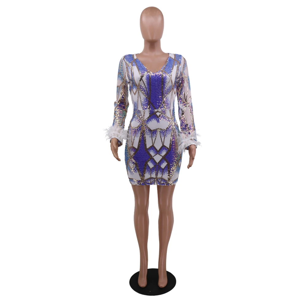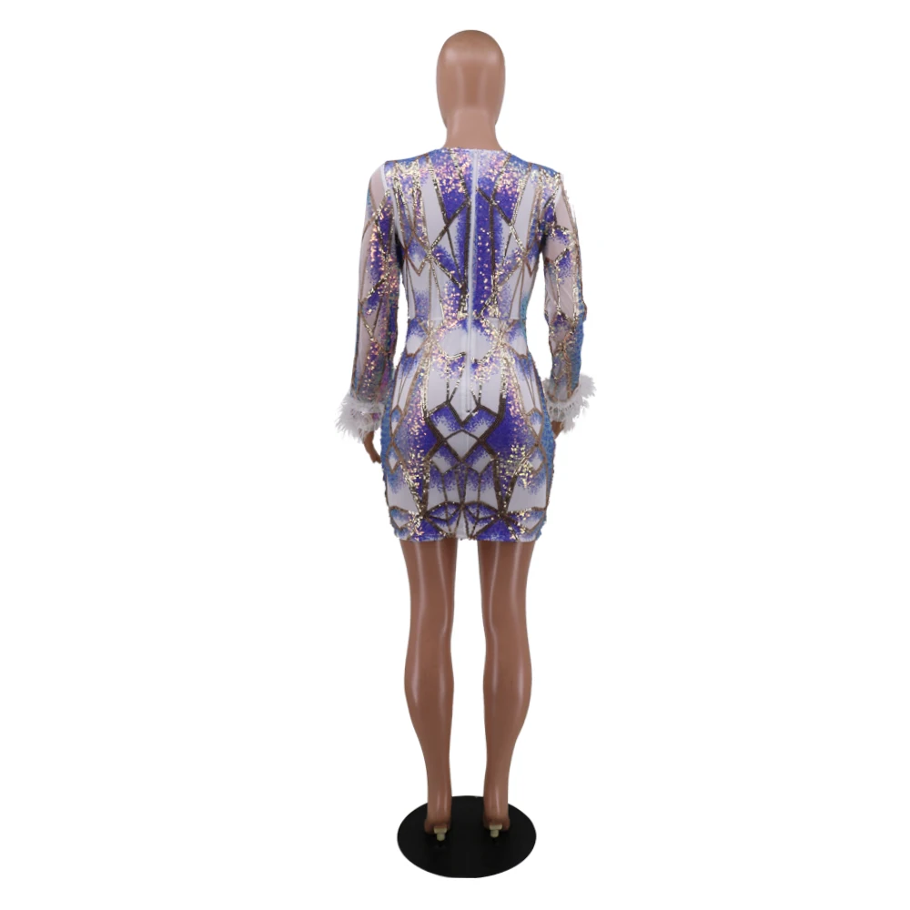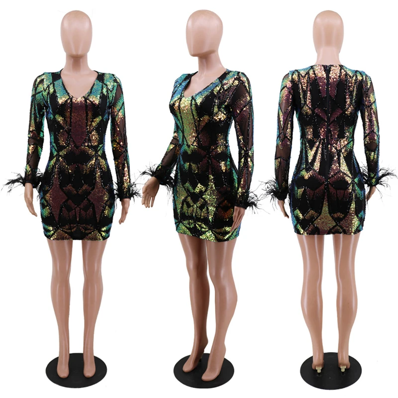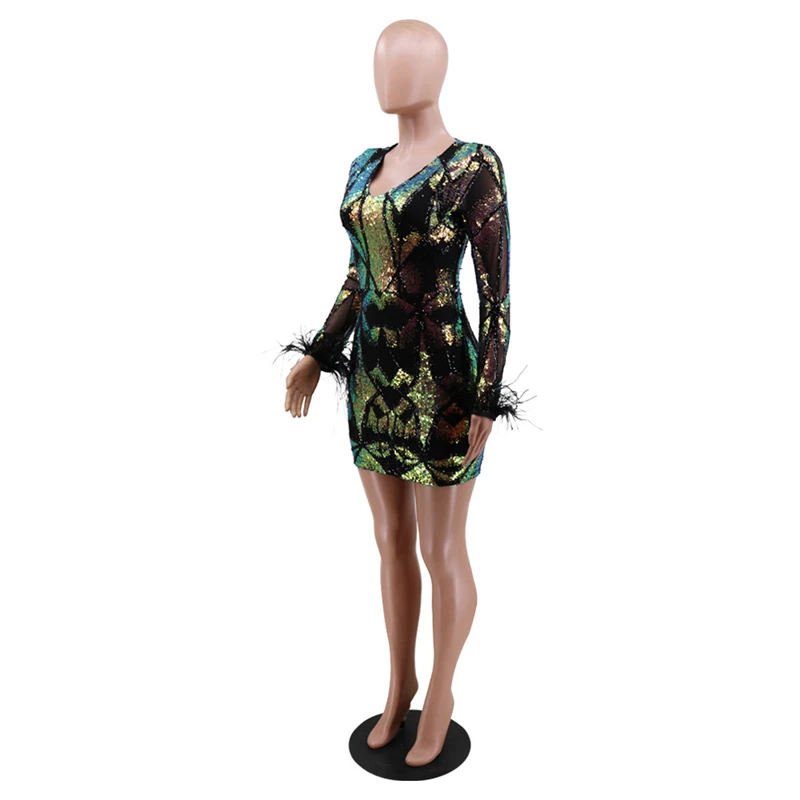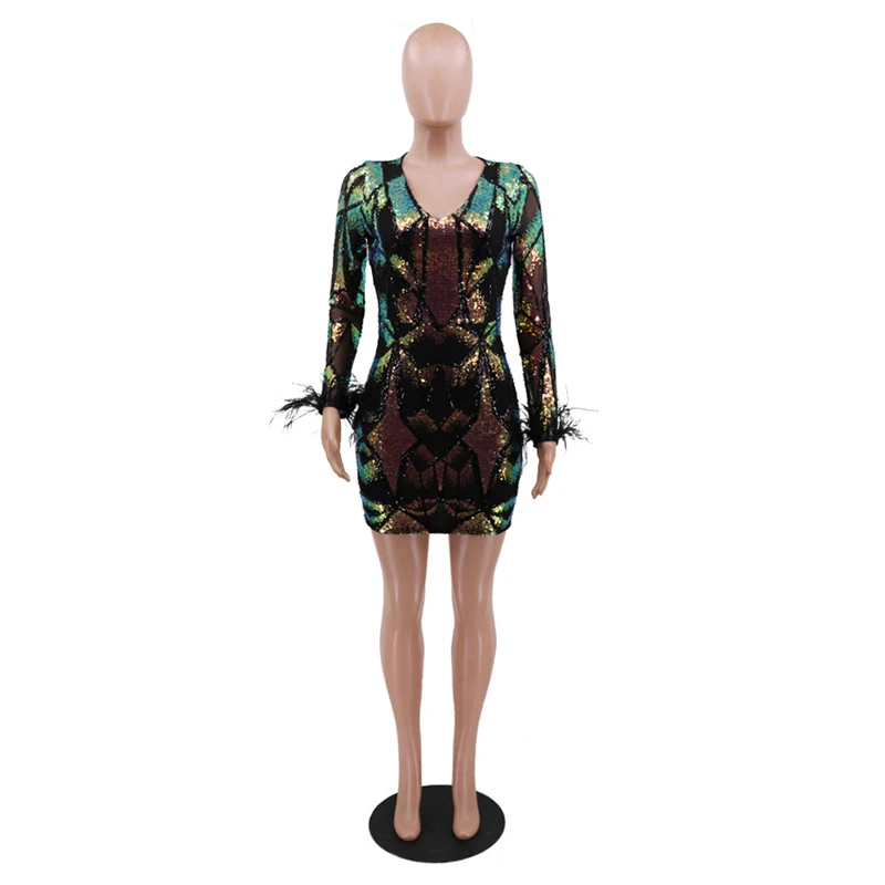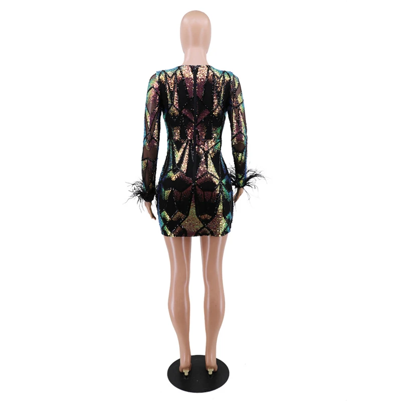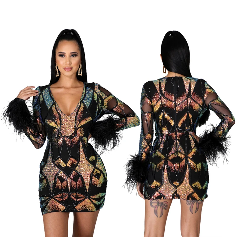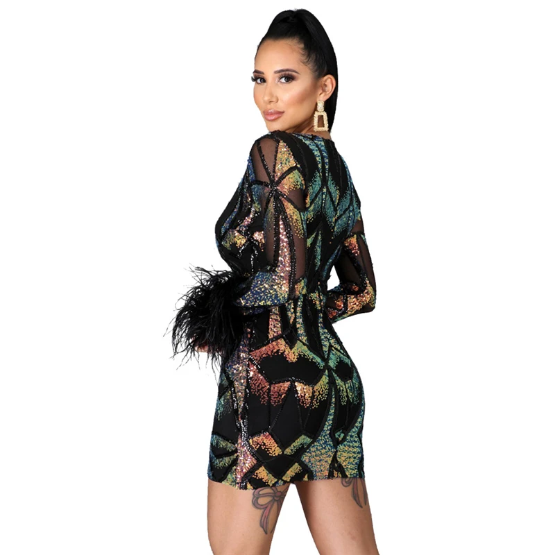 victoria’svogue 2021 Women Sexy Sequins Feather Night Club Party Dress Deep V Neck Sheer Mesh Long Sleeve Bodycon Mini Dresses Vestidos