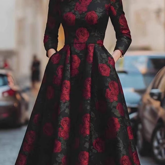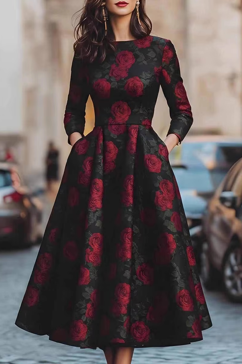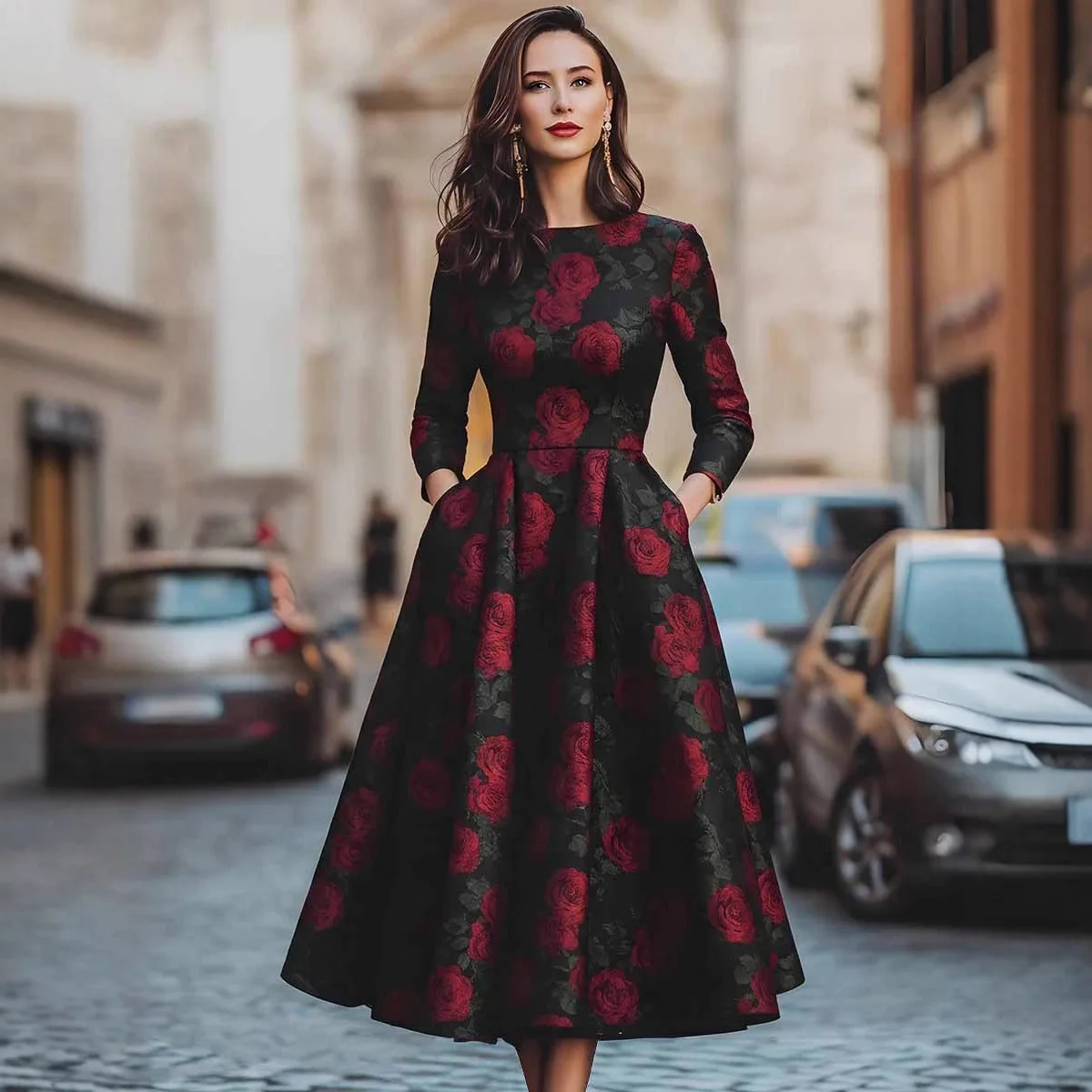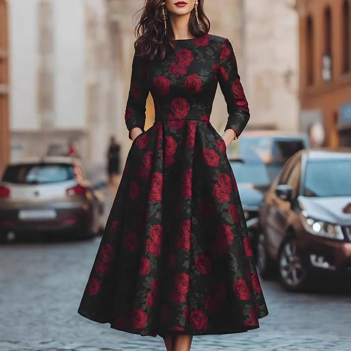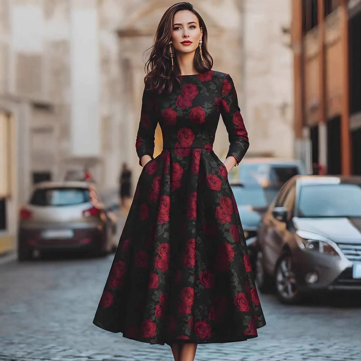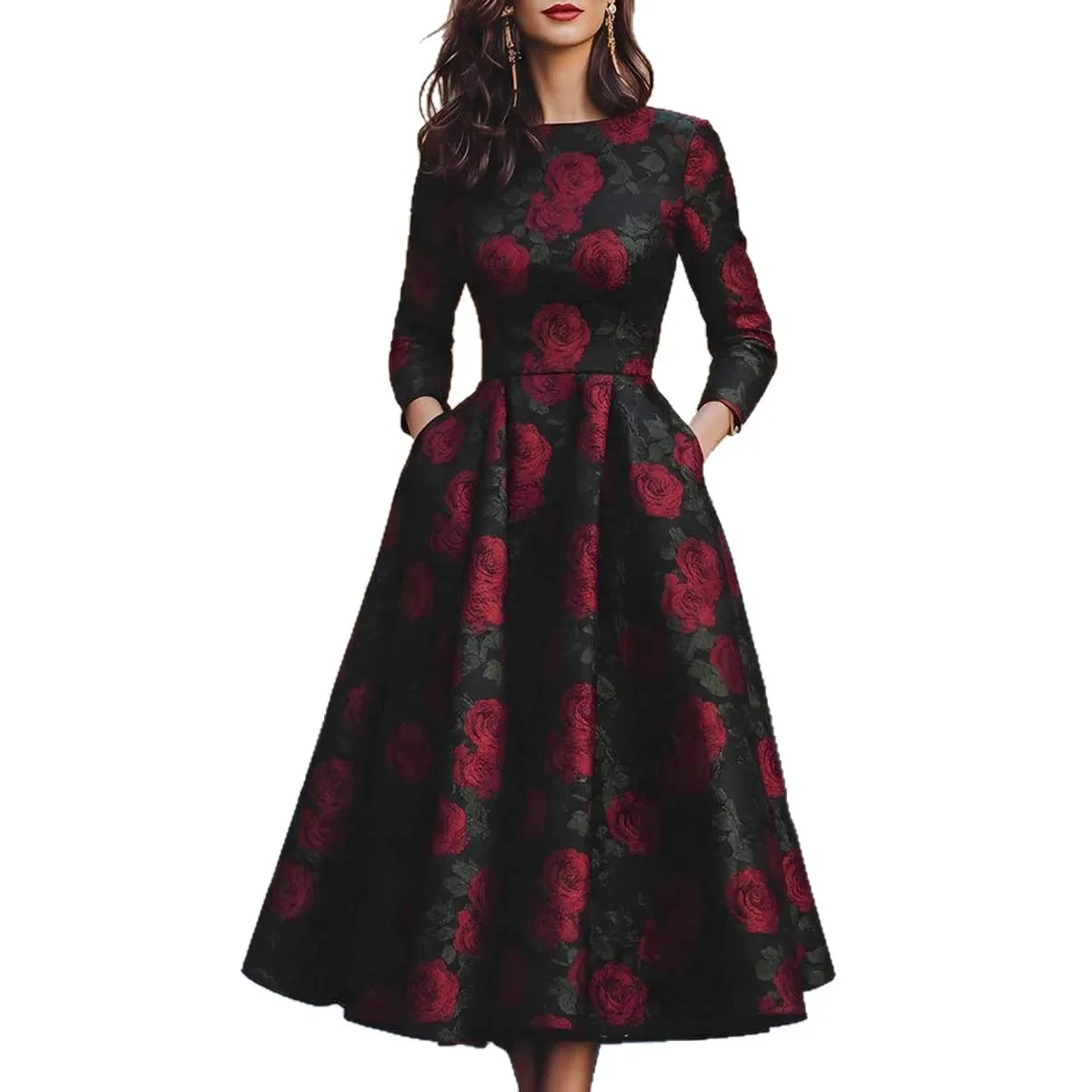 Victoria’s Vouge American Retro Floral Printed Dress for Women’s Elegant Party Club Wedding Guest A-line Midi Dress Long Sleeve Round Neck Dress
