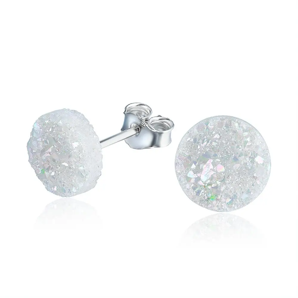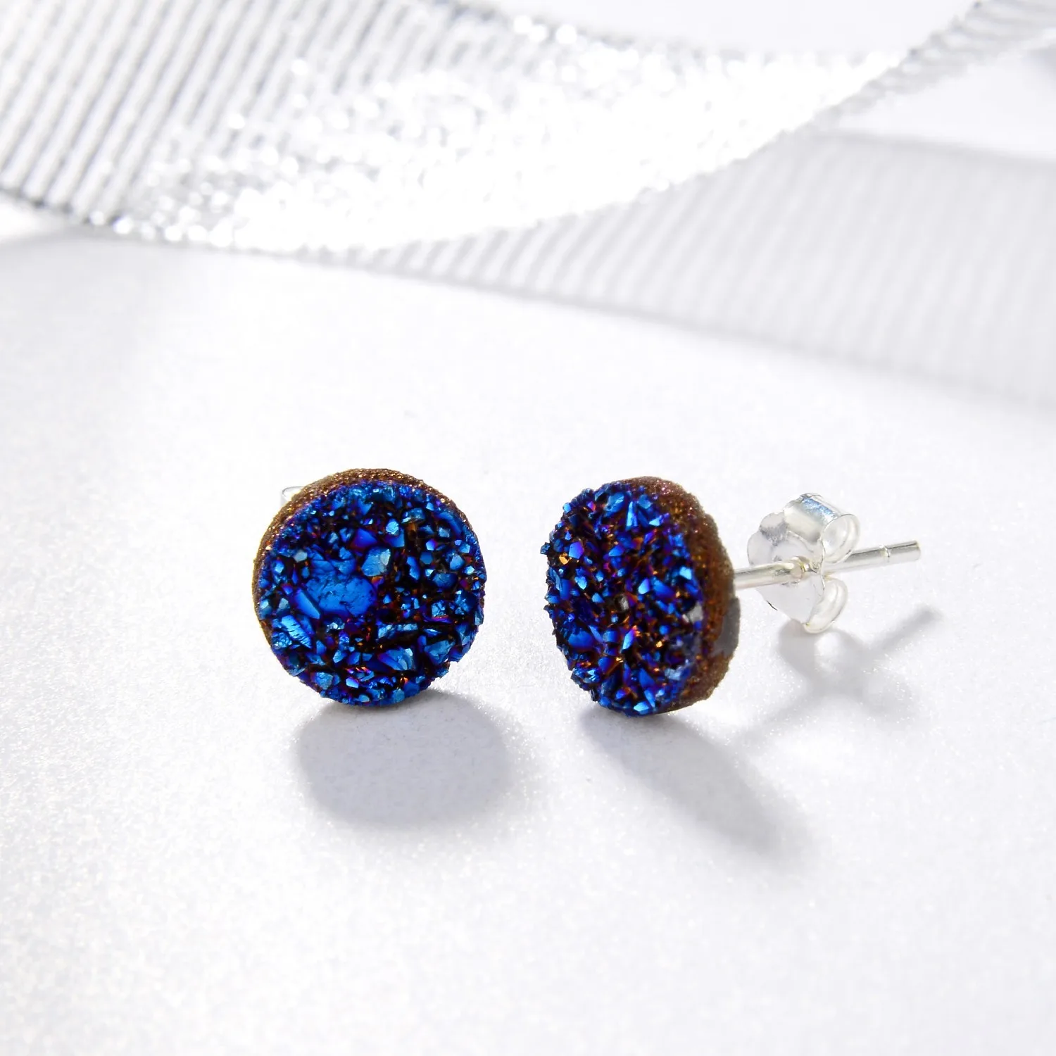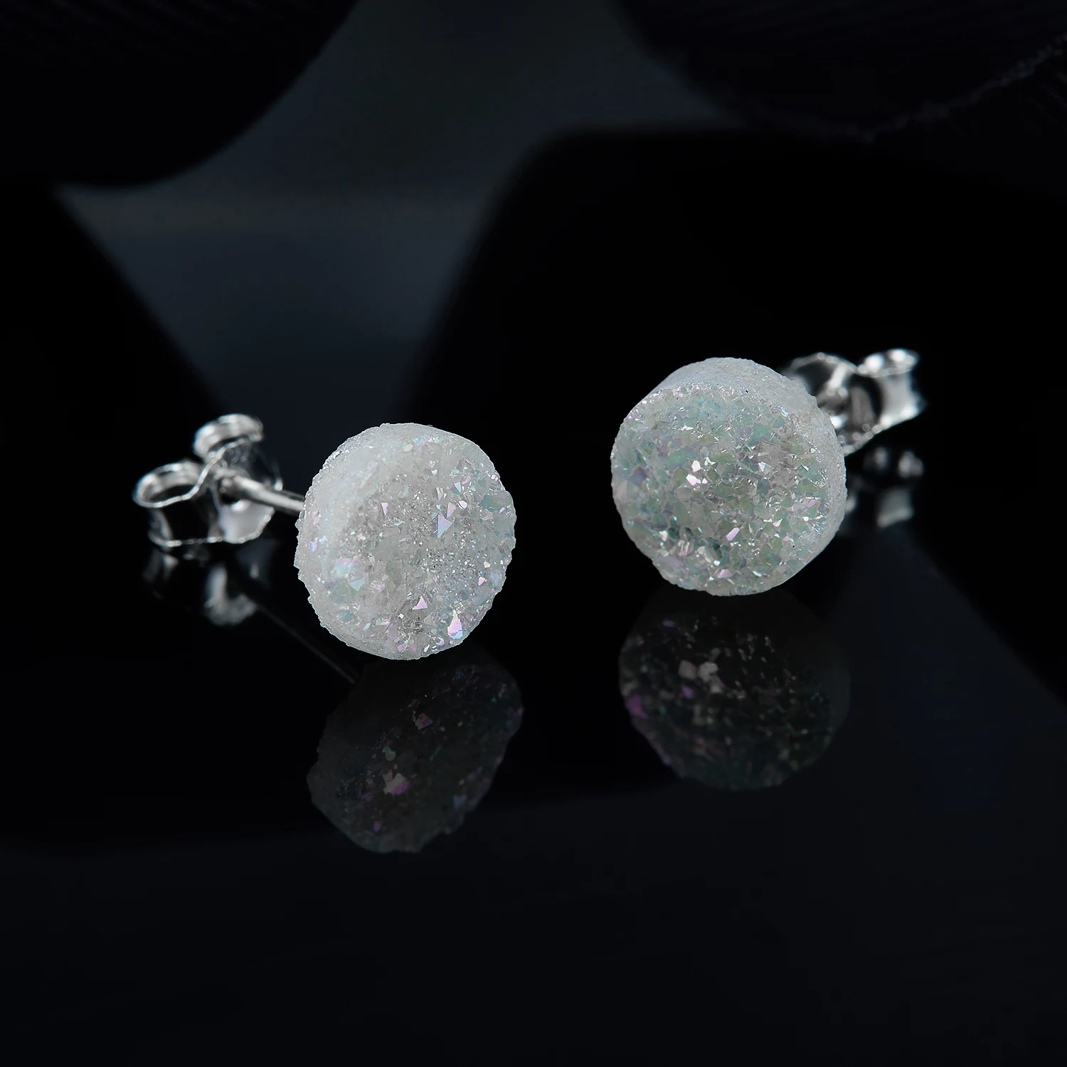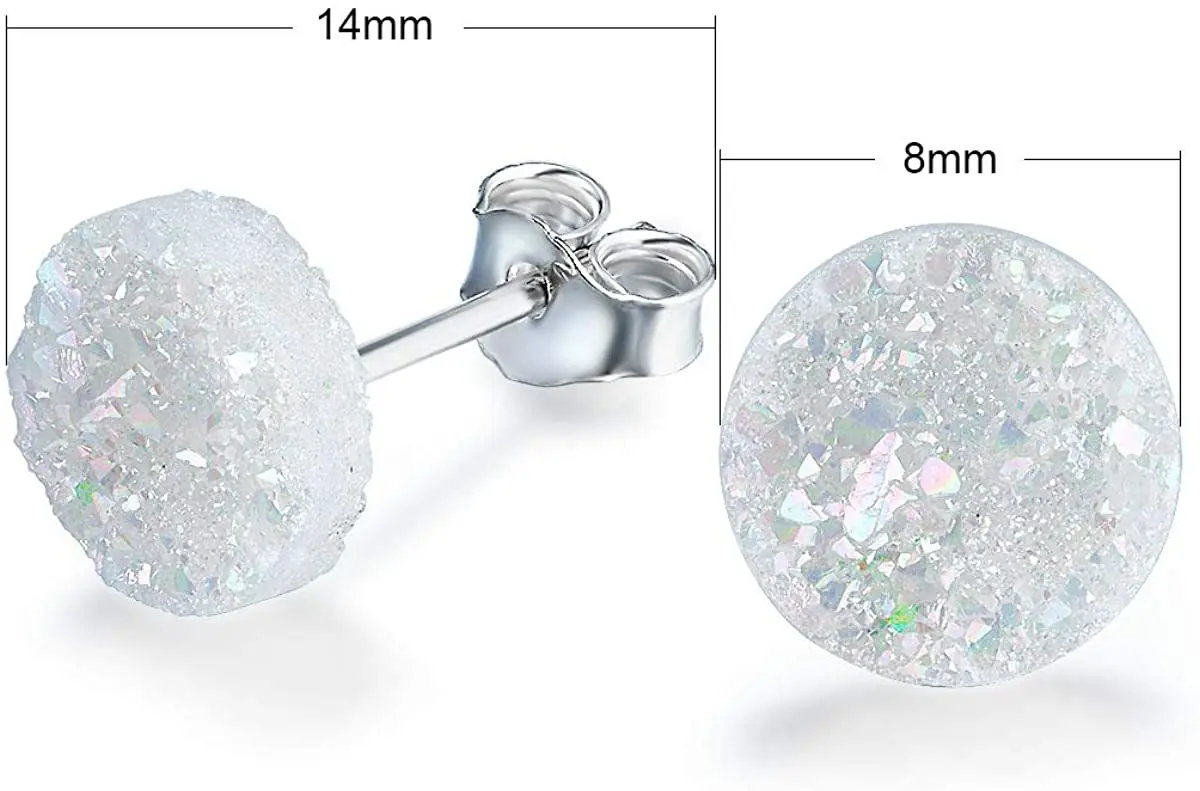 Victoria’s Vogue 925 Sterling Silver Druzy Stud Earrings 8mm Round Healing Agate Crystal Jewelry for Women or Girls