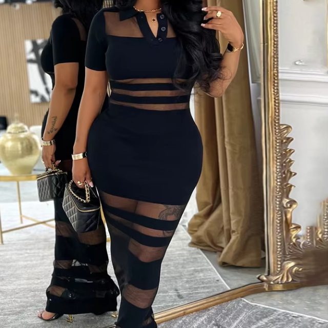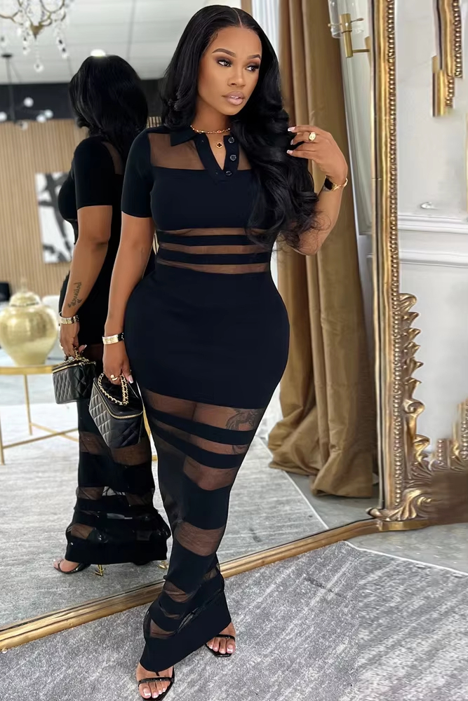 Victoria’s Vogue Women’s See-Through Striped Sheer Polo Maxi Dress Sexy Turn-Down Collars Caged Party Dresses Night Out Vestido Clubwear