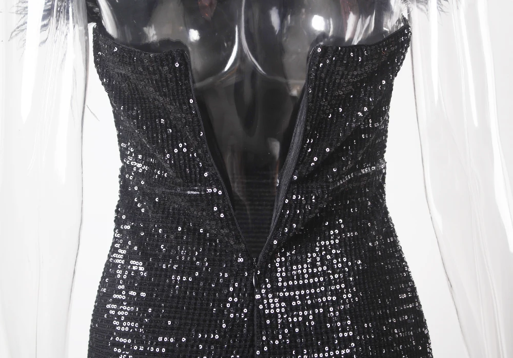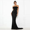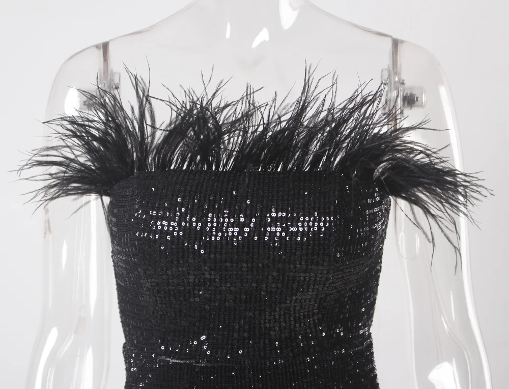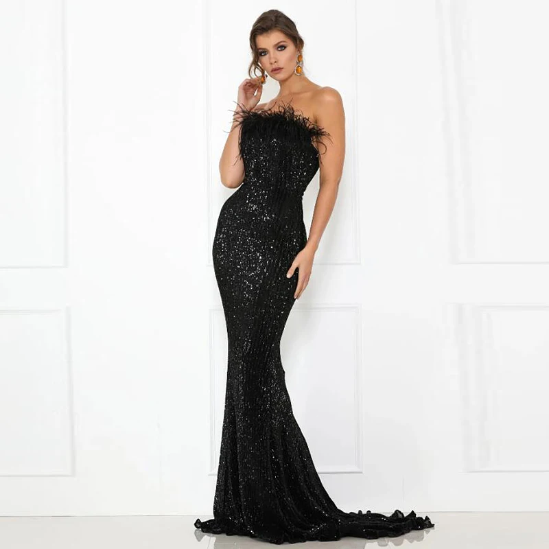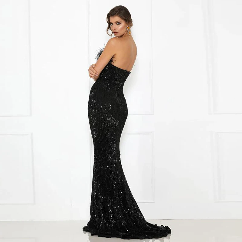 victoria’svogue 2021 Black Feather Maxi Dress Slash Neck Stretch Sequined Strapless Bodycon Backless Floor Length Sleeveless Long Club Dress
