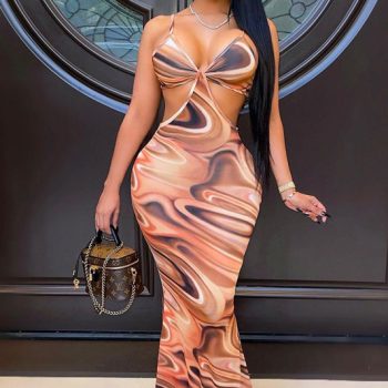 victoria’s vogue Sexy Blue Cross Straps Cut Out Drawstring Decoration Glitter Print Fabric Bodycon Maxi Reflective Dress