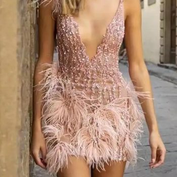 Victoria’s Vogue 2022 New Arrival Feather Dress Pink Deep V Neck Strape Sleeveless Mini Bodycorn Skinny Summer Club Night Wear Evening Dresses
