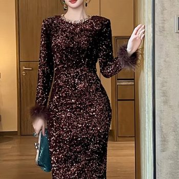Victoria’s Vogue Women’s Clothing Luxury Retro Prom Dress Female Elegant Elastic Velvet Fur Long Sleeve Bodyocn Robe Lady Cocktail Party Vestidos
