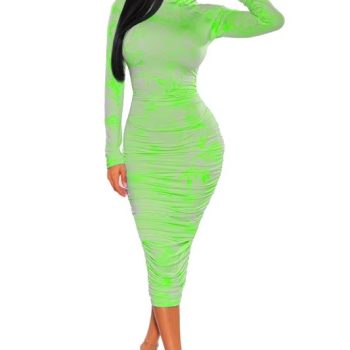 Victoria’s Vouge Ethnic style high collar tie-dye print long sleeve pleated high elastic slim dress hip long skirt