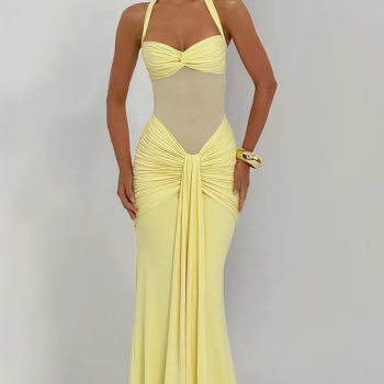 Victoria’s Vogue Halter Backless Sexy Maxi Dress Women Fashion Patchwork Off-shoulder Sleeveless Ruched Draped Bodycon Club Party Dress