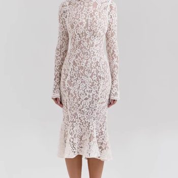 Victoria’s Vogue Lace Long Sleeve Sexy Midi Dress For Women Elegant White Half High Collar High Waist Bodycon Club Party Sexy Long Dress
