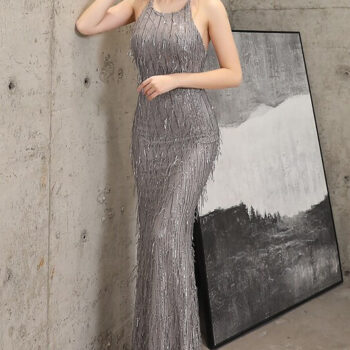 victoria’s vogue Off Shoulder Tassel Sequin Evening Dress Women Sexy Corss Back Long Evening Party Dress