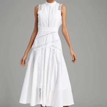 Victoria’s Vogue Solid Hollow Out Casual Dresses For Women Stand Collar Sleeveless High Waist Minimalist A Line Dress Female Style