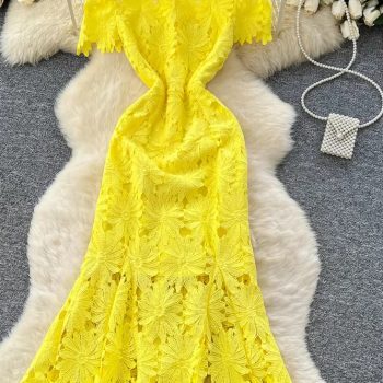Victoria’s Vogue Hook Flower Hollow Lace Dress Female Short Sleeves Zipper Skinny Design 2025 High Quality French Mermaid Long Sundress