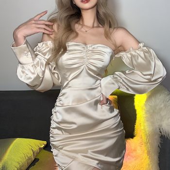 victoria’s vogue Satin Slash Neck Off Shouldder Long Puff Sleeves Pleated Mini Dress 2022 Bodycon Sexy Streetwear Evening Party Elegant