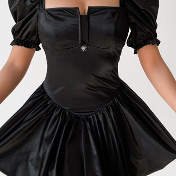 victoria’s vogue Satin Women Mini Dresses Corsets Square Collar Sexy Black Pleated Puff Sleeve Chic Clubwear Bodycon Black Party Dress