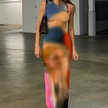 Victoria’s Vogue Tie Dye Print Ribbed Midi Dress For Women 2024 Summer Outfits Bodycon Side Slit Y2K Outfits Sexy Streetwear Long Dress