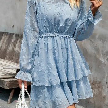 Victoria’s Vogue Elegant Women Chic Jacquard Dress Ladies Autumn Winter O Neck Lantern Sleeve High Waist Pleated Short Dresses