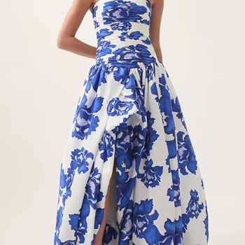 Victoria’s Vogue Strapless Printed Split Deign Long Bubble Dress Women Sleeveless Backless High Waist Patchwork Folds Dresses Evening Party
