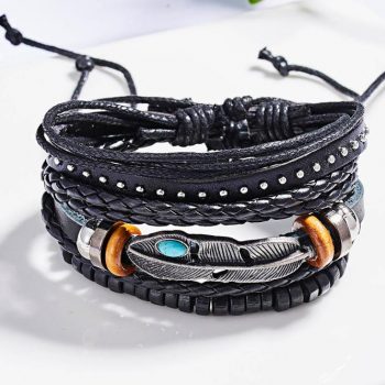 Victoria’s Vogue 4PCS/SET Vintage Leaf Pendant Rice Beads Adjustable Rope Chain Bracelet Punk Braided Wrap Wristbands For Men Fashion Jewelry