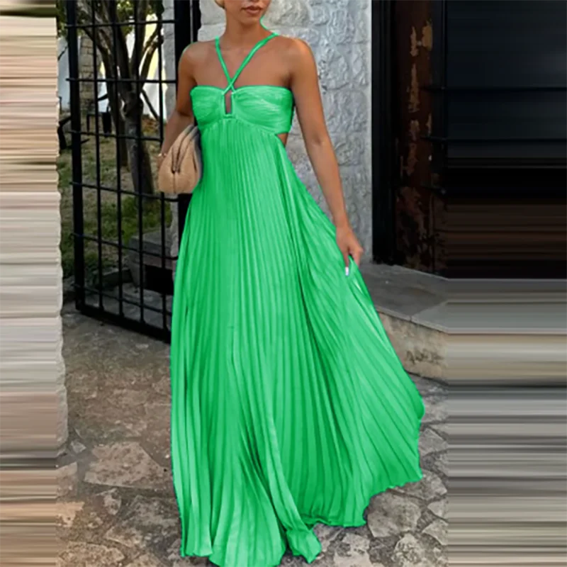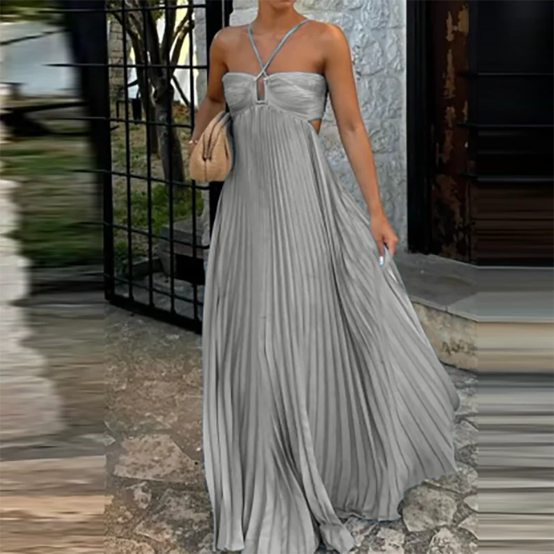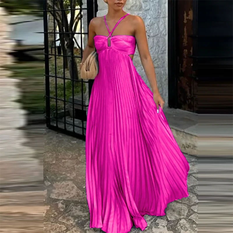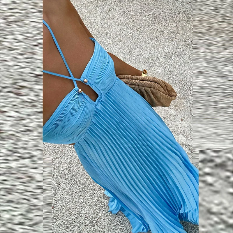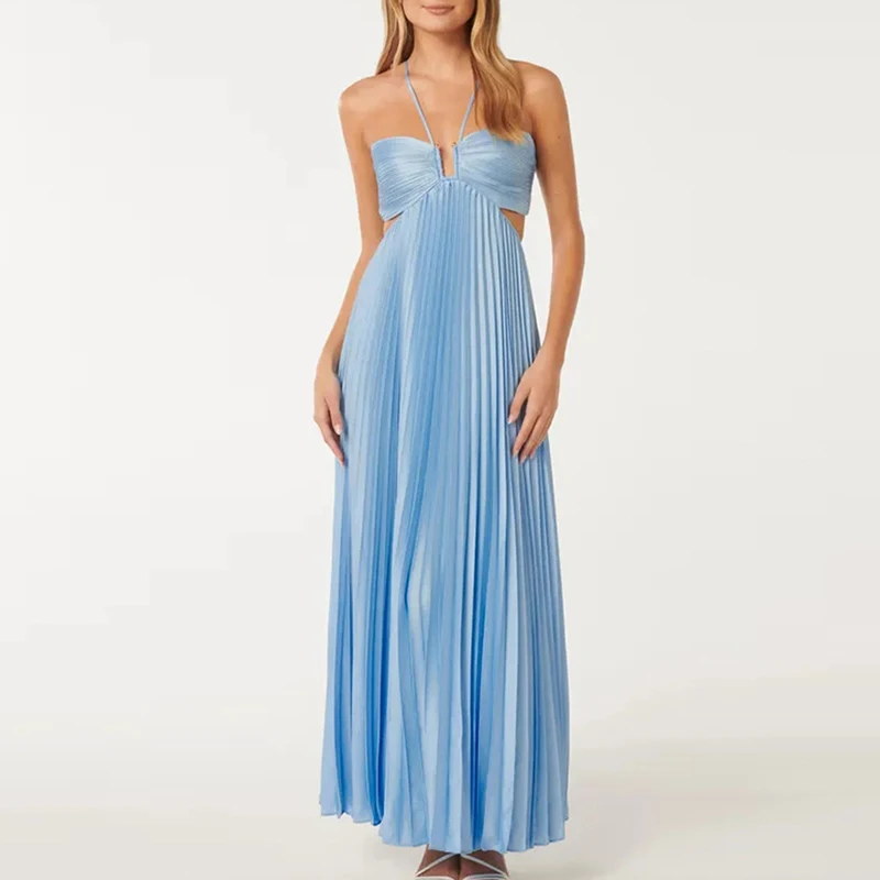 Victoria’s Vogue Casual Sleeveless Solid Color Holiday Dress Summer Sexy Halter Hollow Off Shoulder Party Dress Blue High Waist Pleats Robe Dress