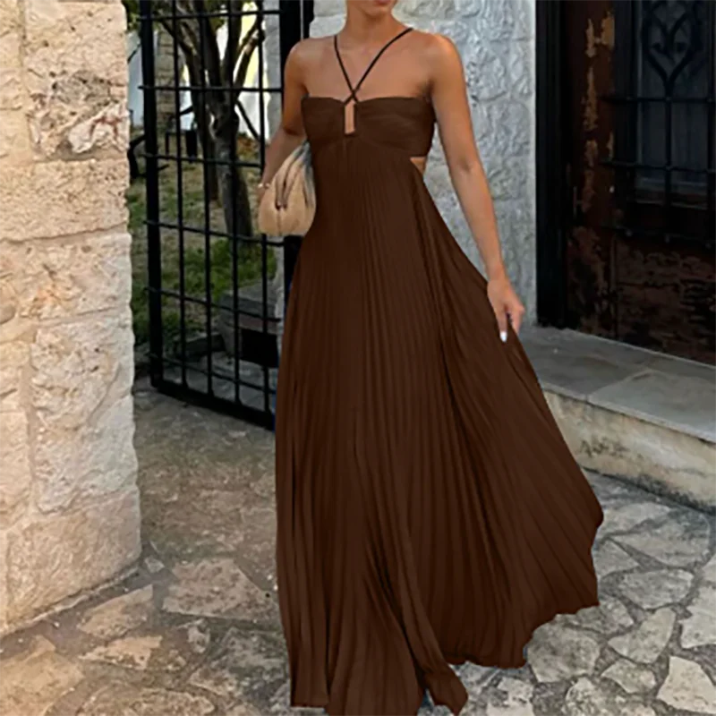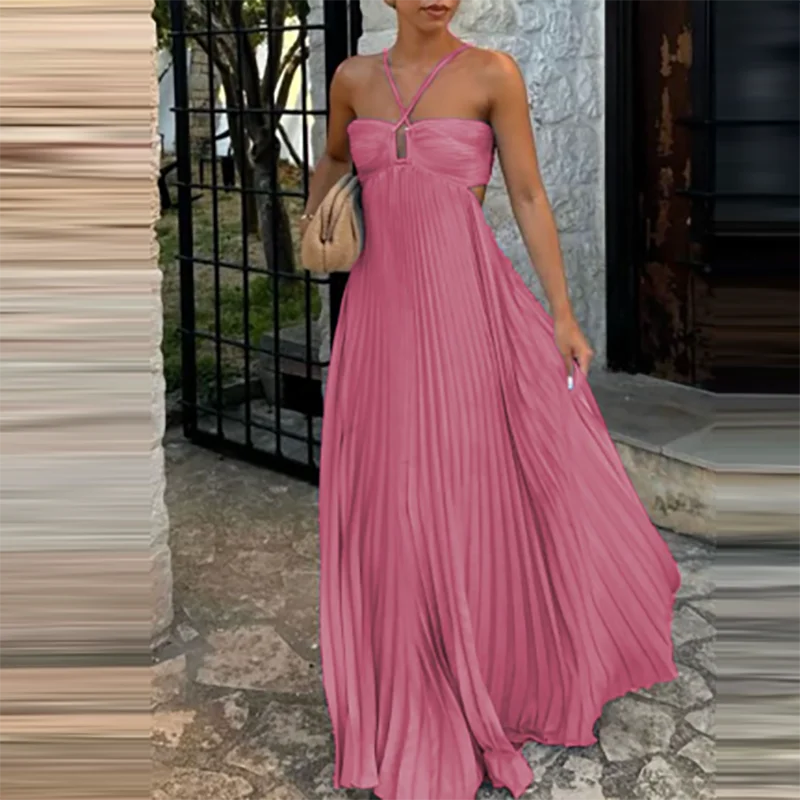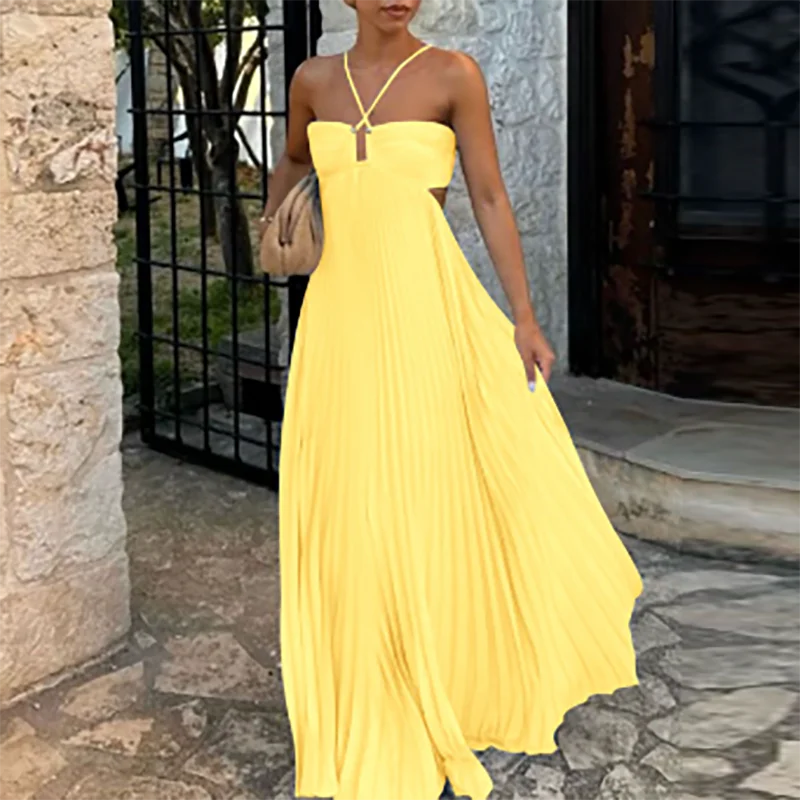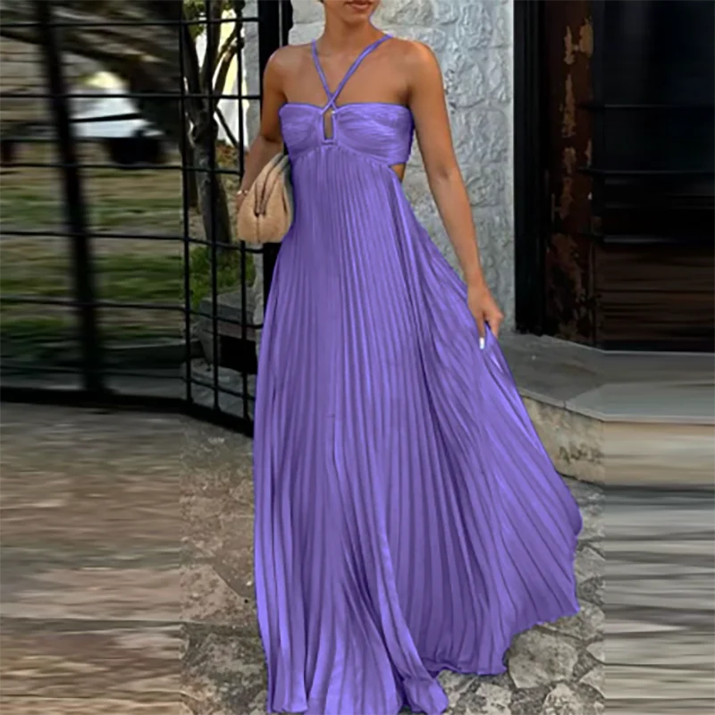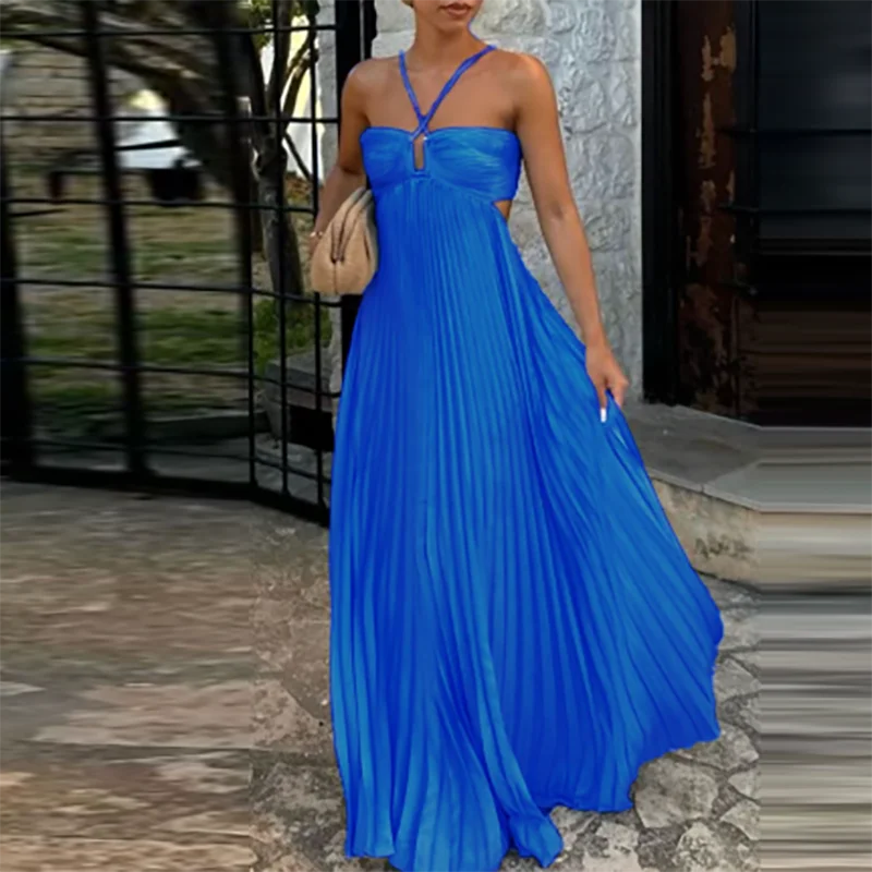 Victoria’s Vogue Casual Sleeveless Solid Color Holiday Dress Summer Sexy Halter Hollow Off Shoulder Party Dress Blue High Waist Pleats Robe Dress