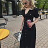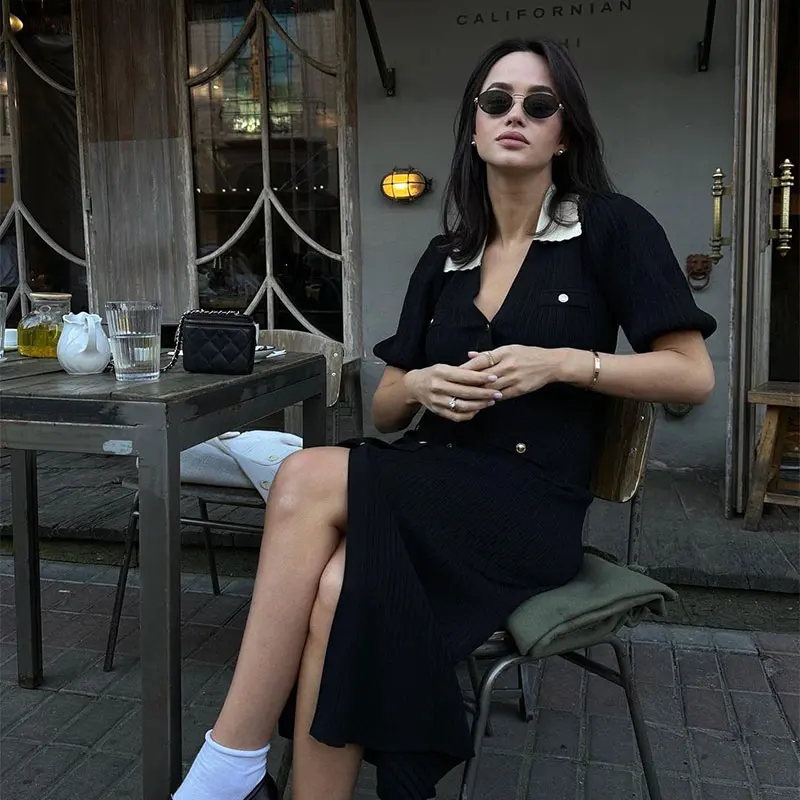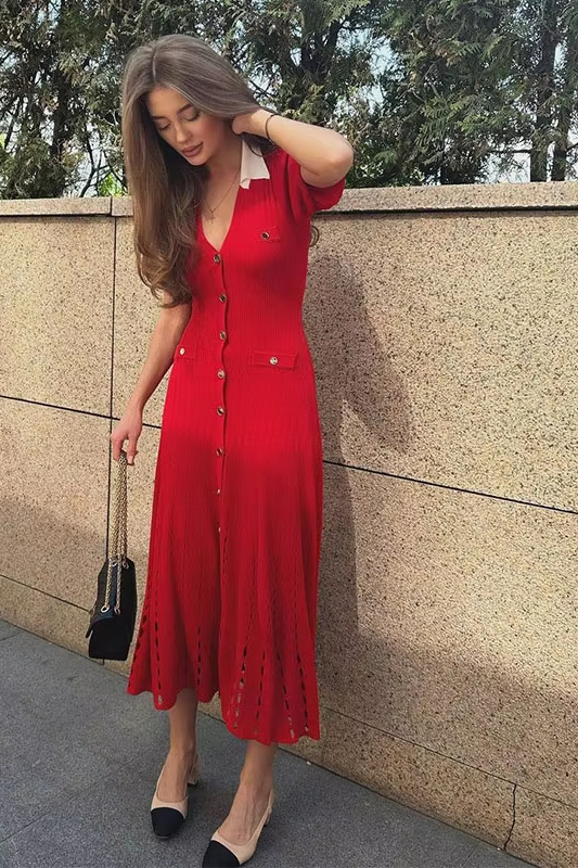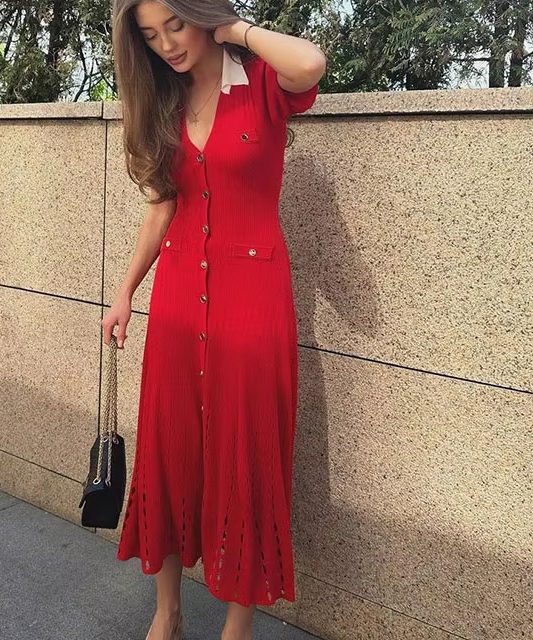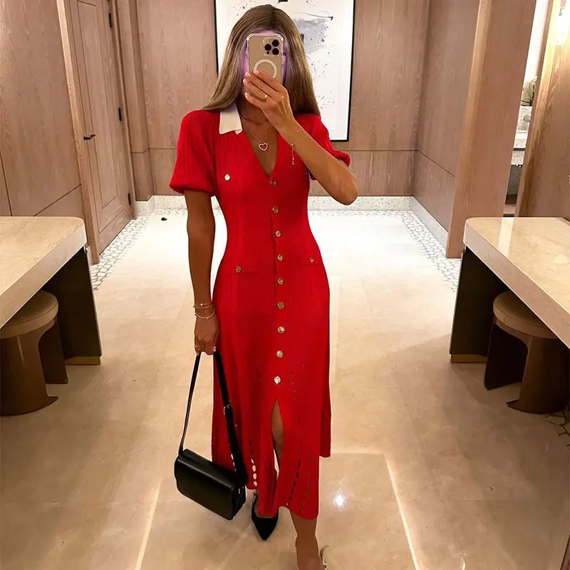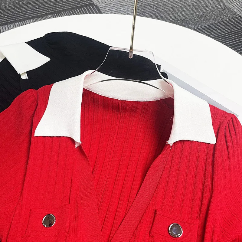 Victoria’s Vogue Single Breasted Knitted Dress For Women Elegant Lapel Short Sleeve Hollow Out Chic Dresses Female Red Black Vestidos