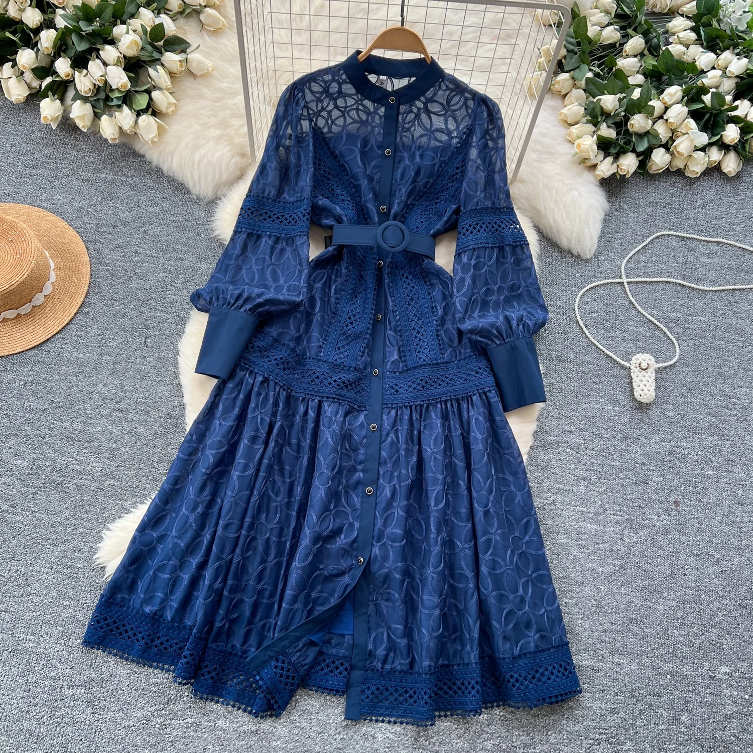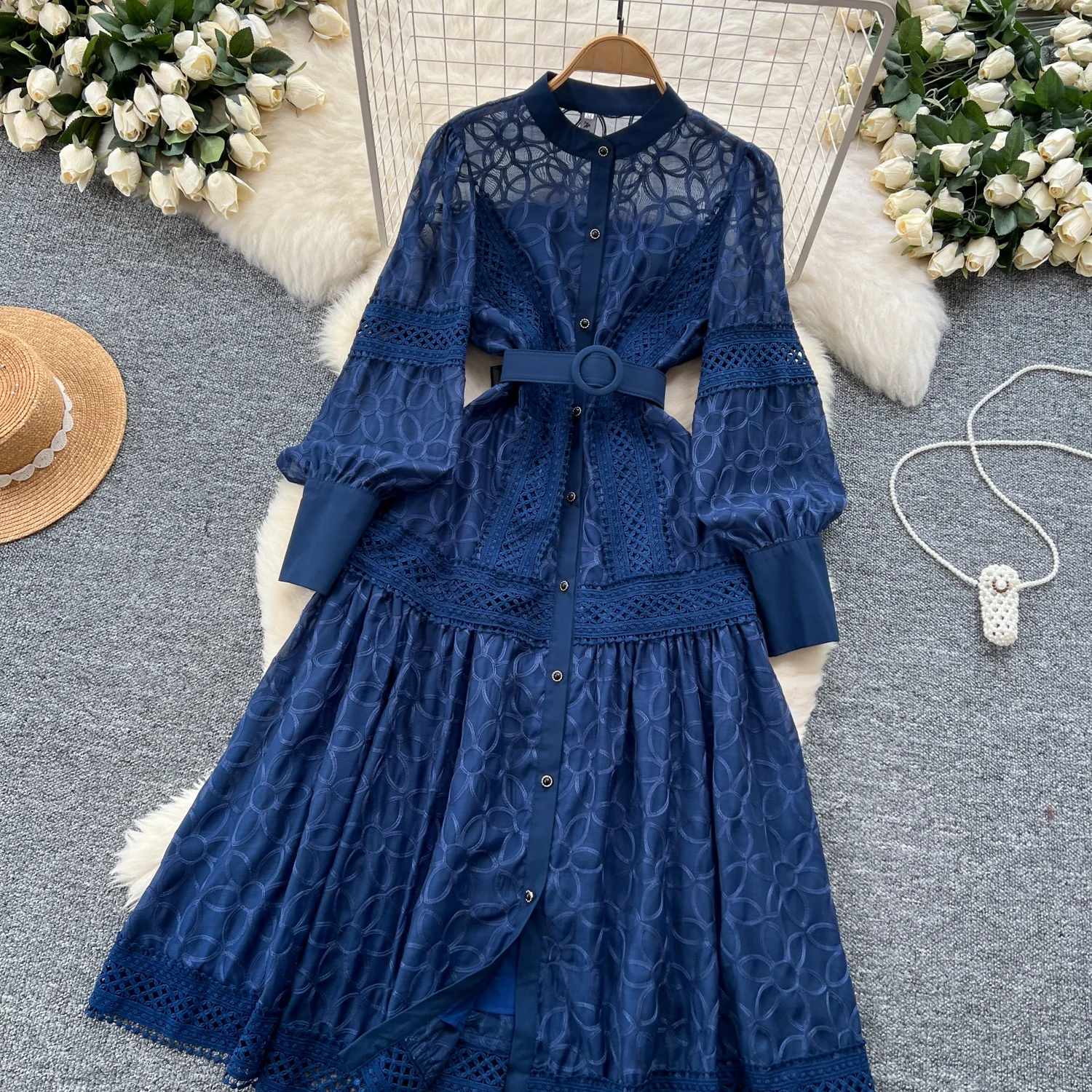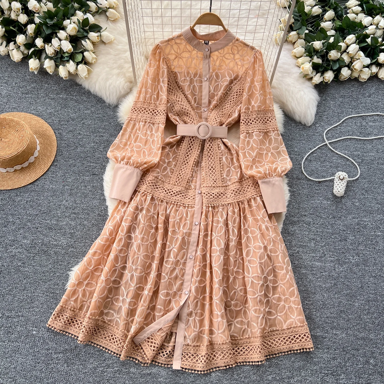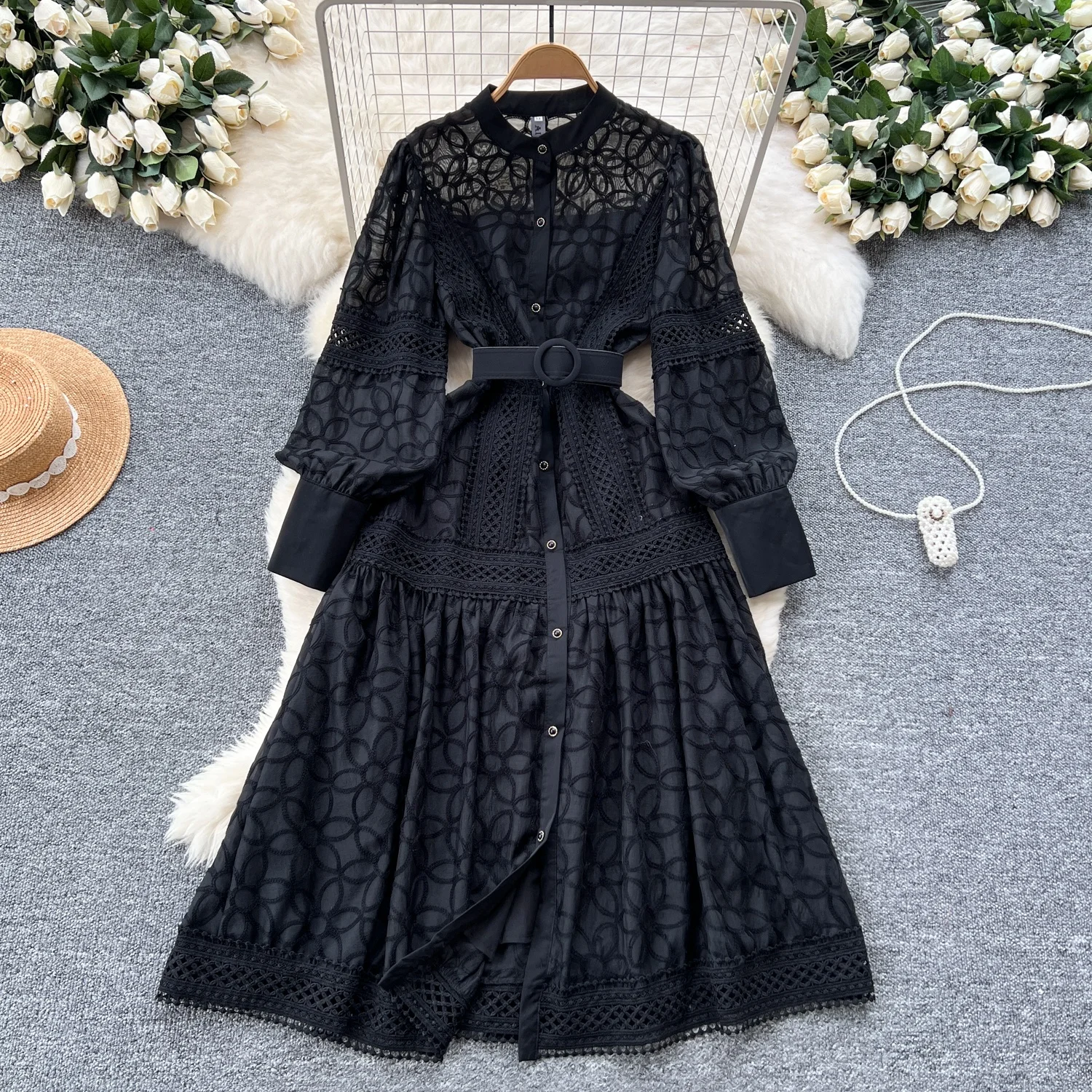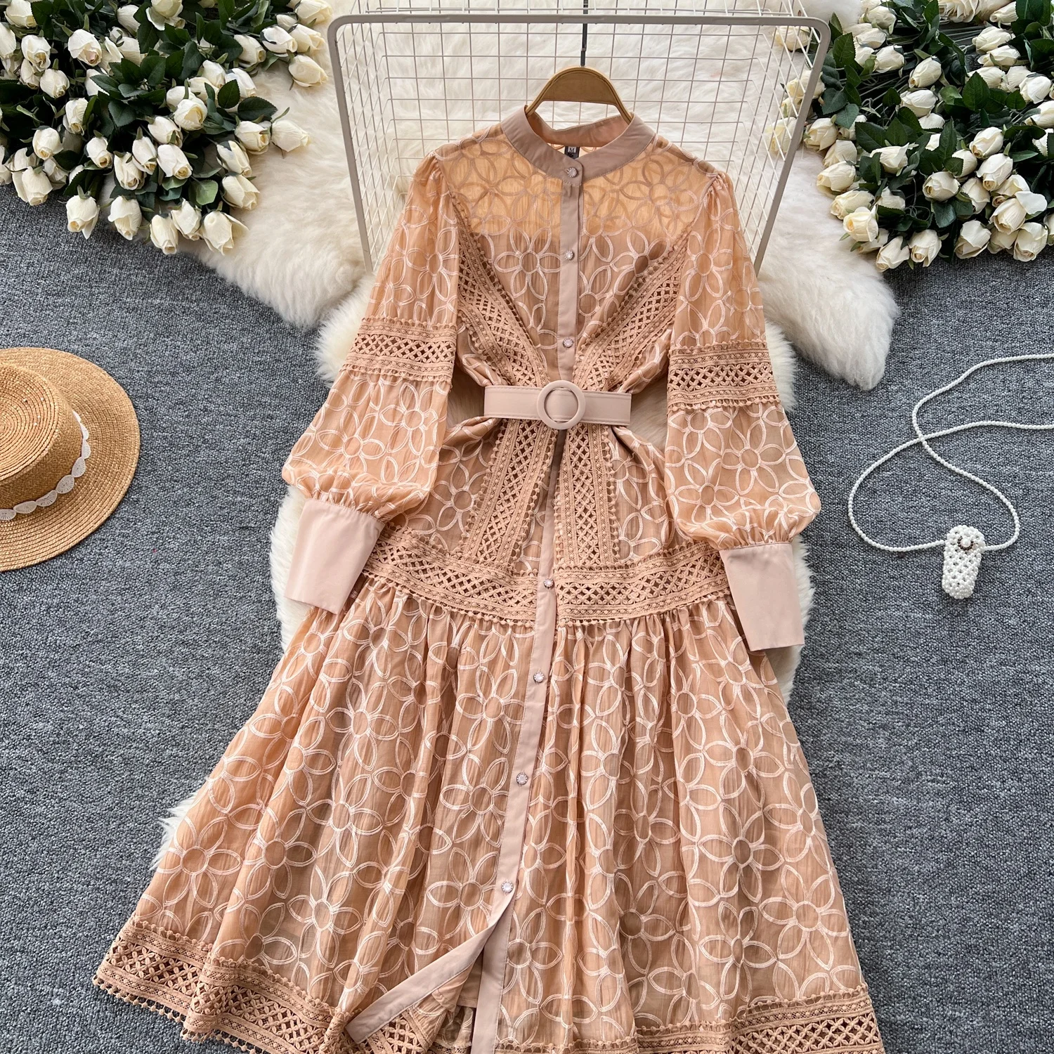 Victoria’s Vogue Court Sle Long Dr Women Winter Vintage Heavy Embroidery Lantern Sve Waist Cinch Single Button Flared A-Line