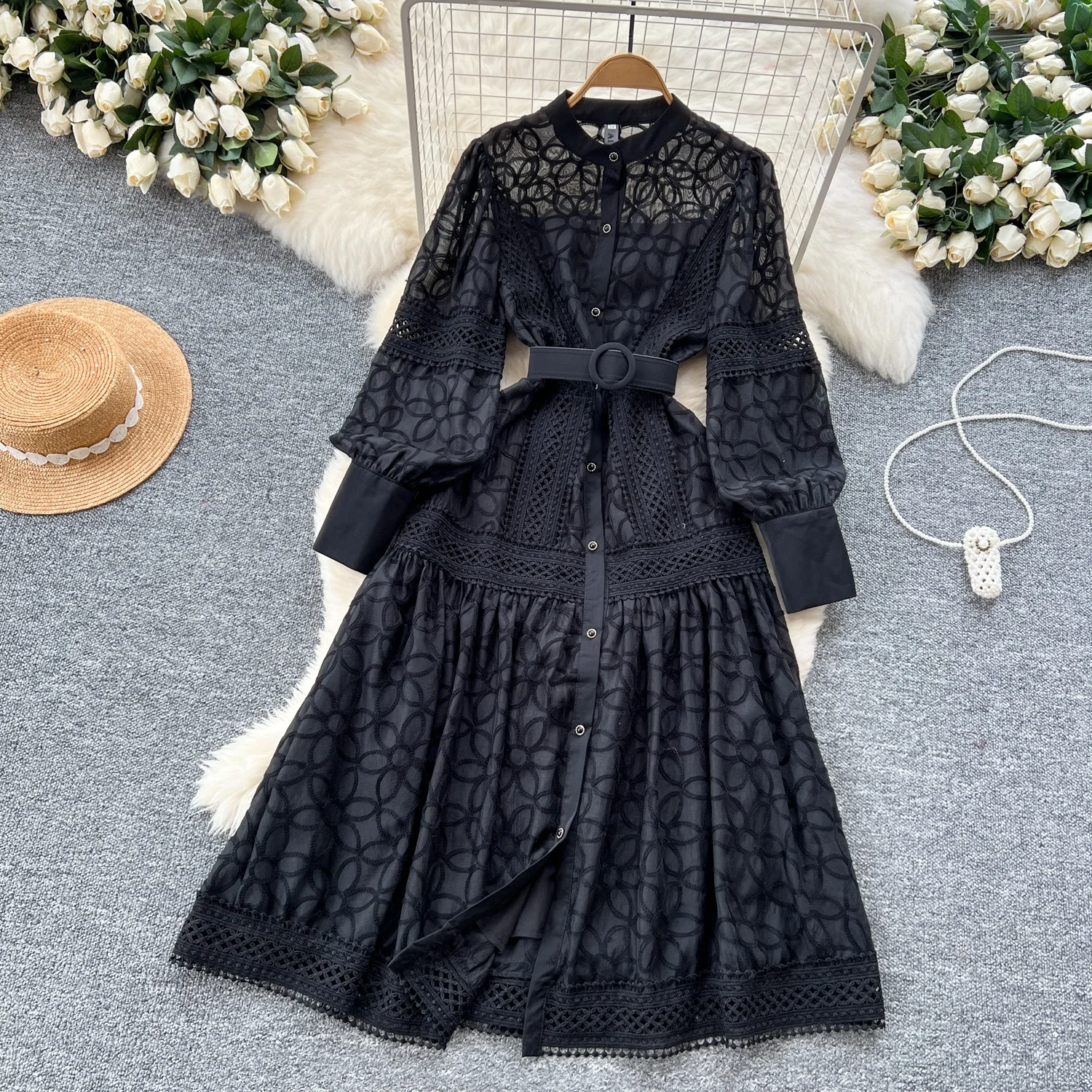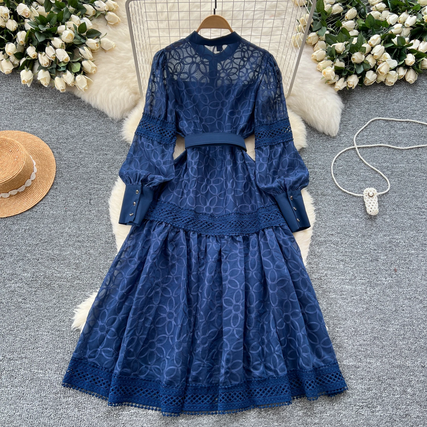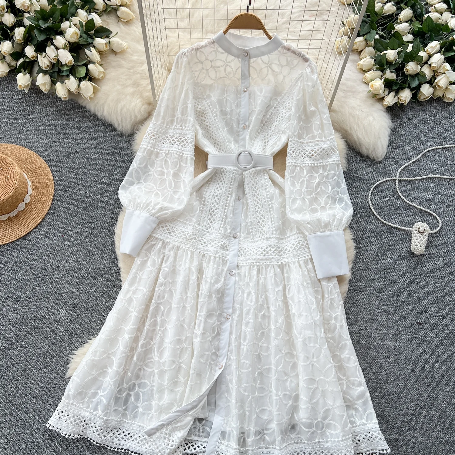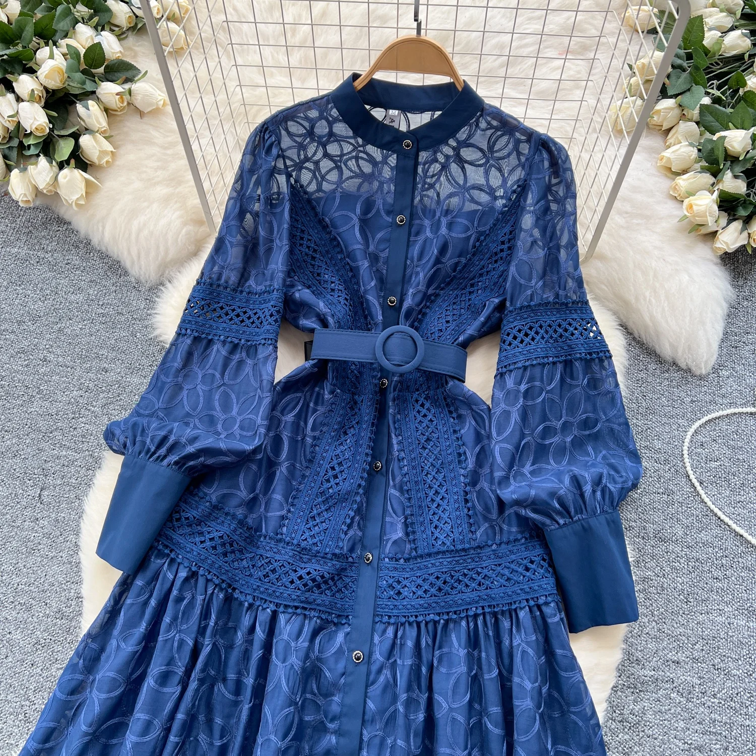 Victoria’s Vogue Court Sle Long Dr Women Winter Vintage Heavy Embroidery Lantern Sve Waist Cinch Single Button Flared A-Line