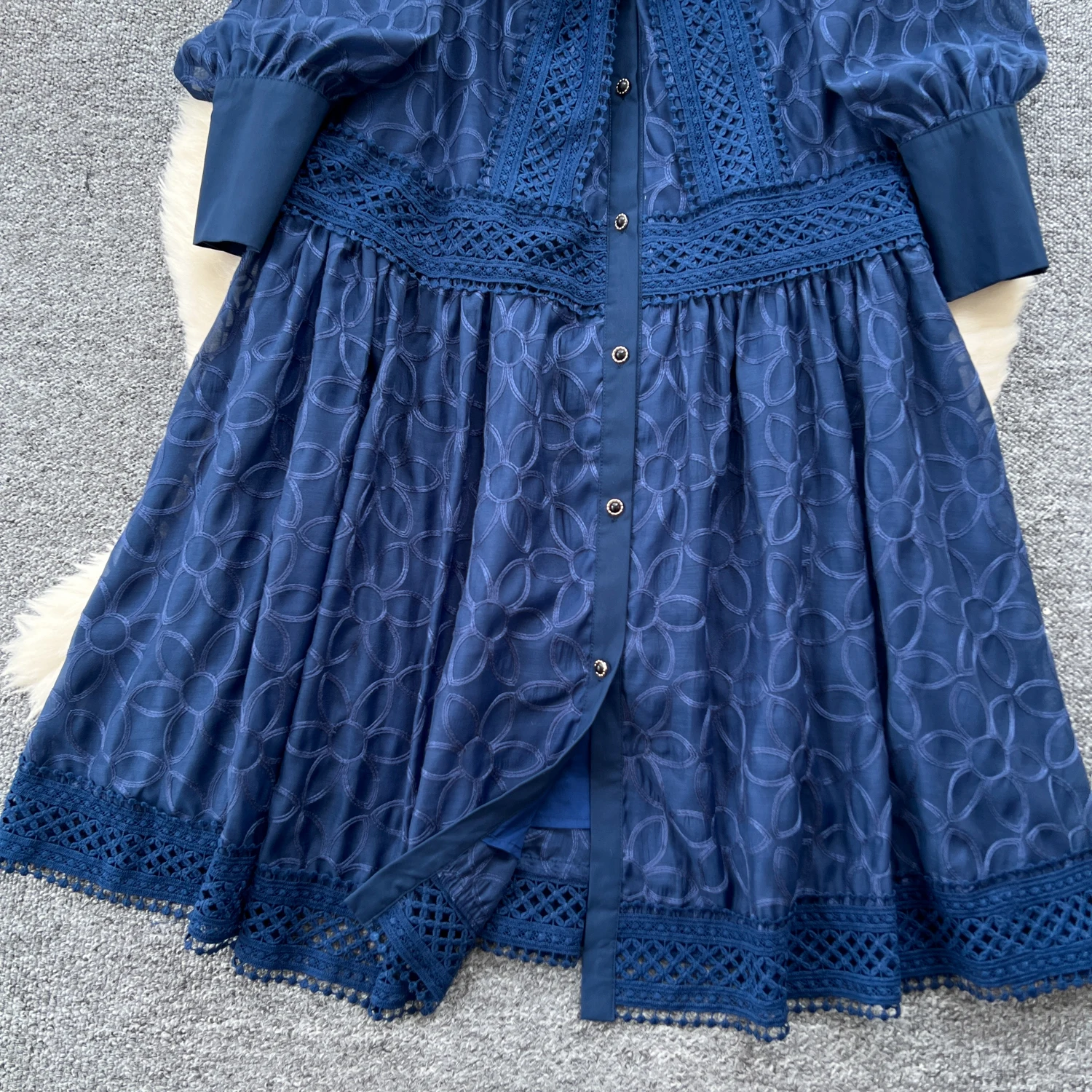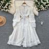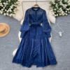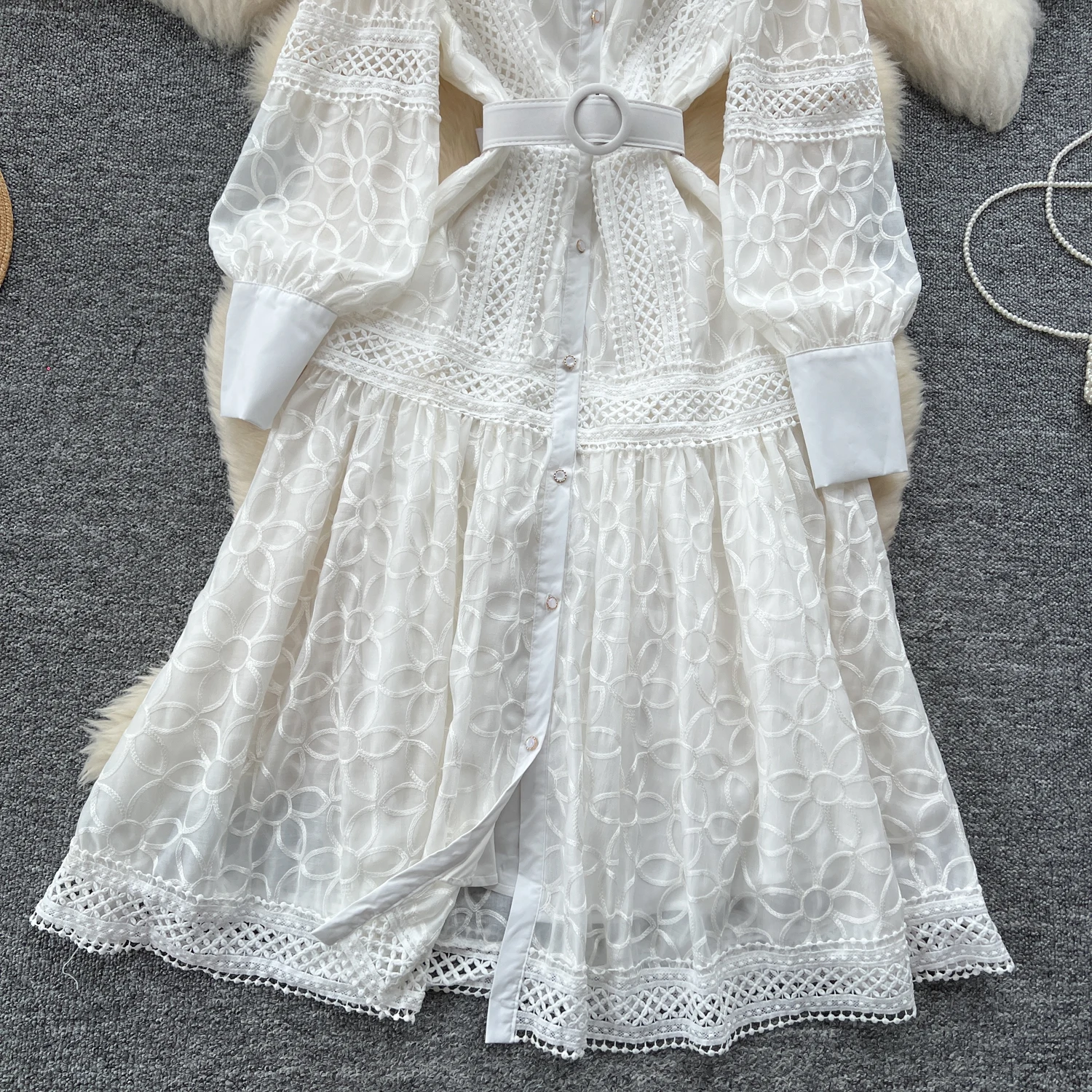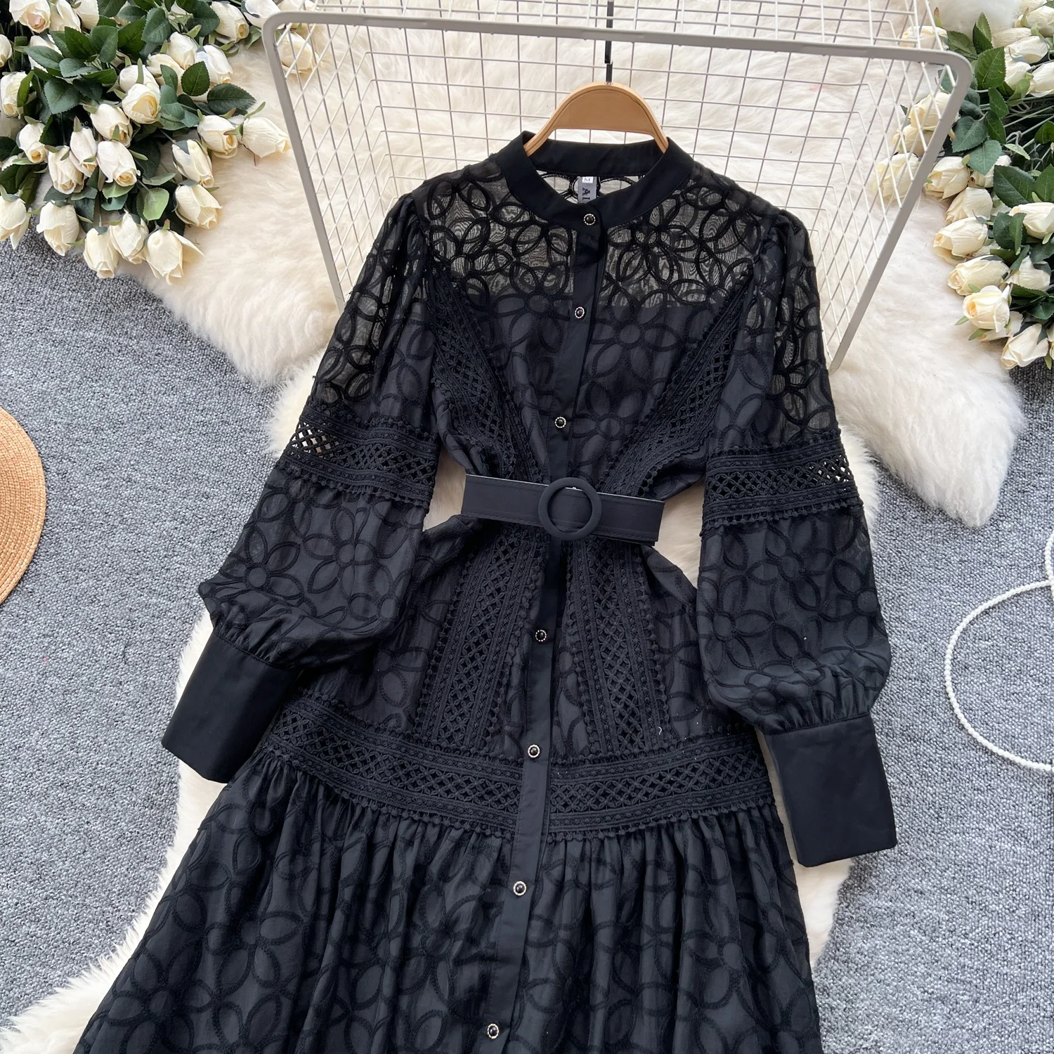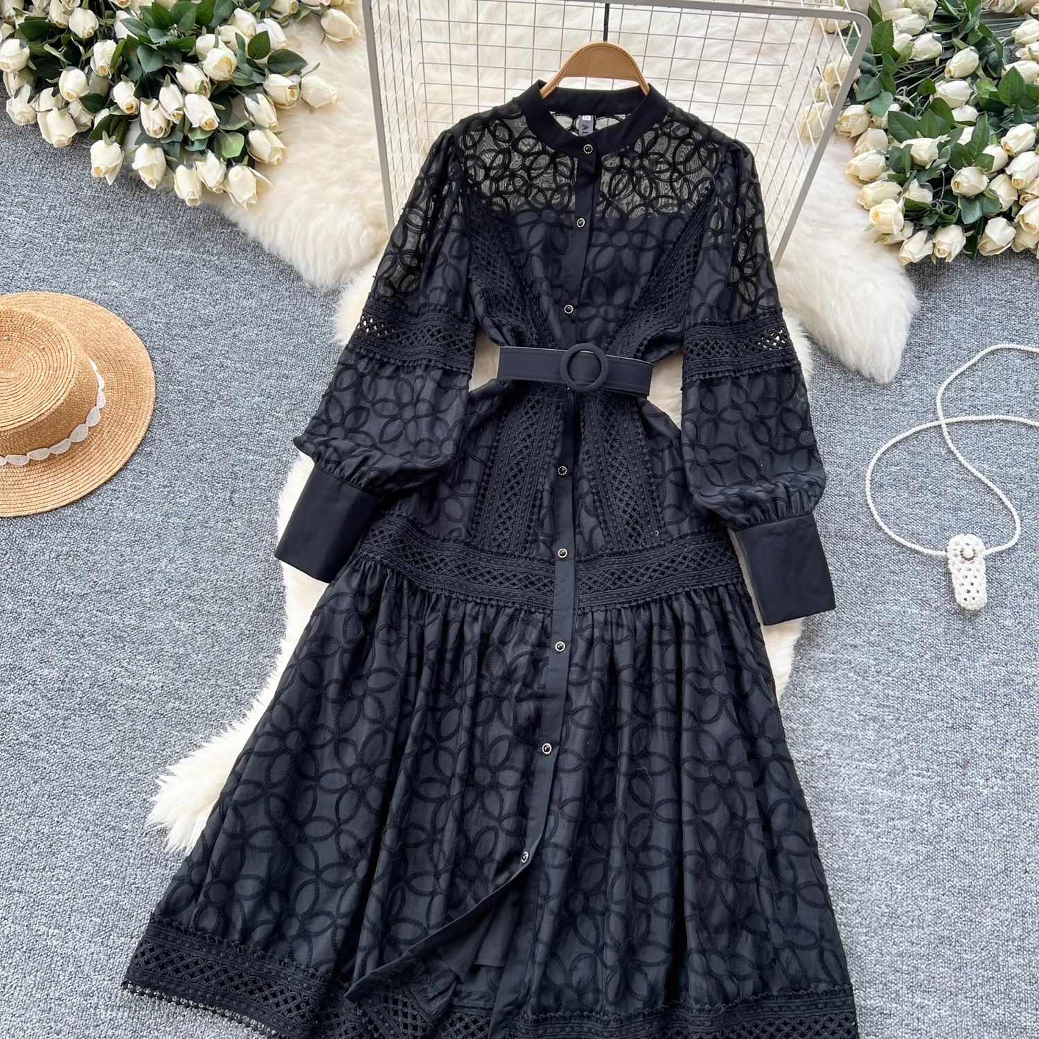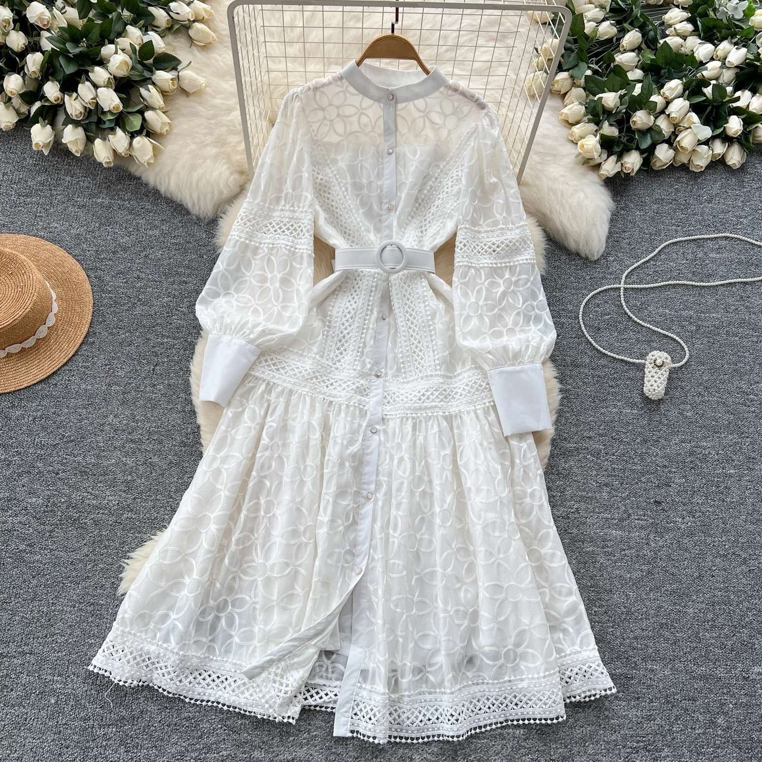 Victoria’s Vogue Court Sle Long Dr Women Winter Vintage Heavy Embroidery Lantern Sve Waist Cinch Single Button Flared A-Line