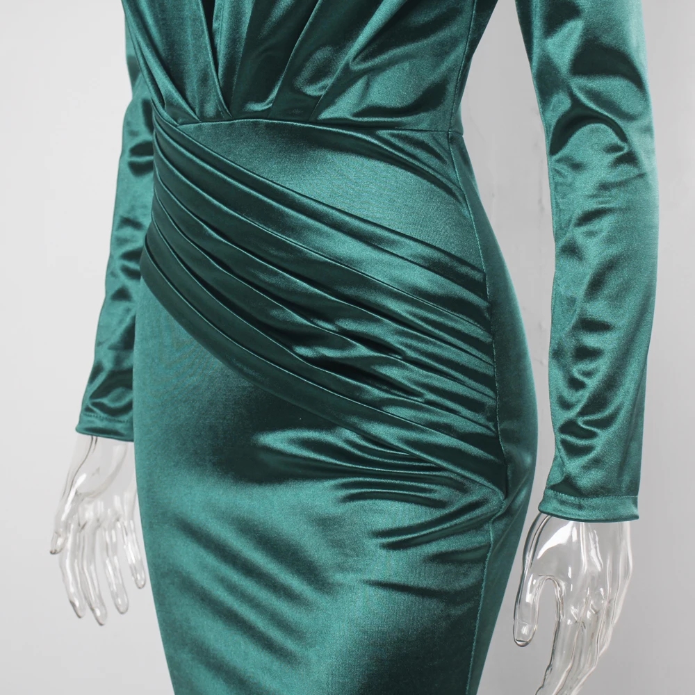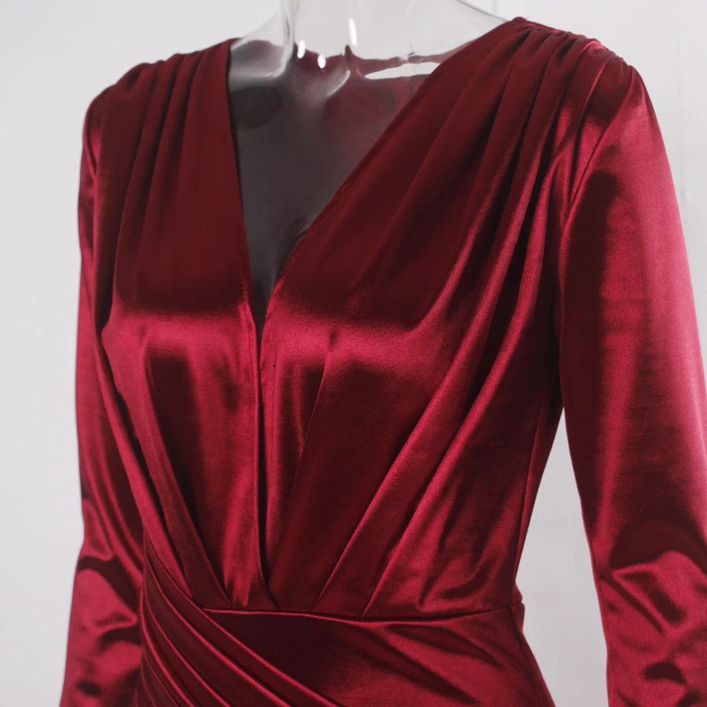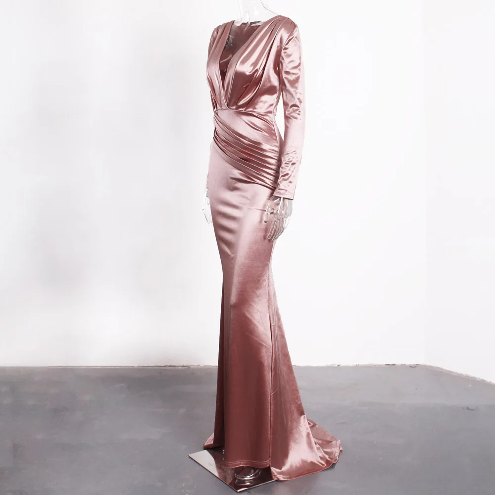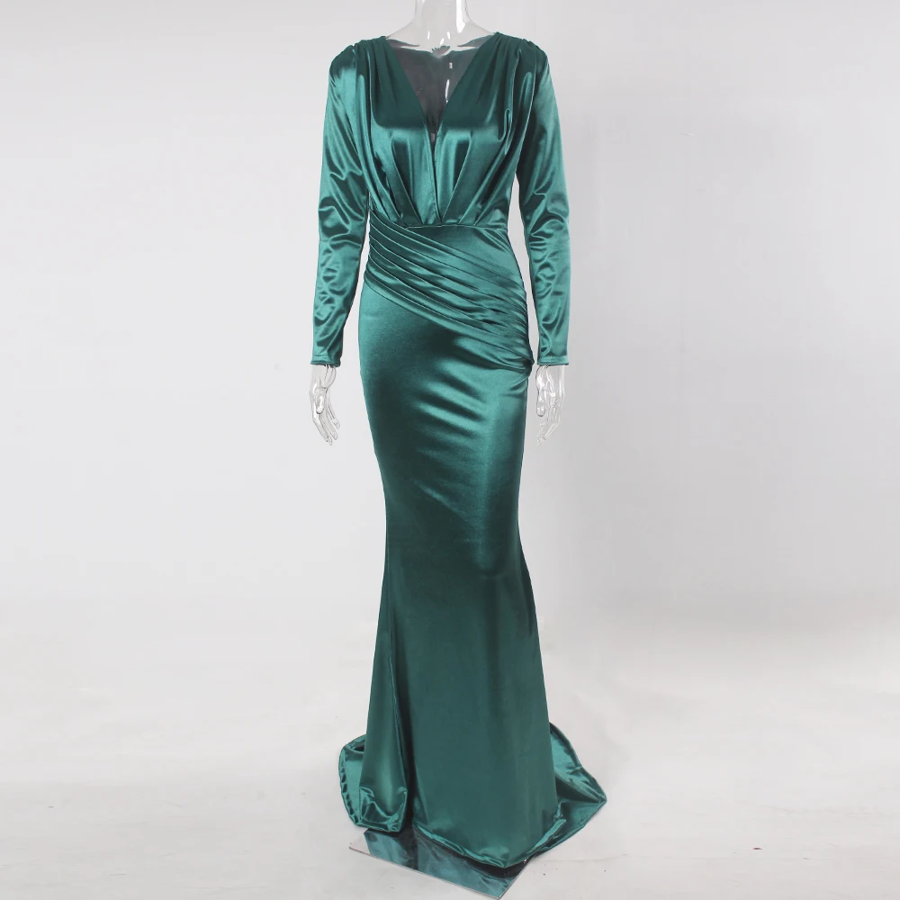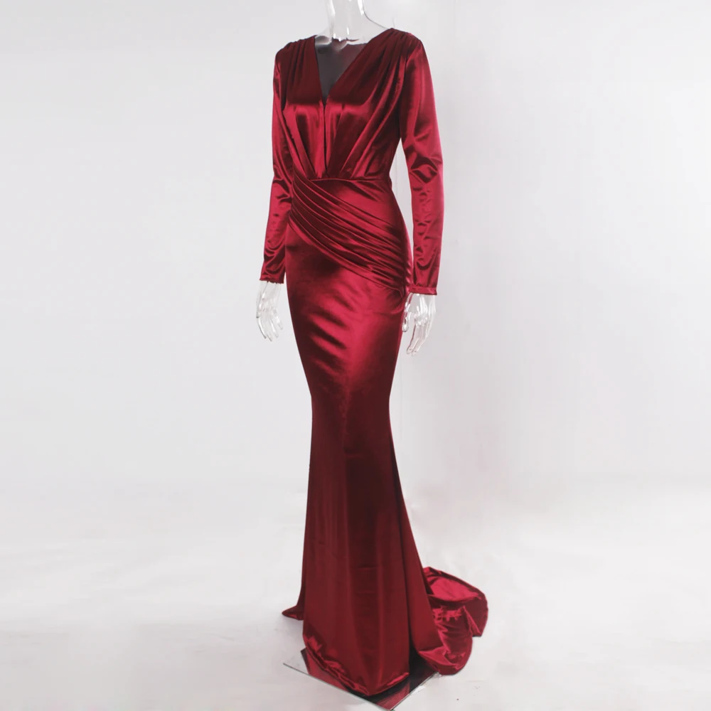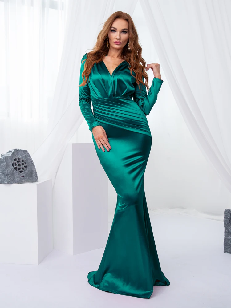 victoria’svogue 2021 Deep V Neck Full Sleeved Pleated Long Evening Party Dress Stretch Satin Floor Length Event Gown Prom Robe