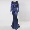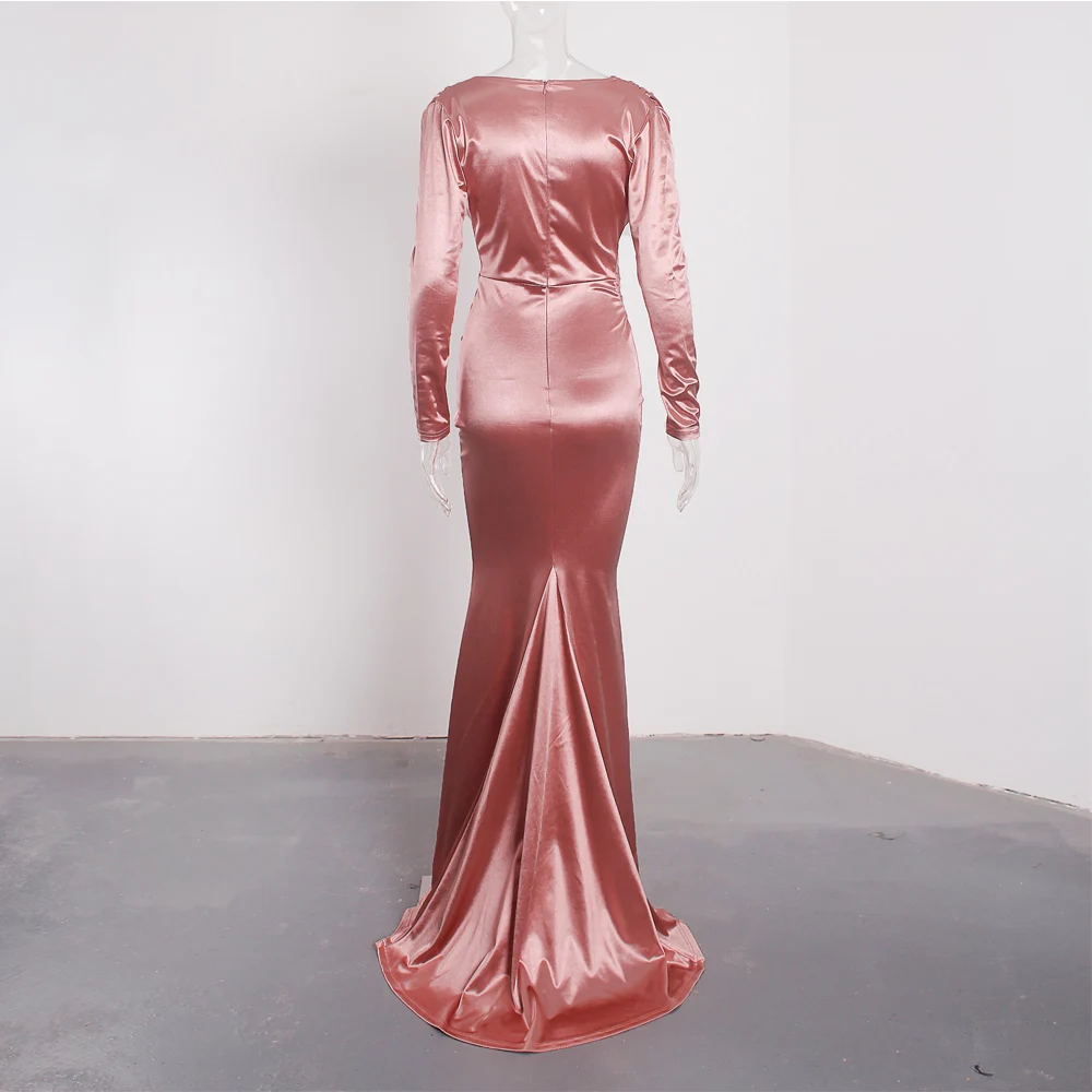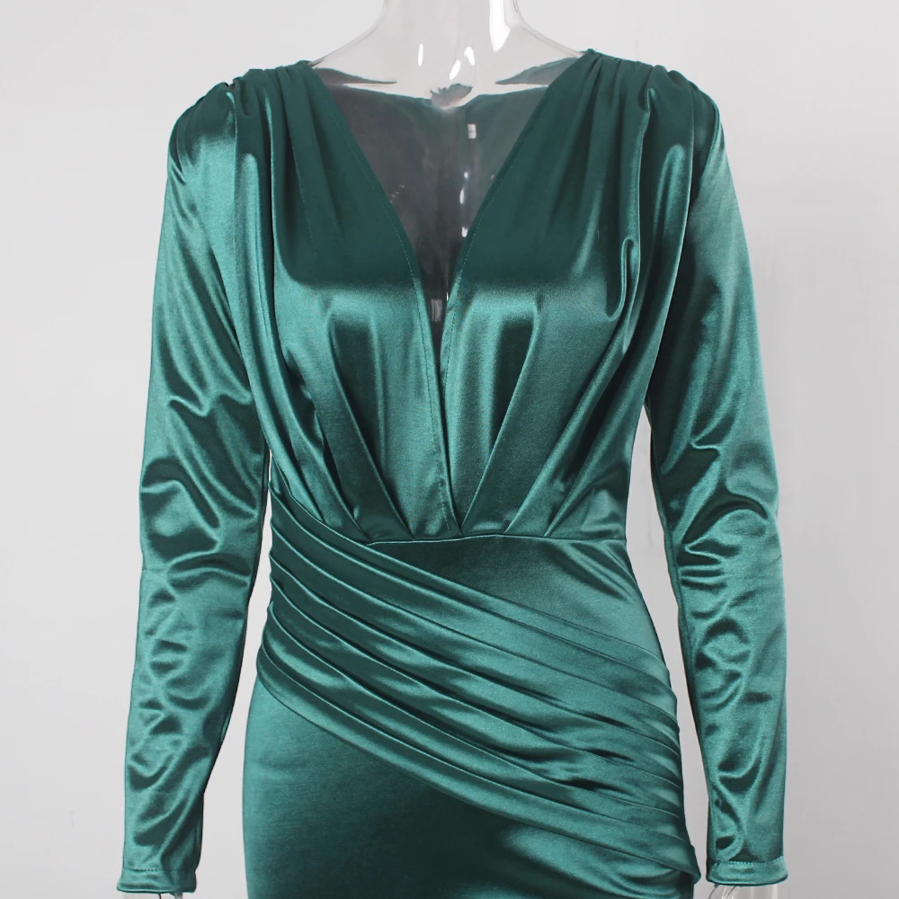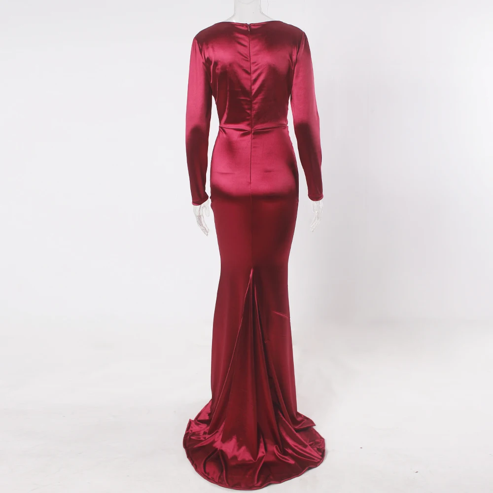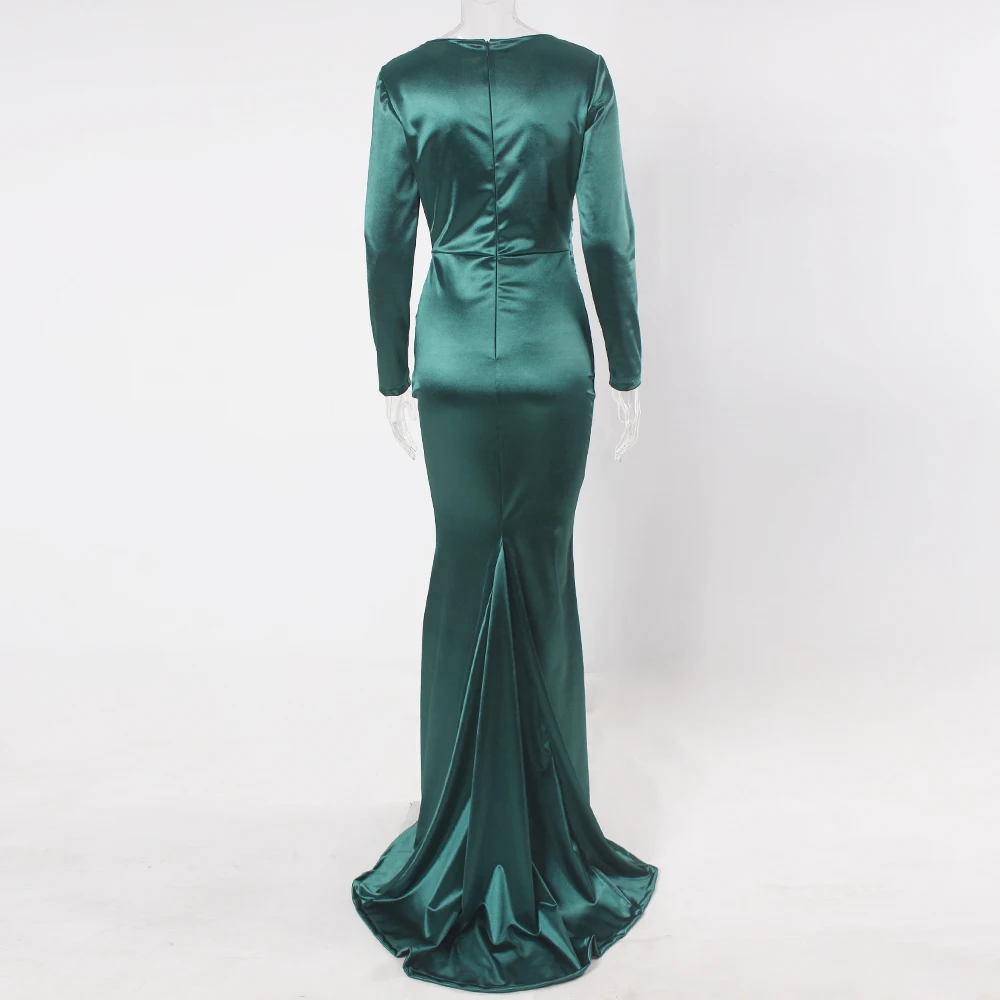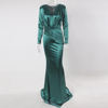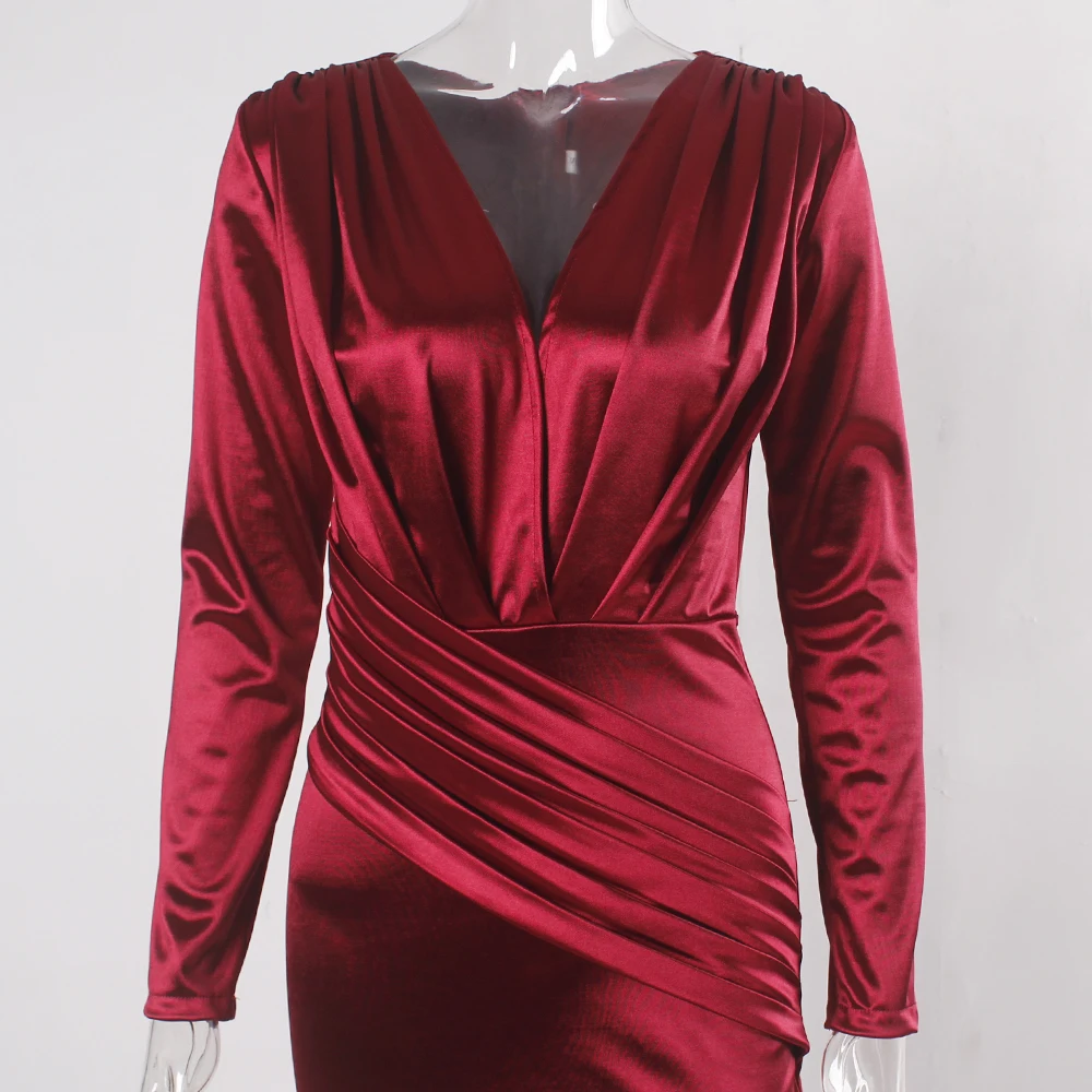 victoria’svogue 2021 Deep V Neck Full Sleeved Pleated Long Evening Party Dress Stretch Satin Floor Length Event Gown Prom Robe
