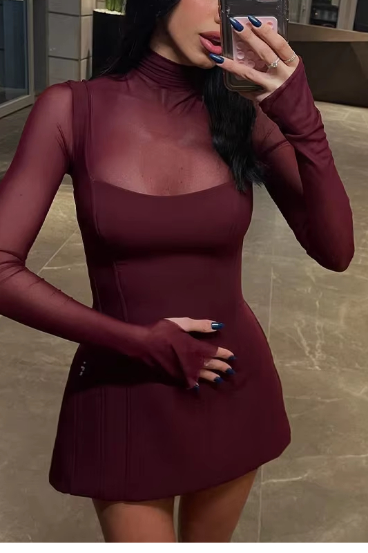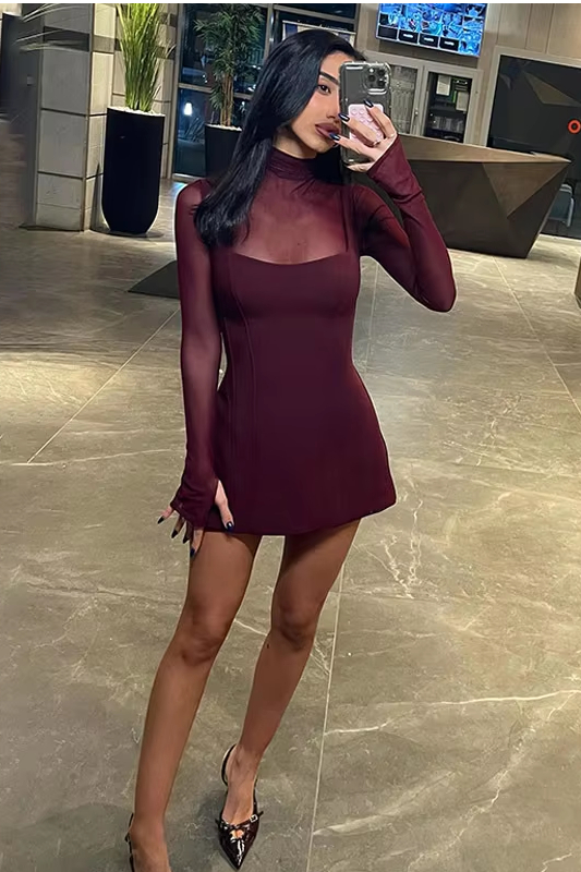 Victoria’s Vogue Mesh Patchwork Mini Dress For Women Party Elegant Evening Vestidos Fashion Lace Long Sleeve Turtleneck Slim Short Dresses