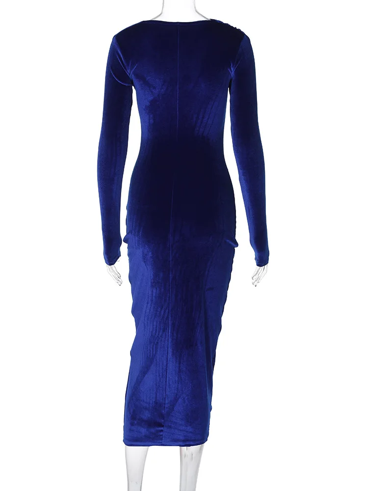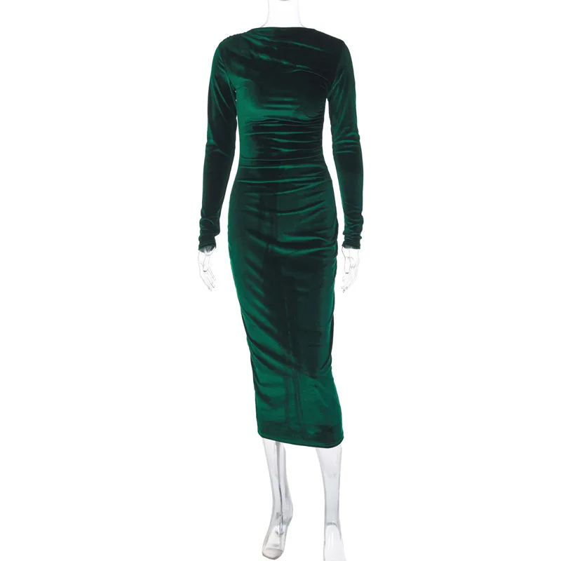 Victoria’s Vogue Spring Summer Velvet Long Sleeve Midi Dress For Women Ruched Long Dress Elegant Party Clothes Evening Green Outfits