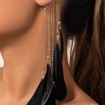 victoria’s vogue 1PC Black/Red Color Feather Tassel Long Earrings Korean Elegant Arc Ear Hanging Fake Cartilage Clip Earrings Jewelry