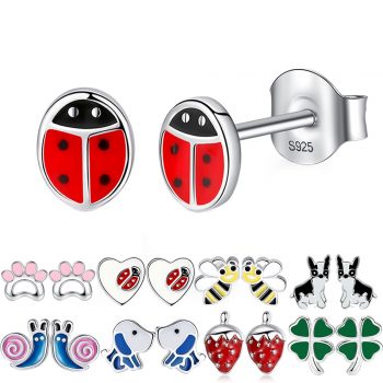 Victoriasweb Fashion 925 Sterling Silver Earrings Children Jewelry Red Enamel Animal Ladybug Small Stud Earrings For Kids Girls Baby