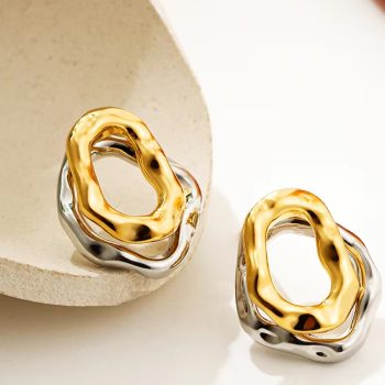 Victoria’s Vogue Stainless Steel Gold Sliver Color Bilayer Stud Earring for Women Irregular Metal Texture Fashion Jewelry Gift